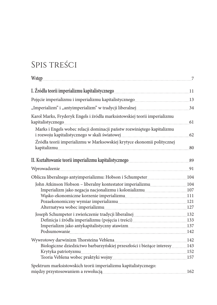 Spis treści Wstęp 7 I. Źródła teorii imperializmu kapitalistycznego 11 Pojęcie imperializmu i imperializmu kapitalistycznego 13 „Imperializm” i „antyimperializm” w tradycji liberalnej 34 Karol Marks, Fryderyk Engels i źródła marksistowskiej teorii imperializmu kapitalistycznego Marks i Engels wobec relacji dominacji państw rozwiniętego kapitalizmu i rozwoju kapitalistycznego w skali światowej Źródła teorii imperializmu w Marksowskiej krytyce ekonomii politycznej kapitalizmu 61 62 80 II. Kształtowanie teorii imperializmu kapitalistycznego 89 Wprowadzenie 91 Oblicza liberalnego antyimperializmu: Hobson i Schumpeter John Atkinson Hobson – liberalny kontestator imperializmu Imperializm jako negacja nacjonalizmu i kolonializmu Wąsko-ekonomiczne korzenie imperializmu Pozaekonomiczny wymiar imperializmu Alternatywa wobec imperializmu Joseph Schumpeter i zwieńczenie tradycji liberalnej Definicja i źródła imperializmu (pojęcia i treści) Imperializm jako antykapitalistyczny atawizm Podsumowanie 104 104 107 111 121 127 132 133 137 142 Wywrotowy darwinizm Thorsteina Veblena Biologiczne dziedzictwo barbarzyńskiej przeszłości i bieżące interesy Krytyka patriotyzmu Teoria Veblena wobec praktyki wojny 142 143 152 157 Spektrum marksistowskich teorii imperializmu kapitalistycznego: między przystosowaniem a rewolucją 162 4 Spis treści Rudolf Hilferding: imperializm jako pochodna dominacji kapitału finansowego Charakterystyka kapitału finansowego Poglądy Hilferdinga po 1914 r. Krytycy Hilferdinga Karol Kautsky: ku teorii ultraimperializmu Zwrot polityczny i teoretyczny 1914 r. Synteza i antycypacja tradycji intelektualnych Kwestia kolonialna Problem teorii i praktyki 162 163 175 180 185 186 189 195 205 Róża Luksemburg i jej krytycy: akumulacja kapitału i imperializm Imperializm i popytowa bariera akumulacji kapitału Oblicza krytyki Akumulacji kapitału Włodzimierz Lenin: polityczna moc teorii imperializmu Rewolucja przeciw wojnie Nierównomierność rozwoju kapitalizmu i ruchy narodowowyzwoleńcze Walka z wielkoruskim szowinizmem Teoria arystokracji robotniczej Imperializm jako najnowszy etap kapitalizmu Nikołaj Bucharin: imperializm jako zderzenie kapitalizmów państwowych w gospodarce światowej Tendencja ku umiędzynarodowieniu gospodarki Tendencja ku kapitalizmowi państwowemu Meandry wymiaru politycznego teorii Bucharina 211 218 234 254 254 264 267 279 282 Fritz Sternberg – imperializm w otoczeniu zewnętrznym Kapitalizm i niekapitalistyczne otoczenie Ku nowej epoce imperializmu i kryzysowi permanentnemu Teoria Sternberga po 1945 r. Henryk Grossman: imperializm, krach i tendencje kryzysowe kapitalizmu Spadająca stopa zysku i perspektywa krachu Dążenie do krachu i imperializm Podsumowanie Jewgieni Przeobrażeński i „zakrzepica” systemu Obraz stagnacji kapitalizmu Ciężar nierentownych części systemu i rywalizacja imperialistyczna Notka o Lwie Trockim i rozwoju nierównomiernym i kombinowanym 321 321 335 341 346 347 357 367 368 368 370 375 Bibliografia 296 297 306 315 381