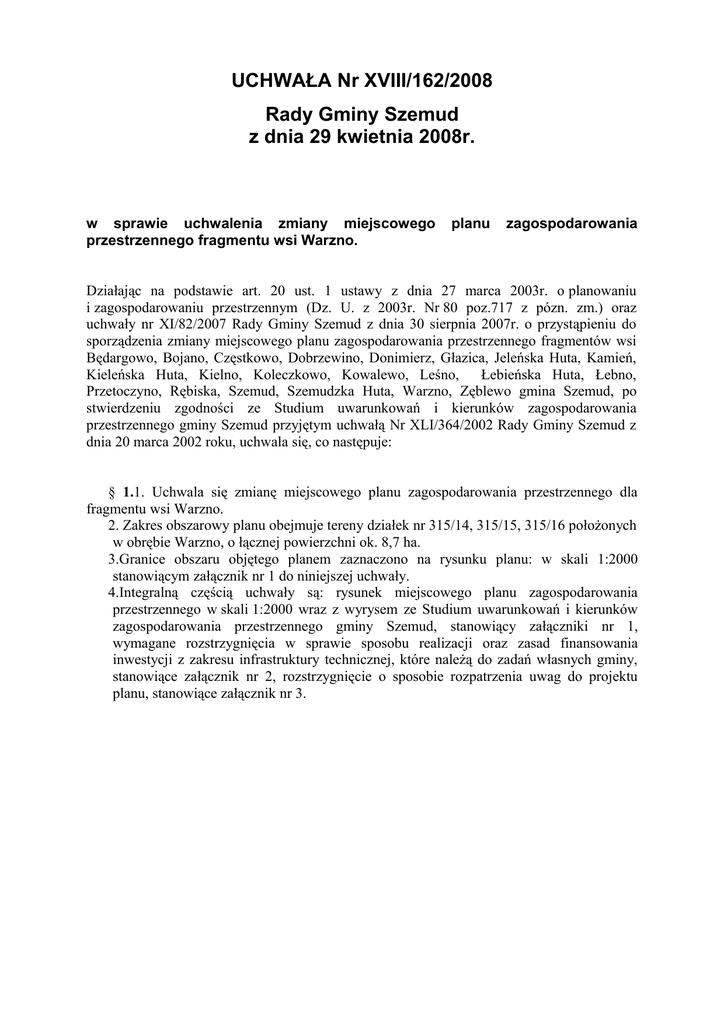 UCHWAŁA Nr XVIII/162/2008 Rady Gminy Szemud z dnia 29 kwietnia 2008r. w sprawie uchwalenia zmiany miejscowego przestrzennego fragmentu wsi Warzno. planu zagospodarowania Działając na podstawie art. 20 ust. 1 ustawy z dnia 27 marca 2003r. o planowaniu i zagospodarowaniu przestrzennym (Dz. U. z 2003r. Nr 80 poz.717 z pózn. zm.) oraz uchwały nr XI/82/2007 Rady Gminy Szemud z dnia 30 sierpnia 2007r. o przystąpieniu do sporządzenia zmiany miejscowego planu zagospodarowania przestrzennego fragmentów wsi Będargowo, Bojano, Częstkowo, Dobrzewino, Donimierz, Głazica, Jeleńska Huta, Kamień, Kieleńska Huta, Kielno, Koleczkowo, Kowalewo, Leśno, Łebieńska Huta, Łebno, Przetoczyno, Rębiska, Szemud, Szemudzka Huta, Warzno, Zęblewo gmina Szemud, po stwierdzeniu zgodności ze Studium uwarunkowań i kierunków zagospodarowania przestrzennego gminy Szemud przyjętym uchwałą Nr XLI/364/2002 Rady Gminy Szemud z dnia 20 marca 2002 roku, uchwala się, co następuje: § 1.1. Uchwala się zmianę miejscowego planu zagospodarowania przestrzennego dla fragmentu wsi Warzno. 2. Zakres obszarowy planu obejmuje tereny działek nr 315/14, 315/15, 315/16 położonych w obrębie Warzno, o łącznej powierzchni ok. 8,7 ha. 3.Granice obszaru objętego planem zaznaczono na rysunku planu: w skali 1:2000 stanowiącym załącznik nr 1 do niniejszej uchwały. 4.Integralną częścią uchwały są: rysunek miejscowego planu zagospodarowania przestrzennego w skali 1:2000 wraz z wyrysem ze Studium uwarunkowań i kierunków zagospodarowania przestrzennego gminy Szemud, stanowiący załączniki nr 1, wymagane rozstrzygnięcia w sprawie sposobu realizacji oraz zasad finansowania inwestycji z zakresu infrastruktury technicznej, które należą do zadań własnych gminy, stanowiące załącznik nr 2, rozstrzygnięcie o sposobie rozpatrzenia uwag do projektu planu, stanowiące załącznik nr 3. Rozdział 1 Zasady konstrukcji planu § 2.1. Tekst planu, stanowiący treść niniejszej uchwały, zawiera się w 3 kolejnych rozdziałach: ustalenia ogólne dotyczące całego obszaru objętego planem, ustalenia szczegółowe w formie kart terenów oraz postanowienia końcowe. 2.Przez teren rozumie się teren wydzielony liniami rozgraniczającymi o jednakowym przeznaczeniu lub jednakowych zasadach zagospodarowania. 3.Teren oznaczono symbolem cyfrowo- literowym, który stanowi tzw. symbol terenu. Pierwsza liczba oznacza numer terenu, symbole literowe oznaczają przeznaczenie terenu według § 3 ust. 1 pkt 1. 4. Wyjaśnienie pojęć użytych w niniejszym planie: 1) minimalna powierzchnia wydzielanej działki budowlanej – wielkość powierzchni nowowydzielanej działki budowlanej dla budownictwa mieszkaniowego ustalona w par. 4 w kartach terenów, wielkość ta nie dotyczy działek pod urządzenia infrastruktury technicznej, parkingi, miejsca postojowe, drogi oraz ciągi pieszo-jezdne i przejścia piesze. Dopuszcza się zmniejszenie powierzchni nowowydzielanej działki budowlanej o maksymalnie 5% w stosunku do wielkości określonej w karcie terenu; 2) nieprzekraczalne linie zabudowy - linie, których nie należy przekraczać przy lokalizacji nowych budynków oraz rozbudowie istniejących z wyłączeniem garaży, które mogą być lokalizowane bezpośrednio przy granicy działki od strony ulicy lub dojazdu wewnętrznego. Dopuszcza się wysunięcie przed linię zabudowy części obiektu (np.: w postaci ganku, wykusza lub innej) o kubaturze nie większej niż 21 m3, jednak wysunięcie to nie może być większe niż 2 m. Linie zabudowy nie dotyczą okapów i gzymsów oraz balkonów i loggi wysuniętych przed linię nie więcej niż 1,5 m; 3) powierzchnia biologicznie czynna – grunt rodzimy pokryty roślinnością oraz wodą powierzchniową na działce budowlanej, a także 50% sumy nawierzchni tarasów, stropodachów i parkingów, urządzonych jako stałe trawniki lub kwietniki na podłożu zapewniającym ich naturalną wegetację, o powierzchni nie mniejszej niż 10 m2; 4) samochody ciężarowe - należy przez to rozumieć pojazdy samochodowe o masie własnej przekraczającej 3,5 t; 5) stawka procentowa – stawka służąca ustaleniu jednorazowej opłaty, o której mowa w art. 36 ust. 4 ustawy z dnia 27 marca 2003r. o planowaniu i zagospodarowaniu przestrzennym; 6) usługi nieuciążliwe - należy przez to rozumieć usługi: handlu detalicznego, informacji, nauki i oświaty, kultury i rozrywki, zdrowia i wypoczynku, rekreacji i sportu, rękodzieło artystyczne, salony spa oraz kosmetyczne i fryzjerskie, żłobki, przedszkola oraz inne usługi o analogicznym do powyższych charakterze i stopniu uciążliwości, kótrych funkcjonowanie: a) nie powoduje przekroczenia żadnego z parametrów dopuszczalnego dla zabudowy mieszkalnej jednorodzinnej, poziomu szkodliwych lub uciążliwych oddziaływań na środowisko poza zajmowanym obiektem, b) nie jest źródłem uciążliwych lub szkodliwy ch odpadów, nie powoduje nieodwracalnych zmian środowiska przyrodniczego w obrębie zajmowanej działki, c) ani w żaden inny oczywisty sposób nie pogarsza warunków użytkowania terenów sąsiadujących np. przez emisję nieprzyjemnych zapachów, hałasów, dymów, składowanie nieestetycznych odpadów na otwartej przestrzeni. Wyklucza się wszelkie inne usługi poza określonymi powyżej, w szczególności usługi związane z wytwarzaniem dóbr materialnych i ich konfekcjonowaniem oraz warsztaty naprawcze. 7) ustawienie budynków w stosunku do ulicy – usytuowanie budynku na działce od strony ulicy publicznej lub drogi wewnętrznej określone przez położenie głównej kalenicy budynku w stosunku do ulicy np. prostopadłe lub równoległe; jeżeli ustalenia szczegółowe nie stanowią inaczej, dla budynków na działkach narożnych położenie kalenicy głównej należy dostosować do jednej z ulic lub dojazdów wewnętrznych, przy których zlokalizowana jest działka; z uwagi na uwarunkowania terenowe oraz kształt i parametry działki 