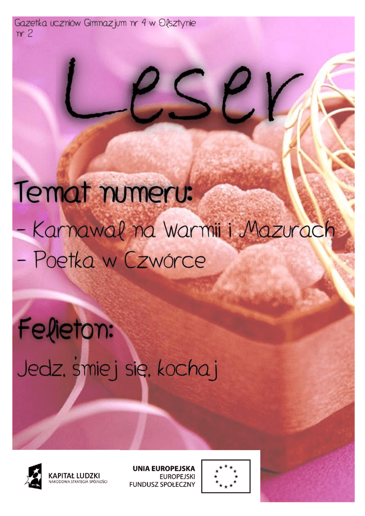 1 Piszą dla Was Listwon Marcin IIIa Majewska Kinga IIb Mikołajek Bartosz IIa Waszkiewicz Aleksandra IIb Zielnik Anna IIIa Żukowski Konrad IIb Bohdzian Kamila IIIb Czaplińska Anna IIIb Gryc Marta IIIb Kluczyk Małgorzata IIIb Konopka Wiktoria IIIb Kurowski Piotr IIIb Leżanko Monika IIIb Wichowska Kamila IIIb Banach Malwina IIa Brodowska Aleksandra IIa Danielczuk Kamila IIb Dobosz Michał IIb Gugołek Małgorzata IIa Korejwo Marta IIa Kozakiewicz Kornel IIa Kraciuk Katarzyna IIa Rudzka Katarzyna IIb Siembida Joanna IIb Sitnik Patrycja IIb Smolińska Natalia IIa Sobieraj Monika IIa Srokosz Agnieszka IIa Kubacka Alicja IIb Kreft Natalia IIa Filipek Szymon IIb Milewicz Magda IIa Nowak Patrycja IIa Oleszczak Gabriela IIb Parniewicz Beata IIb Raszkiewicz Mateusz IIb Zespołem redakcyjnym opiekuje się pani Małgorzata Chojnowska. Kilka słów na początek Cześć! Postaram się wprowadzić Was trochę w kolejny numer naszej gazetki szkolnej. Dowiecie się, co interesującego możecie przeczytać w środku. Jak za każdym razem, każdy będzie mógł znaleźć coś odpowiedniego dla siebie. Mamy coś dla fanów muzyki oraz kina. Dowiedzieliśmy się również wszystkiego na temat najważniejszych wydarzeń wartych uwagi w pierwszych miesiącach roku. Osobom posiadającym pupile pomożemy w radzeniu sobie z wszędobylską, szczególnie w czasie linienia, sierścią. Każdy zmarźluch dowie się, jak może ogrzać się gorącym kakao i jak zaspokoić swój żołądek w chłodne, szare dni. Obfite kalendarium nie pozwoli Wam zapomnieć o najważniejszych wydarzeniach minionych dekad, a nawet wieków. Jesteśmy też na bieżąco z informacjami na temat konkursów kuratoryjnych oraz wydarzeń sportowych w szkole. Rubryka modowa podpowie, jak być stylowym na stoku i poza nim. A ponadto - walentynki! Pomożemy singlom nie zwariować w święto zakochanych, a szczypta poezji i prozy wprowadzi zainteresowanych w tajemniczy klimat. Całość dopełniają wywiady, które można przeczytać z szerokim uśmiechem na ustach, dzięki humorowi zespołu Fizol Team oraz dobremu sercu wolontariuszki XXI. Finału WOŚP. Zasiadajcie więc wygodnie i czytajcie, a na pewno nie pożałujecie. Redaktor naczelny, Aleksandra Waszkiewicz 2 TEMAT NUMERU Małgorzata Kluczyk, Anna Czaplińska KARNAWAŁ NA WARMII I MAZURACH Mamy rozmawiać o karnawale, czyli czymś radosnym. A tymczasem w tłumaczeniu z języka łacińskiego oznacza on dosłownie "pożegnanie z mięsem". Średnia zachęta do zabawy. — Ale nazwa "pożegnanie z mięsem" nie jest przypadkowa, bo zaraz po karnawale zaczyna się przecież Wielki Post. W dawnych czasach był on rzeczywiście wielki, ponieważ w środy i piątki poszczono o chlebie i wodzie. Dosłownie. A w pozostałe dni tygodnia nie jadano mięsa. ” — opowiada o karnawałowych zwyczajach Elżbieta Kaczmarek, etnograf z Muzeum Warmii i Mazur w Olsztynie. Dawniej w Polsce wieczór sylwestrowy bardzo przypominał wieczerzę wigilijną. Siadano wspólnie do uroczystej kolacji, tym razem zawierającej już mięsne potrawy. Składano sobie życzenia na Nowy Rok i często obdarowywano się specjalnie wypiekanymi na ten dzień małymi bułeczkami, tak zwanymi „szczodrakami”. Na Warmii i Mazurach pieczono „byśki” – bułeczki w kształcie zwierząt i ptaków. Zwyczaj tych wypieków i składania sobie życzeń był praktykowany od Wigilii do święta Trzech Króli. Przed wieloma laty Polacy witali się w Nowy Rok słowami : „Bóg Cię stykaj!”, co oznaczało polecenie rozmówcy Boskiej opiece na następne 12 miesięcy. Na bale karnawałowe mężczyźni mogli wchodzić bez masek, natomiast kobiety musiały zawsze być w przebraniu. Na Nowy Rok były bardzo popularne wszelkie wróżby, mogące przepowiedzieć, co nas czeka w nadchodzących miesiącach. Chętnie lano całe „litry” wosku, żeby zgadnąć, kto w Nowym Roku się ożeni, a kto wyjdzie za mąż. W sylwestra wróżono także z lanego ołowiu, cyny lub wosku bądź też przez wrzucenie ziaren owsa czy węgla do miski z wodą. Natomiast młodzieńcy lubowali się w psotach, na przykład stawiając wozy na dachach stodół. Przez pierwsze 12 dni stycznia bacznie obserwowano pogodę, wierząc, że będzie ona zapowiedzią pogody w ciągu następnych 12 miesięcy. Gdy 1 stycznia był mroźny i pogodny, ufano, że cały rok będzie pomyślny i dostatni. W Nowy Rok nie sprzątano również mieszkania, żeby nie wymieść z domu szczęścia, które kryło się po kątach. Samotne kobiety wybierające się tego dnia na kolację czy też bal powinny nasypać sobie do butów trochę maku, żeby w Nowym Roku mieć mnóstwo adoratorów. Według starego zwyczaju powinniśmy mieć stale przy sobie łuskę z wigilijnego karpia, która zapewni nam dostatek pieniędzy przez cały rok. Dawniej na naszych ziemiach młodzież praktykowała tzw. bajerowanie, czyli wchodziła na wierzę kościelną, by potrzeć sercem znajdującego się na niej dzwonu o jego czaszę. Wśród tych zwyczajów była także modlitwa, spożywanie tzw. brei ( Sylwestrowa breja z nowolatkiem - tradycyjna potrawa, kleik z żytniej mąki suto okraszany skwarkami. Ciasto wyglądało tak, jak wskazuje nazwa, ale zwyczajem było, że najmłodszego członka rodziny wysyłano po formę do brei, a sąsiedzi odsyłali go do kolejnych domów, więc chodził tak cały dzień po wsi, właściwie za niczym. Breję cała rodzina jadła z jednej miski na znak jedności. Po skończonym posiłku ojciec wychodził przed chatę i krzyczał: "Po brei!". To oznaczało, że nadszedł nowy rok. Tradycją w sylwestra było też pieczenie nowolatka - ciasta z mąki zarabianej piwem bądź winem uświęconym w kościele podczas świąt. Z tego ciasta robiono figurki zwierząt, roślin, ludzi. Po zjedzeniu jego okruchami posypywano obejście, nawet okryte słomą drzewka, mówiono przy tym: "ja ci daję nowe lato, ty mi daj owoc za to", a wszystko to na znak nowego życia. ) oraz picie grogu (