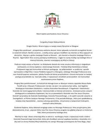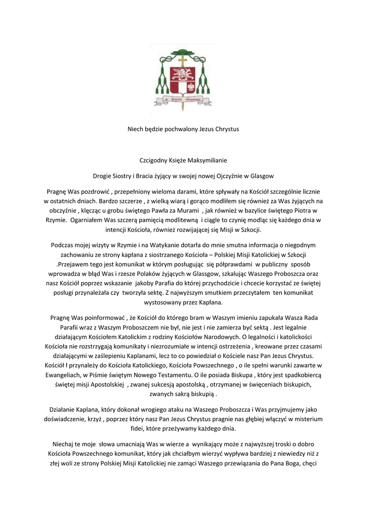 Niech będzie pochwalony Jezus Chrystus Czcigodny Księże Maksymilianie Drogie Siostry i Bracia żyjący w swojej nowej Ojczyźnie w Glasgow Pragnę Was pozdrowić , przepełniony wieloma darami, które spływały na Kościół szczególnie licznie w ostatnich dniach. Bardzo szczerze , z wielką wiarą i gorąco modliłem się również za Was żyjących na obczyźnie , klęcząc u grobu świętego Pawła za Murami , jak również w bazylice świętego Piotra w Rzymie. Ogarniałem Was szczerą pamięcią modlitewną i ciągle to czynię modląc się każdego dnia w intencji Kościoła, również rozwijającej się Misji w Szkocji. Podczas mojej wizyty w Rzymie i na Watykanie dotarła do mnie smutna informacja o niegodnym zachowaniu ze strony kapłana z siostrzanego Kościoła – Polskiej Misji Katolickiej w Szkocji .Przejawem tego jest komunikat w którym posługując się półprawdami w publiczny sposób wprowadza w błąd Was i rzesze Polaków żyjących w Glassgow, szkalując Waszego Proboszcza oraz nasz Kościół poprzez wskazanie jakoby Parafia do której przychodzicie i chcecie korzystać ze świętej posługi przynależała czy tworzyła sektę. Z najwyższym smutkiem przeczytałem ten komunikat wystosowany przez Kapłana. Pragnę Was poinformować , że Kościół do którego bram w Waszym imieniu zapukała Wasza Rada Parafii wraz z Waszym Proboszczem nie był, nie jest i nie zamierza być sektą . Jest legalnie działającym Kościołem Katolickim z rodziny Kościołów Narodowych. O legalności i katolickości Kościoła nie rozstrzygają komunikaty i niezrozumiałe w intencji ostrzeżenia , kreowane przez czasami działającymi w zaślepieniu Kaplanami, lecz to co powiedział o Kościele nasz Pan Jezus Chrystus. Kościół ł przynależy do Kościoła Katolickiego, Kościoła Powszechnego , o ile spełni warunki zawarte w Ewangeliach, w Piśmie świętym Nowego Testamentu. O ile posiada Biskupa , który jest spadkobiercą świętej misji Apostolskiej , zwanej sukcesją apostolską , otrzymanej w święceniach biskupich, zwanych sakrą biskupią . Działanie Kaplana, który dokonał wrogiego ataku na Waszego Proboszcza i Was przyjmujemy jako doświadczenie, krzyż , poprzez który nasz Pan Jezus Chrystus pragnie nas głębiej włączyć w misterium fidei, które przeżywamy każdego dnia. Niechaj te moje słowa umacniają Was w wierze a wynikający może z najwyższej troski o dobro Kościoła Powszechnego komunikat, który jak chciałbym wierzyć wypływa bardziej z niewiedzy niż z złej woli ze strony Polskiej Misji Katolickiej nie zamąci Waszego przewiązania do Pana Boga, chęci wzrastania w świętej katolickiej wierze, którą pragniecie realizować w świętym, jednym i apostolskim Kościele , do którego przynależy również Kościół , którego jestem z woli Ducha Świętego i wyboru naszego Mistrza Jezusa Chrystusa Biskupem. Przebaczmy tym co nie wiedzą co czynią. Módlmy się za tych, którzy nas prześladują , pamiętając ,ze Pan nigdy nie pozostawi nas samych sobie bez Jego opieki i ingerencji. Tak też będzie i tym razem. Pamiętajmy, że gdzie dwóch lub trzech zgromadzi się w imię moje tam i ja będę z Nimi. Pamiętajmy o tych słowach przepełnieni Bożym pokojem i miłością nie odnosząc się do błędów innych z wrogim nastawieniem. Oczekując z utęsknieniem spotkania z Wami z serca Wam błogosławię W imię + Ojca i + Syna i +Ducha Świętego Biskup Adam Rosiek Podpisano we Wrocławiu w dniu Pańskim 02 lipca 2016 r.
