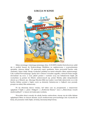 LEKCJA W KINIE Mimo mroźnego i śnieżnego jesiennego dnia, 12.10.2015r dzielni Zerówkowicze udali się w podróż busem do Krakowskiego Multikina na zaplanowaną z wyprzedzeniem specjalną „kinową lekcję”. W pierwszej części spotkania, które prowadził bardzo miły Animator, dzieci miały okazję wysłuchać prelekcji na temat sekretów filmu animowanego. Cały wykład Prowadzącego, oparty był o ciekawe wizualne zagadki, z których Dzieci mogły dowiedzieć się m.in. o: tym, jakich postaw i wartości uczą nas bohaterowie bajek; jak wymyślane są postaci do filmów animowanych np. postać Shreka; jakie niespodzianki ukryte są w filmach, np.: dlaczego Myszka Miki ma 4 palce i nosi białe rękawiczki; za co tak bardzo lubimy postaci z bajek; czym są elementy fantastyczne w bajkach oraz poznały przepis na udany film animowany. Po tej obszernej dawce wiedzy, był także czas na przyjemność, a mianowicie oglądanie 3 bajek: o „Jasiu i Małgosi”, o „Królewnie Śnieżce” oraz o „Złotowłosej i trzech niedźwiadkach” w innym niż tradycyjne wydaniu. Wszystkie dzieci wracały do szkoły bardzo zadowolone, ciesząc się nie tylko faktem oglądnięcia filmu na dużym ekranie, (czyli zrealizowania powszechnego celu wycieczki do kina), ale poznania wielu bajek, od innej, nieznanej dotąd strony.