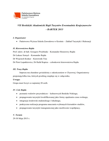 VII Beskidzki Akademicki Rajd Turystów Ewentualnie Krajoznawców - BARTEK 2015 I. Organizator Państwowa Wyższa Szkoła Zawodowa w Krośnie – Zakład Turystyki i Rekreacji II. Kierownictwo Rajdu Prof. ndzw. dr hab. Grzegorz Przebinda – Komandor Honorowy Rajdu Dr Łukasz Szmyd – Komandor Rajdu Dr Wojciech Krukar – Kierownik Tras Dr Piotr Łopatkiewicz, Dr Rafał Kapica – członkowie kierownictwa Rajdu III. Trasy Rajdu Impreza ma charakter gwiaździsty z zakończeniem w Chyrowej. Organizatorzy proponują kilka tras, których przebieg znajduje się w załączniku. Uwaga: Grupa musi liczyć co najmniej 20 osób. IV. Cele Rajdu poznanie walorów przyrodniczo – kulturowych Beskidu Niskiego, propagowanie turystyki kwalifikowanej jako formy spędzania czasu wolnego, integracja środowisk studenckiego i lokalnego, praktyczna realizacja programu nauczania wybranych kierunków studiów, propagowanie turystyki transgranicznej jako możliwości współpracy. V. Termin 29-30 Maja 2015 r. VI. Udział Rajd przewidziany jest dla studentów i pracowników Państwowej Wyższej Szkoły Zawodowej w Krośnie, uczniów szkół ponadgimnazjalnych, pracowników zakładów pracy oraz osób zainteresowanych górskimi wędrówkami. Uwaga: W przypadku grup studenckich oraz młodzieżowych udział jest możliwy tylko z opiekunem. VII. Zgłoszenia Zgłoszenia wraz z rezerwacją tras przyjmowane będą do dnia 15 maja 2015 r. na drukach zgłoszeniowych opracowanych przez organizatora. Zgłoszenia należy nadsyłać drogą mailową ([email protected] z dopiskiem Rajd PWSZ) lub pocztą na adres: Państwowa Wyższa Szkoła Zawodowa w Krośnie, ul. Rynek 1, 38-400 Krosno. VIII. Obowiązki uczestników dobry humor, przygotowanie do trudów wędrówki, wygodny strój turystyczny, własny śpiwór, karimata oraz obuwie zastępcze w przypadku tras wielodniowych, nocleg w warunkach turystycznych oraz pod namiotami, wpłata 15 zł. – trasy jednodniowe oraz 30 zł – trasy dwudniowe (wpłaty równoczesne ze zgłoszeniami, noclegi płatne dodatkowo poza opłatą rajdową), W razie rezygnacji z rajdu dokonana wpłata nie podlega zwrotowi. zachowanie zgodne z kartą turysty. Uwaga: Szczegółowe informacje dotyczące miejsca i godziny wyjazdu oraz miejsca noclegu przekazane zostaną uczestnikom po zakończeniu zapisów na wybrane trasy. IX. Organizator zapewnia obsługę przewodnicką na trasach, pamiątkową, wyjątkową mapę rajdową, ciepły posiłek w trakcie zakończenia imprezy, atrakcyjny program na zakończenie, transport z Chyrowej do Krosna, słońce, deszcz, błoto. Uwaga: Imprezą towarzyszącą, realizowaną równolegle będzie marszobieg terenowy pod nazwą Z kijami lub bez Beskidem Dukielskim, którego regulamin znajduje się w załączniku. X. Zakończenie imprezy W dniu 30 maja 2015 r. w godz. od 13.00 do 14.00 oczekujemy na uczestników Rajdu w Gospodarstwie Agroturystycznym Pod Chyrową. Podczas zakończenia zapewniamy gorący posiłek, występy zespołów regionalnych oraz inne niespodzianki i atrakcje. - Życzymy miłych i przyjemnych wrażeń –