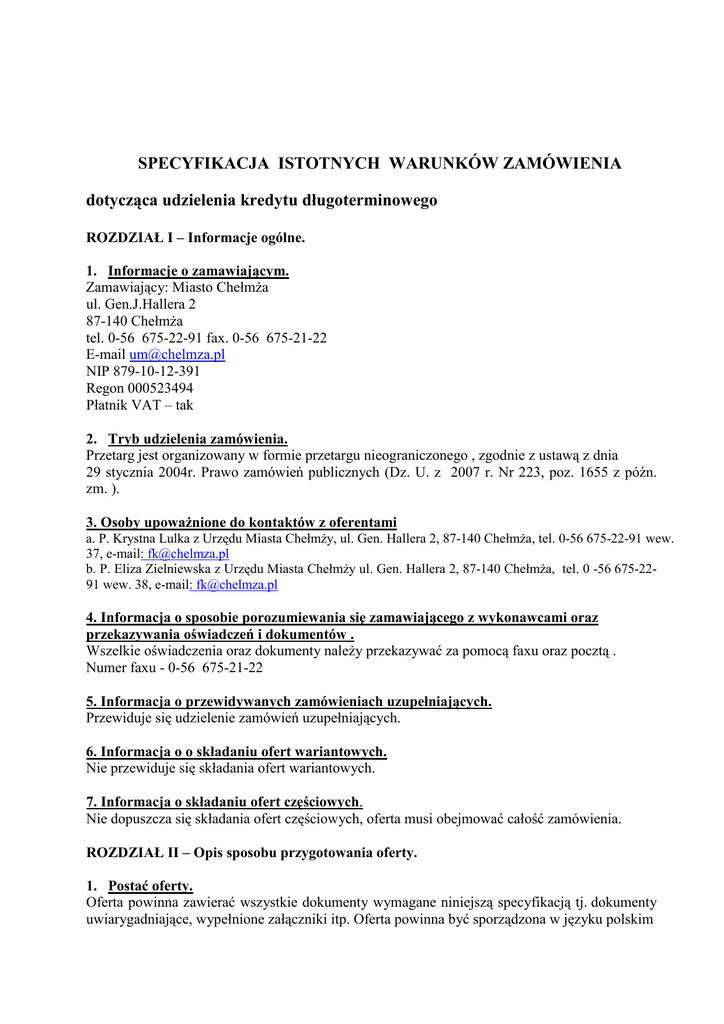 SPECYFIKACJA ISTOTNYCH WARUNKÓW ZAMÓWIENIA dotycząca udzielenia kredytu długoterminowego ROZDZIAŁ I – Informacje ogólne. 1. Informacje o zamawiającym. Zamawiający: Miasto ChełmŜa ul. Gen.J.Hallera 2 87-140 ChełmŜa tel. 0-56 675-22-91 fax. 0-56 675-21-22 E-mail [email protected] NIP 879-10-12-391 Regon 000523494 Płatnik VAT – tak 2. Tryb udzielenia zamówienia. Przetarg jest organizowany w formie przetargu nieograniczonego , zgodnie z ustawą z dnia 29 stycznia 2004r. Prawo zamówień publicznych (Dz. U. z 2007 r. Nr 223, poz. 1655 z późn. zm. ). 3. Osoby upowaŜnione do kontaktów z oferentami a. P. Krystna Lulka z Urzędu Miasta ChełmŜy, ul. Gen. Hallera 2, 87-140 ChełmŜa, tel. 0-56 675-22-91 wew. 37, e-mail: [email protected] b. P. Eliza Zielniewska z Urzędu Miasta ChełmŜy ul. Gen. Hallera 2, 87-140 ChełmŜa, tel. 0 -56 675-2291 wew. 38, e-mail: [email protected] 4. Informacja o sposobie porozumiewania się zamawiającego z wykonawcami oraz przekazywania oświadczeń i dokumentów . Wszelkie oświadczenia oraz dokumenty naleŜy przekazywać za pomocą faxu oraz pocztą . Numer faxu - 0-56 675-21-22 5. Informacja o przewidywanych zamówieniach uzupełniających. Przewiduje się udzielenie zamówień uzupełniających. 6. Informacja o o składaniu ofert wariantowych. Nie przewiduje się składania ofert wariantowych. 7. Informacja o składaniu ofert częściowych. Nie dopuszcza się składania ofert częściowych, oferta musi obejmować całość zamówienia. ROZDZIAŁ II – Opis sposobu przygotowania oferty. 1. Postać oferty. Oferta powinna zawierać wszystkie dokumenty wymagane niniejszą specyfikacją tj. dokumenty uwiarygadniające, wypełnione załączniki itp. Oferta powinna być sporządzona w języku polskim -2a jej wszystkie strony powinny być ponumerowane oraz podpisane przez osobę upowaŜnioną do występowania w imieniu oferenta. KaŜdy oferent moŜe złoŜyć w przetargu tylko jedną ofertę pod rygorem wykluczenia z przetargu. 2. Opakowanie i oznakowanie oferty. Oferty naleŜy składać w nieprzejrzystych i dokładnie zamkniętych opakowaniach. NaleŜy stosować opakowania zewnętrzne i wewnętrzne. Opakowanie zewnętrzne powinno być oznakowane w następujący sposób: Urząd Miasta ChełmŜy, ul. Gen. J. Hallera 2, 87-140 ChełmŜa, „Oferta przetargowa na udzielenie kredytu długoterminowego”. Nie otwierać przed dniem 13.07. 2009r. godz. 1100”. Koperta wewnętrzna powinna być zaadresowana i oznakowana jak powyŜej, a ponadto opatrzona nazwą i dokładnym adresem oferenta. 3.Opis warunków udziału w postępowaniu oraz opis sposobu oceny spełnienia tych warunków a. O udzielenie zamówienia mogą ubiegać się Wykonawcy, którzy: - spełniają warunki określone w art. 22 ust. 1 pkt 1-4 ustawy Pzp, - złoŜą oświadczenie, Ŝe nie podlegają wykluczeniu na podstawie art. 24 ust. 1 i 2 ustawy Pzp z postępowania o udzielenie zamówienia publicznego. - złoŜą oświadczenie, Ŝe w przypadku przedterminowej spłaty kredytu przez kredytobiorcę, Bank nie będzie naliczał prowizji, odsetek od kwoty kredytu spłaconego przed terminem oraz innych kosztów rekompensujących. b. Ocena spełniania powyŜszych warunków dokonana zostanie zgodnie z formułą „spełnia – nie spełnia” w oparciu o informacje zawarte w dokumentach i oświadczeniach wymienionych poniŜej. Z treści załączonych dokumentów musi jednoznacznie wynikać, Ŝe powyŜsze warunki Wykonawca spełnił. c. Niespełnienie chociaŜby jednego z powyŜszych warunków skutkować będzie wykluczeniem Wykonawcy z postępowania. Wykaz oświadczeń i dokumentów, jakie mają dostarczyć wykonawcy w celu potwierdzenia spełnienia warunków udziału w postępowaniu Dokumenty wymagane: a. Wypełniony formularz ofertowy wg. wzoru stanowiącego Załącznik Nr 1. b. Oświadczenie o spełnieniu wymogów z art. 22 ust.1 pkt 1-3 ustawy Pzp. c. Oświadczenie Wykonawcy, Ŝe nie podlega wykluczeniu na podstawie art. 22 ust.1 pkt 4 ustawy Pzp d. Aktualny odpis z właściwego rejestru albo aktualne zaświadczenie o wpisie do ewidencji działalności gospodarczej, wystawione nie wcześniej niŜ 6 miesięcy przed upływem terminu na składanie ofert, (w przypadku składania oferty przez Wykonawców występujących wspólnie, ww. dokument musi być złoŜony przez kaŜdego Wykonawcę). e. Zaświadczenie z właściwego Urzędu Skarbowego o braku zaległości podatkowych wystawione nie wcześniej niŜ 3 miesiące przed upływem terminu składania ofert. f. Zaświadczenie z Zakładu Ubezpieczeń Społecznych o braku zaległości w opłacaniu składek na ubezpieczenia społeczne wystawione nie wcześniej niŜ 3 miesiące przed upływem składania ofert. g. Oświadczenie, Ŝe w przypadku przedterminowej spłaty kredytu przez kredytobiorcę, Bank nie będzie naliczał prowizji, odsetek od kwoty kredytu spłaconego przed terminem oraz innych kosztów rekompensujących. Forma dokumentów: a. Wszystkie dokumentu muszą być przedstawione w formie oryginału lub kopii poświadczonej za zgodność z oryginałem przez osoby uprawnione do reprezentowania Wykonawcy. b. Gdy kserokopia dokumentu jest nieczytelna lub budzi wątpliwości, co do jej prawdziwości, Zamawiający moŜe Ŝądać przedstawienia oryginału lub notarialnie poświadczonej kopii dokumentu. -34. Opis sposobu obliczania ceny oferty. Oferent powinien wyliczyć koszt całego kredytu, który stanowi suma: prowizji przeliczonej na złote, innych prowizji i opłat oraz wartość odsetek przeliczonych na złote ( odsetki winny być liczone wg. stawki WIBOR 1 M na dzień 22.06.2009r. oraz winna być określona wysokość marŜy doliczonej do stawki WIBOR) dla całego okresu spłaty od maksymalnej kwoty kredytu ROZDZIAŁ III – Opis przedmiotu zamówienia. Zamówienie obejmuje udzielenie kredytu długoterminowego w wysokości 3.000.000,00zł (słownie: trzy miliony złotych 00/100). 1) wypłata całości kredytu w jednej transzy w dniu podpisan