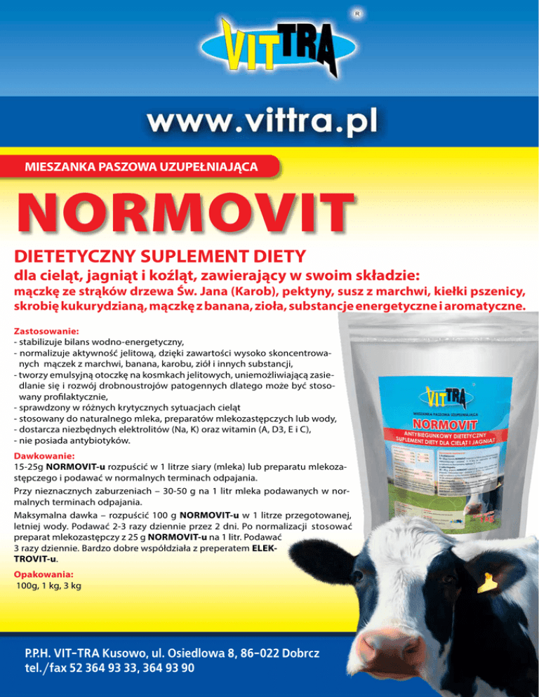 MIESZANKA PASZOWA UZUPEŁNIAJĄCA NORMOVIT DIETETYCZNY SUPLEMENT DIETY dla cieląt, jagniąt i koźląt, zawierający w swoim składzie: mączkę ze strąków drzewa Św. Jana (Karob), pektyny, susz z marchwi, kiełki pszenicy, skrobię kukurydzianą, mączkę z banana, zioła, substancje energetyczne i aromatyczne. Zastosowanie: - stabilizuje bilans wodno-energetyczny, - normalizuje aktywność jelitową, dzięki zawartości wysoko skoncentrowanych mączek z marchwi, banana, karobu, ziół i innych substancji, - tworzy emulsyjną otoczkę na kosmkach jelitowych, uniemożliwiającą zasiedlanie się i rozwój drobnoustrojów patogennych dlatego może być stosowany profilaktycznie, - sprawdzony w różnych krytycznych sytuacjach cieląt - stosowany do naturalnego mleka, preparatów mlekozastępczych lub wody, - dostarcza niezbędnych elektrolitów (Na, K) oraz witamin (A, D3, E i C), - nie posiada antybiotyków. Dawkowanie: 15-25g NORMOVIT-u rozpuścić w 1 litrze siary (mleka) lub preparatu mlekozastępczego i podawać w normalnych terminach odpajania. Przy nieznacznych zaburzeniach – 30-50 g na 1 litr mleka podawanych w normalnych terminach odpajania. Maksymalna dawka – rozpuścić 100 g NORMOVIT-u w 1 litrze przegotowanej, letniej wody. Podawać 2-3 razy dziennie przez 2 dni. Po normalizacji stosować preparat mlekozastępczy z 25 g NORMOVIT-u na 1 litr. Podawać 3 razy dziennie. Bardzo dobre współdziała z preperatem ELEKTROVIT-u. Opakowania: 100g, 1 kg, 3 kg P.P.H. VIT-TRA Kusowo, ul. Osiedlowa 8, 86-022 Dobrcz tel./fax 52 364 93 33, 364 93 90