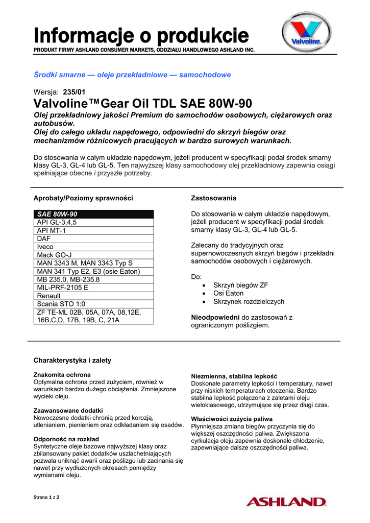 Informacje o produkcie PRODUKT FIRMY ASHLAND CONSUMER MARKETS, ODDZIAŁU HANDLOWEGO ASHLAND INC. Środki smarne — oleje przekładniowe — samochodowe Wersja: 235/01 Valvoline™Gear Oil TDL SAE 80W-90 Olej przekładniowy jakości Premium do samochodów osobowych, ciężarowych oraz autobusów. Olej do całego układu napędowego, odpowiedni do skrzyń biegów oraz mechanizmów różnicowych pracujących w bardzo surowych warunkach. Do stosowania w całym układzie napędowym, jeżeli producent w specyfikacji podał środek smarny klasy GL-3, GL-4 lub GL-5. Ten najwyższej klasy samochodowy olej przekładniowy zapewnia osiągi spełniające obecne i przyszłe potrzeby. Aprobaty/Poziomy sprawności SAE 80W-90 API GL-3,4,5 API MT-1 DAF Iveco Mack GO-J MAN 3343 M, MAN 3343 Typ S MAN 341 Typ E2, E3 (osie Eaton) MB 235.0, MB-235.8 MIL-PRF-2105 E Renault Scania STO 1:0 ZF TE-ML 02B, 05A, 07A, 08,12E, 16B,C,D, 17B, 19B, C, 21A Zastosowania Do stosowania w całym układzie napędowym, jeżeli producent w specyfikacji podał środek smarny klasy GL-3, GL-4 lub GL-5. Zalecany do tradycyjnych oraz supernowoczesnych skrzyń biegów i przekładni samochodów osobowych i ciężarowych. Do: Skrzyń biegów ZF Osi Eaton Skrzynek rozdzielczych Nieodpowiedni do zastosowań z ograniczonym poślizgiem. Charakterystyka i zalety Znakomita ochrona Optymalna ochrona przed zużyciem, również w warunkach bardzo dużego obciążenia. Zmniejszone wycieki oleju. Zaawansowane dodatki Nowoczesne dodatki chronią przed korozją, utlenianiem, pienieniem oraz odkładaniem się osadów. Odporność na rozkład Syntetyczne oleje bazowe najwyższej klasy oraz zbilansowany pakiet dodatków uszlachetniających pozwala uniknąć awarii oraz poślizgu lub zacinania się nawet przy wydłużonych okresach pomiędzy wymianami oleju. Strona 1 z 2 Niezmienna, stabilna lepkość Doskonałe parametry lepkości i temperatury, nawet przy niskich temperaturach otoczenia. Bardzo stabilna lepkość połączona z zaletami oleju wieloklasowego, utrzymujące się przez długi czas. Właściwości zużycia paliwa Płynniejsza zmiana biegów przyczynia się do większej oszczędności paliwa. Zwiększona cyrkulacja oleju zapewnia doskonałe chłodzenie, zapewniające dalsze oszczędności paliwa. Informacje o produkcie PRODUKT FIRMY ASHLAND CONSUMER MARKETS, ODDZIAŁU HANDLOWEGO ASHLAND INC. Bezpieczeństwo Niniejszy produkt prawdopodobnie nie stwarza znaczącego zagrożenia dla zdrowia lub bezpieczeństwa, o ile jest używany prawidłowo w odpowiednim zastosowaniu. Kartę charakterystyki (MSDS) można uzyskać na życzenie od lokalnego dystrybutora lub pobrać ją z witryny pod adresem http://msds.ashland.com Ochrona środowiska Zużyty olej należy oddawać do odpowiedniego punktu zbiórki. Nie spuszczać do ścieków, gleby lub cieków wodnych. Charakterystyczne właściwości Charakterystyka typowych właściwości jest oparta na aktualnie produkowanym preparacie. W przyszłości produkcja będzie zgodna ze specyfikacjami Valvoline, natomiast mogą wystąpić zmiany tej charakterystyki. Valvoline Gear Oil TDL Klasa lepkości SAE Lepkość, mm2/s w temperaturze 100 ºC. ASTM D-445 Lepkość, mm2/s w temperaturze 40 ºC. ASTM D-445 Wskaźnik lepkości ASTM D-2270 Lepkość, mPa.s -40°C. ASTM D-5293 Temperatura krzepnięcia, ºC ASTM D-5950 Ciężar właściwy w temperaturze 15.6°C. ASTM D-4052 Temperatura zapłonu, PMCC, ºC. ASTM D-93 People Who Know Use Valvoline™ Działając w ponad 100 krajach na całym świecie, firma Valvoline to wiodący sprzedawca, dystrybutor i producent wysokiej jakości produktów i usług samochodowych i przemysłowych. Do produktów tej firmy należą smary samochodowe, m. in. MaxLife™ — pierwszy olej silnikowy o formule przeznaczonej specjalnie do pojazdów o wyższym przebiegu; płyny przekładniowe, oleje przekładniowe, smary hydrauliczne, chemikalia motoryzacyjne, produkty specjalne; smary oraz produkty do układu chłodzenia. Aby uzyskać więcej informacji na temat produktów i usług firmy Valvoline, odwiedź www.valvolineeurope.com Autor: AdG Zastępuje - 80W-90 15.2 147.6 104 <150,000 -24 0.898 152 Niniejsze informacje dotyczą wyłącznie produktów wytwarzanych w następujących lokalizacjach: Europa *Znak towarowy będący własnością osoby trzeciej ™ Znak towarowy Ashland lub przedsiębiorstw zależnych, zarejestrowany w różnych krajach © 2012, Ashland Uważa się, że wszelkie informacje oraz dane przedstawione w niniejszym dokumencie są dokładne i wiarygodne, ale nie mogą być traktowane jako gwarancja, gwarancja wyraźna lub dorozumiana, gwarancja przydatności handlowej lub przydatności do określonego celu, lub reprezentacja, wyraźna lub dorozumiana, za którą Ashland Inc. i jej spółki zależne ponoszą odpowiedzialność prawną. Strona 2 z 2