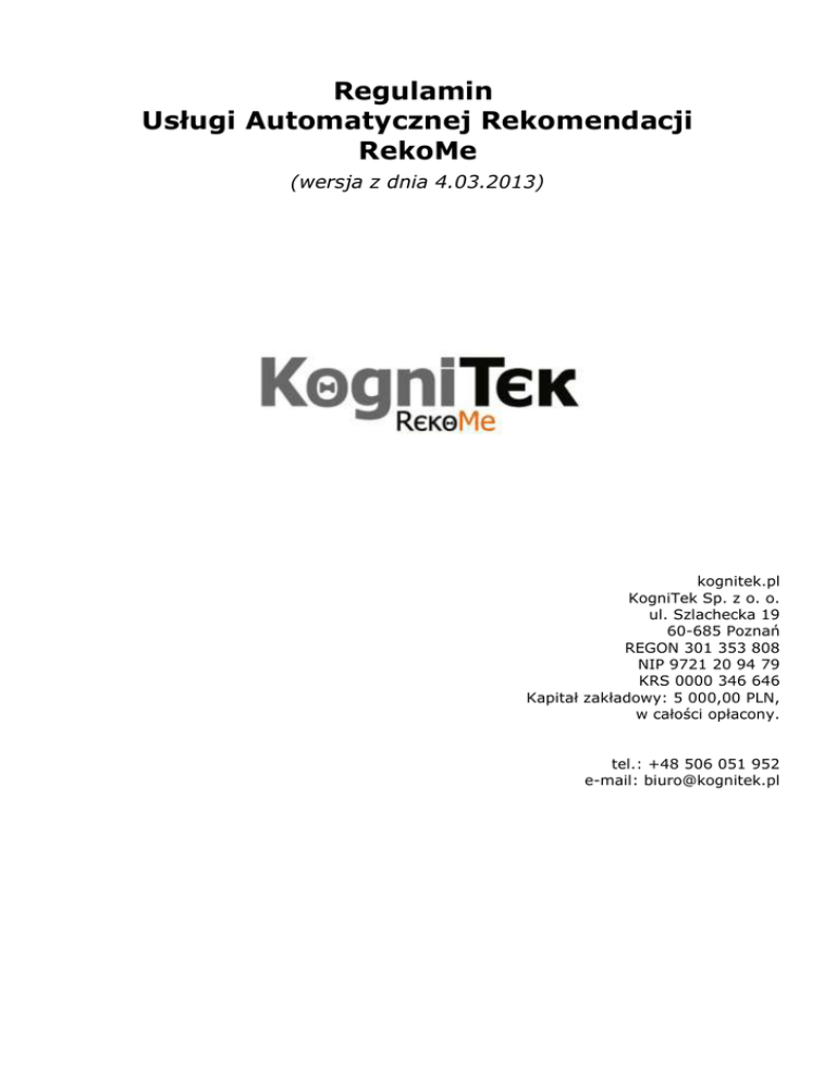 Regulamin Usługi Automatycznej Rekomendacji RekoMe (wersja z dnia 4.03.2013) kognitek.pl KogniTek Sp. z o. o. ul. Szlachecka 19 60-685 Poznań REGON 301 353 808 NIP 9721 20 94 79 KRS 0000 346 646 Kapitał zakładowy: 5 000,00 PLN, w całości opłacony. tel.: +48 506 051 952 e-mail: [email protected] Regulamin Usługi Automatycznej Rekomendacji RekoMe Postanowienia ogólne §1 Niniejszy Regulamin został wydany przez spółkę KogniTek Sp. z o. o. z siedzibą w Poznaniu (60-685) przy ul. Szlacheckiej 19, wpisaną do rejestru przedsiębiorców Krajowego Rejestru Sądowego prowadzonego przez Sąd Rejonowy Poznań - Nowe Miasto i Wilda w Poznaniu, VIII Wydział Gospodarczy KRS pod numerem KRS 0000 346 646, która świadczy Usługę Automatycznej Rekomendacji RekoMe i wykonuje czynności związane z jej realizacją. §2 Terminy użyte w Regulaminie oznaczają: 1. Regulamin - niniejszy regulamin; 2. Usługobiorca - osoba fizyczna bądź prawna będąca przedsiębiorcą i prowadząca działalność gospodarczą z wykorzystaniem sieci Internet, która zawarła z Usługodawcą umowę o korzystanie z usługi RekoMe akceptując Regulamin podczas Rejestracji bądź zawierając dodatkową umowę precyzującą warunki współpracy. Usługobiorcy przypisane jest indywidualne Konto pod unikalną nazwą (loginem); 3. Sklep Internetowy (Sklep) - serwis internetowy prowadzony przez Usługobiorcę, pośrednictwem użyciem którego Usługobiorca dokonuje on sprzedaży Produktów; 4. Produkt - element asortymentu Sklepu Internetowego oferowany w Sklepie Internetowym, (tj. możliwy do zakupienia zakupu przez Użytkownika) i potencjalnie podlegający Rekomendacji prezentowanej w Panelu Rekomendacyjnym; 5. Użytkownik Końcowy (Użytkownik) - pojedynczy użytkownik Sklepu Internetowego, który potencjalny nabywca, posiadający możliwość zakupu Produktów oferowanych przez Usługobiorcę w Sklepie Internetowym; 6. Usługodawca - KogniTek Spółka z ograniczoną odpowiedzialnością; 7. RekoMe (Usługa Automatycznej Rekomendacji RekoMe) - umożliwiający usługa polegająca na automatycznym rekomendowaniu Produktów dostępnych w Sklepie Internetowym oraz/bądź produktów oferowanych przez pozostałych usługobiorców korzystających z RekoMe. RekoMe jest narzędziem służącym do nawigacji w Sklepie Internetowym na podstawie danych behawioralnych oraz danych udostępnianych Usługodawcy przez Sklep Internetowy, jak również do kierowania na strony Sklepu Internetowego Użytkownika odwiedzającego stronę zewnętrzną - niebędącą stroną Sklepu, ale prezentującą rekomendacje produktów oferowanych w Sklepie Internetowym. Produkty innych usługobiorców mogą być rekomendowane w Sklepie danego Usługobiorcy jedynie w przypadku, gdy dany Usługobiorca nie posiada ich w swojej ofercie lub jeśli wyraził on na to zgodę. Strona główna serwisu internetowego prezentującego RekoMe jest dostępna pod adresem www.rekome.pl . 8. Rejestracja - procedura zakładania Konta Usługobiorcy pod unikalną nazwą (login); 9. Konto Usługobiorcy - prowadzone dla Usługobiorcy przez Usługodawcę pod unikalną nazwą (login) konto będące zbiorem zasobów, w którym gromadzone są dane Usługobiorcy oraz informacje o jego działaniach w ramach RekoMe; 10. Panel Rekomendacyjny - aplikacja internetowa znajdująca się na stronie internetowej Sklepu Internetowego, odpowiadająca za zbieranie danych transakcyjnych i wysyłanie ich do serwisu RekoMe. Panel Rekomendacyjny odpowiada również za wyświetlanie Rekomendacji. 11. Rekomendacja - wynik przetworzenia danych o Produktach oferowanych w Sklepie i danych o akcjach Użytkownika dokonywanych w Sklepie ,prezentowany w postaci listy kilku produktów estymowanych jako najlepiej odpowiadające w danym momencie potrzebom danego Użytkownika. W Sklepie Internetowym, Rekomendacje wyświetlane są w Slotach Panelu Rekomendacyjnego; 12. Rekomendacja Wewnątrz Sklepu Rekomendacja prezentowana w Panelu Rekomendacyjnym umieszczonym na stronie Sklepu Internetowego wskazująca Produkt z asortymentu tego samego Sklepu Internetowego; 13. Rekomendacja Wewnątrz Platformy – Rekomendacja prezentowana w Panelu Rekomendacyjnym umieszczonym na stronie Sklepu Internetowego wskazująca produkt niekonkurencyjny (tj. należący do innej kategorii niż którakolwiek z kategorii produktów oferowanych w Sklepie) oferowane w innych niż Sklep Internetowy sklepach korzystających z RekoMe lub Rekomendacja prezentowana w serwisie internetowym innego sklepu korzystającego z RekoMe (poza Sklepem Internetowym) wskazująca produkty oferowane w Sklepie Internetowym; 14. Podstawowa Wyszukiwarka RekoMe – bezpłatny wariant wyszukiwarki RekoMe o funkcjonalności ograniczonej do standardowego (tj. literalnego, dokładnego) wyszukiwania według słów kluczowych, tj. nie wyposażona w funkcje identyfikacji zapytań bliskoznacznych i o podobnej pisowni; Podstawowa Wyszukiwarka RekoMe jest wariantem wyszukiwarki RekoMe stosowanym zawsze w przypadku, w którym odpowiedź na zadane przez Użytkownika zapytanie uzyskana z użyciem Podstawowej Wyszukiwarki RekoMe jest niepusta, tj. kiedy użycie Podstawowej Wyszukiwarki RekoMe do obsługi danego zapytania powoduje uzyskanie jednej lub więcej odpowiedzi wskazujących produkty zgodne z zapytaniem; 15. Zaawansowana Wyszukiwarka RekoMe - odpłatny wariant wyszukiwarki RekoMe o funkcjonalności identyfikacji zapytań bliskoznacznych i o podobnej pisowni; Zaawansowana Wyszukiwarka RekoMe jest wariantem wyszukiwarki RekoMe stosowanym wyłącznie w przypadku, w którym odpowiedź na zadane przez Użytkownika zapytanie uzyskana z użyciem Podstawowej Wyszukiwarki RekoMe jest pusta, tj. kiedy użycie Podstawowej Wyszukiwarki RekoMe do obsługi danego zapytania nie powoduje uzyskania jakiejkolwiek niepustej odpowiedzi wskazującej produkty zgodne z zapytaniem; 16. Slot - jedno z pól w integrowanym ze stroną Sklepu Panelu Rekomendacyjnym, docelowe miejsce prezentowani