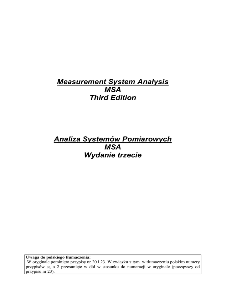 Measurement System Analysis MSA Third Edition Analiza Systemów Pomiarowych MSA Wydanie trzecie Uwaga do polskiego tłumaczenia: W oryginale pominięto przypisy nr 20 i 23. W związku z tym w tłumaczeniu polskim numery przypisów są o 2 przesunięte w dół w stosunku do numeracji w oryginale (począwszy od przypisu nr 23). 2 Okładka Analiza Systemów Pomiarowych MSA Wydanie trzecie Strona i Analiza Systemów Pomiarowych Podręcznik Odniesienia Wydanie trzecie Wydanie pierwsze, Październik 1990*Druga Edycja, Luty 1995; Drugi wydruk, Czerwiec 1998*Wydanie trzecie, Marzec 2002 Prawa autorskie©1990, ©1995, ©2002 DaimlerChrysler Corporation, Ford Motor Company, General Motors Corporation Licencja praw autorskich od DaimlerChrysler Corporation, Ford Motor Company, i General Motors Corporation. Dalsze kopie można uzyskać w: Carwin Limited, Unit 1 Trade Link, Western Ave, West Thurrock, Grays, Essex RM20 3FJ, UK TEL: 44(0)1708 86 1333 Fax: 44 (0)17 08 867941 www.carwin.co.uk WPROWADZENIE Niniejszy Podręcznik Odniesienia został opracowany przez Grupę Roboczą ds. Analizy Systemu Pomiarowego, sankcjonowaną przez Zespół Zadaniowy ds. Wymagań Jakości Dostawcy DaimlerChrysler Corporation/Ford Motor Company/General Motors Corporation i pod auspicjami Amerykańskiego Stowarzyszenia Jakości (ASQ) i Grupą Roboczą Przemysłu Motoryzacyjnego (AIAG). Grupę Roboczą odpowiedzialną za Trzecią Edycję stanowili: David Benham (DaimlerChrysler Corporation), Michael Down (General Motors Corporation), Peter Cvetkowski (Ford Motor Company), Gregory Gruska (Third Generation, Inc.), Tripp Martin (Federal Mogul) and Steve Stahley (SRS Technical Services). W przeszłości, Chrysler, Ford i General Motors każdy z osobna posiadali swoje własne wytyczne i formularze dla zapewnienia zgodności dostawcy. Różnice pomiędzy tymi wytycznymi spowodowały, że dostawcom stawiano dodatkowe żądania. Dla usprawnienia tej sytuacji, Zespół Zadaniowy został powołany po to, aby znormalizować podręczniki, procedury, wzory raportów i nazewnictwo techniczne używane przez Chryslera, Forda i General Motors. Ponadto, w 1990 roku Chrysler, Ford i General Motors uzgodnili opracowanie i rozpowszechnienie poprzez AIAG podręcznika MSA. Pierwsze wydanie zostało dobrze przyjęte przez dostawców, z powodu zaoferowania bogatych danych wejściowych, opartych na bazie doświadczenia praktycznego. Te dane wejściowe zostały włączone do drugiego i trzeciego wydania. Podręcznik ten, zatwierdzony i zaaprobowany przez DaimlerChrysler Corporation, Ford Motor Company i General Motors jest dodatkowym dokumentem odniesienia do QS-9000. Podręcznik jest wprowadzeniem do analizy systemu pomiarowego. Nie jest zamierzone ograniczenie metod analizy do określonych procesów lub towarów. Ponieważ wytyczne te, w swoim założeniu, dotyczą sytuacji typowych dla systemów pomiarowych, mogą się pojawić przypadki wątpliwe. Te wątpliwości powinny być kierowane do służby Zapewnienie Jakości Dostawcy (SQA) u twojego klienta. Jeżeli nie jesteś pewny, jak skontaktować się z odpowiednią służbą SQA, pomoże ci pracownik działu zakupów twego dostawcy. 3 Grupa Robocza MSA składa serdeczne podziękowania: za przywództwo i zaangażowanie wiceprezesom Tomowi Sidlikowi z DaimlerChrysler Corporation, Carlosowi Mazzorin z Ford Motor Company i Bo Andersonowi z General Motors Corporation; za pomoc przy opracowaniu, produkcji i rozprowadzaniu podręcznika; kierowanie Zespołem Zadaniowym przełożonym: Hankowi Gryn (DaimlerChrysler Corporation, Russowi Hopkins (Ford Motor Company), Joemu Bransky (General Motors Corporation) i Amerykańskiemu Stowarzyszeniu do Testów i Materiałów (ASTM International). Podręcznik ten został opracowany po to, aby spełnić specjalne wymagania przemysłu motoryzacyjnego. Podręcznik ten jest objęty prawami autorskimi przez DaimlerChrysler Corporation, Ford Motor Company i General Motors Corporation, wszystkie prawa zastrzeżone, 2002. Dodatkowe podręczniki można zamówić z AIAG i/lub zgodę do kopiowania części tego podręcznika w celu użycia w obrębie organizacji dostawcy można uzyskać z AIAG 248-3583570. Poza USA podręczniki można uzyskać w: Carwin Limited, Unit 1 Trade Link, Western Ave, West Thurrock, Grays, Essex RM20 3FJ, UK TEL: 44(0)1708 86 1333 Fax: 44 (0)17 08 867941 www.carwin.co.uk Marzec 2002 Strona iv Pusta Strona v WPROWADZENIE Niniejszy Podręcznik został opracowany przez Grupę Roboczą d/s Analizy Systemów Pomiarowych /MSA/ utworzoną w ramach Grup Zadaniowych d/s Wymogów Jakościowych dla Dostawców Chryslera /Forda/ General Motors i pod auspicjami Oddziału Motoryzacyjnego Amerykańskiego Stowarzyszenia d/s Kontroli Jakości /ASQC/ oraz Grupy Roboczej Przemysłu Motoryzacyjnego /AIAG/. Grupę Roboczą odpowiedzialną za niniejszą drugą edycję stanowili Ray Daughery /Chrysler/, Victor Lowe Jr. /Ford/, Chairperson Michael H. Down /General Motors/ oraz Gregory Gruska /The Third Generation Inc./. W przeszłości Chrysler, Ford i General Motors posiadali każdy swoje własne wytyczne i formularze służące do zapewnienia zgodności dostawców. Różnice między tymi wytycznymi powodowały, że dostawcom stawiano dodatkowe wymagania. W celu poprawy sytuacji stworzono Grupę Zadaniową mającą na celu znormalizowanie podręczników, procedur, formularzy oraz nomenklatury technicznej stosowanej przez Chryslera, Forda i General Motors. Ponadto w 1990 r. Chrysler, Ford i General Motors uzgodnili opracowanie i rozprowadzenie przez AIAG podręcznika MSA. Pierwsze jego wydanie zostało dobrze przyjęte przez dostawców, oferując wartościowe materiały opracowane w oparciu o doświadczenie w ich stosowaniu. Materiały te wprowadzono również do niniejszego wydania drugiego. Niniejszy podręcznik, który jest zatwierdzony i zaaprobowany przy Chryslera, Forda i General Motors powinien być stosowany przez dostawców wdrażających do swojego procesu produkcyj