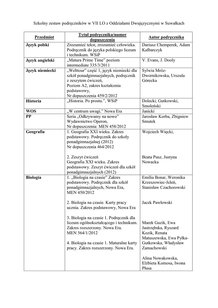 Szkolny zestaw podręczników w VII LO z Oddziałami Dwujęzycznymi w Suwałkach Przedmiot Język polski Język angielski Język niemiecki Historia WOS PP Geografia Biologia Tytuł podręcznika/numer dopuszczenia Zrozumieć tekst, zrozumieć człowieka. Podręcznik do języka polskiego liceum i technikum. WSiP „Matura Prime Time” poziom intermediate 335/3/2011 „Welttour” część 1, język niemiecki dla szkół ponadgimnazjalnych, podręcznik z zeszytem ćwiczeń, Poziom A2, zakres kształcenia podstawowy, Nr dopuszczenia 459/2/2012 „Historia. Po prostu.”, WSiP „W centrum uwagi.” Nowa Era Seria „Odkrywamy na nowo” Wydawnictwo Operon, Nr dopuszczenia: MEN 458/2012 1. Geografia XXI wieku. Zakres podstawowy. Podręcznik do szkoły ponadgimnazjalnej (2012) Nr dopuszczenia 464/2012 Autor podręcznika Dariusz Chemperek, Adam Kalbarczyk V. Evans, J. Dooly Sylwia MrózDwornikowska, Urszula Górecka Dolecki, Gutkowski, Smoleński Janicki Jarosław Korba, Zbigniew Smutek Wojciech Więcki, 2. Zeszyt ćwiczeń Geografia XXI wieku. Zakres podstawowy. Zeszyt ćwiczeń dla szkół ponadgimnazjalnych (2012) 1. „Biologia na czasie” Zakres podstawowy. Podręcznik dla szkół ponadgimnazjalnych, Nowa Era, MEN 450/2012 Beata Pusz, Justyna Nowacka 2. Biologia na czasie. Karty pracy ucznia. Zakres podstawowy, Nowa Era Jacek Pawłowski 3. Biologia na czasie 1. Podręcznik dla liceum ogólnokształcącego i technikum. Zakres rozszerzony. Nowa Era. MEN 564/1/2012 4. Biologia na czasie 1. Maturalne karty pracy. Zakres rozszerzony. Nowa Era. Emilia Bonar, Weronika Krzeszowiec-Jeleń, Stanisław Czachorowski Marek Guzik, Ewa Jastrzębska, Ryszard Kozik, Renata Matuszewska, Ewa PyłkaGutkowska, Władysław Zamachowski Alina Nowakowska, Elżbieta Komosa, Iwona Płusa Szkolny zestaw podręczników w VII LO z Oddziałami Dwujęzycznymi w Suwałkach Chemia Fizyka Matematyka Informatyka Edukacja dla bezpieczeństwa Wiedza o kulturze Religia „To jest chemia” Podręcznik dla szkół ponadgimnazjalnych zakres podstawowy. 438/2012 „Świat fizyki. Podręcznik dla szkół ponadgimnazjalnych. Zakres podstawowy” , Zamkor Nr dopuszczenia 394/2011 1. Matematyka. Podręcznik do liceum i technikum. Klasa 1. Zakres podstawowy Romuald Hassa Aleksandra Mrzigod Janusz Mrzigod 2. Zbiór zadań do liceów i techników. Klasa 1. Zakres podstawowy. Informatyka Europejczyka. Podręcznik dla szkół ponadgimnazjalnych. Zakres podstawowy, Wyd. Helion. Nr dopuszczenia: MEN 556/2012 (wersja Windows) „Żyję i działam bezpiecznie. Edukacja dla bezpieczeństwa, podręcznik dla szkół ponadgimnazjalnych, zakres podstawowy”, Nowa Era „Spotkania z kulturą, podręcznik do WOK dla liceum i technikum.” „Jestem świadkiem Chrystusa w Kościele”, WAM, Kraków Marcin Kurczab, Elżbieta Kurczab, Elżbieta Świda pod red. Marii Fiałkowskiej Marcin Kurczab, Elżbieta Kurczab, Elżbieta Świda Jarosław Słoma pod red. Z. Marek