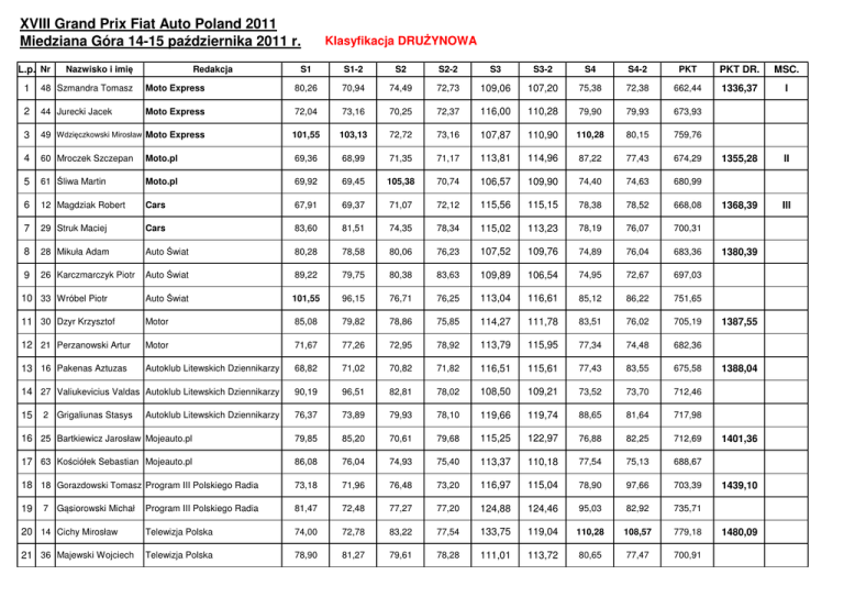 XVIII Grand Prix Fiat Auto Poland 2011 Miedziana Góra 14-15 października 2011 r. L.p. Nr Nazwisko i imię Redakcja Klasyfikacja DRUŻYNOWA S1 S1-2 S2 S2-2 S3 S3-2 S4 S4-2 PKT PKT DR. MSC. 1336,37 I 1355,28 II 1368,39 III 1 48 Szmandra Tomasz Moto Express 80,26 70,94 74,49 72,73 109,06 107,20 75,38 72,38 662,44 2 44 Jurecki Jacek Moto Express 72,04 73,16 70,25 72,37 116,00 110,28 79,90 79,93 673,93 3 49 Wdzięczkowski Mirosław Moto Express 101,55 103,13 72,72 73,16 107,87 110,90 110,28 80,15 759,76 4 60 Mroczek Szczepan Moto.pl 69,36 68,99 71,35 71,17 113,81 114,96 87,22 77,43 674,29 5 61 Śliwa Martin Moto.pl 69,92 69,45 105,38 70,74 106,57 109,90 74,40 74,63 680,99 6 12 Magdziak Robert Cars 67,91 69,37 71,07 72,12 115,56 115,15 78,38 78,52 668,08 7 29 Struk Maciej Cars 83,60 81,51 74,35 78,34 115,02 113,23 78,19 76,07 700,31 8 28 Mikuła Adam Auto Świat 80,28 78,58 80,06 76,23 107,52 109,76 74,89 76,04 683,36 9 26 Karczmarczyk Piotr Auto Świat 89,22 79,75 80,38 83,63 109,89 106,54 74,95 72,67 697,03 10 33 Wróbel Piotr Auto Świat 101,55 96,15 76,71 76,25 113,04 116,61 85,12 86,22 751,65 11 30 Dzyr Krzysztof Motor 85,08 79,82 78,86 75,85 114,27 111,78 83,51 76,02 705,19 12 21 Perzanowski Artur Motor 71,67 77,26 72,95 78,92 113,79 115,95 77,34 74,48 682,36 13 16 Pakenas Aztuzas Autoklub Litewskich Dziennikarzy 68,82 71,02 70,82 71,82 116,51 115,61 77,43 83,55 675,58 14 27 Valiukevicius Valdas Autoklub Litewskich Dziennikarzy 90,19 96,51 82,81 78,02 108,50 109,21 73,52 73,70 712,46 15 76,37 73,89 79,93 78,10 119,66 119,74 88,65 81,64 717,98 16 25 Bartkiewicz Jarosław Mojeauto.pl 79,85 85,20 70,61 79,68 115,25 122,97 76,88 82,25 712,69 17 63 Kościółek Sebastian Mojeauto.pl 86,08 76,04 74,93 75,40 113,37 110,18 77,54 75,13 688,67 18 18 Gorazdowski Tomasz Program III Polskiego Radia 73,18 71,96 76,48 73,20 116,97 115,04 78,90 97,66 703,39 19 Program III Polskiego Radia 81,47 72,48 77,27 77,20 124,88 124,46 95,03 82,92 735,71 20 14 Cichy Mirosław Telewizja Polska 74,00 72,78 83,22 77,54 133,75 119,04 110,28 108,57 779,18 21 36 Majewski Wojciech Telewizja Polska 78,90 81,27 79,61 78,28 111,01 113,72 80,65 77,47 700,91 2 Grigaliunas Stasys 7 Gąsiorowski Michał Autoklub Litewskich Dziennikarzy 1380,39 1387,55 1388,04 1401,36 1439,10 1480,09 1497,64 22 23 Olszak Michał Next Tv 80,81 77,16 84,67 76,77 122,32 113,83 90,88 76,91 723,35 23 40 Rajewski Michał Next Tv 78,23 77,95 79,09 74,62 125,27 120,28 110,28 108,57 774,29 24 38 Tabor Piotr Fleet 80,17 80,13 81,54 72,12 126,64 116,65 89,24 78,86 725,35 25 10 Siwiński Tomasz Fleet 79,04 73,32 105,38 74,76 125,48 123,55 110,28 108,57 800,38 26 9 Ochodek Andrzej Polskie Radio Katowice 75,84 77,21 81,84 80,41 125,70 130,05 90,03 108,55 769,63 27 43 Juśkiewicz Anna Polskie Radio Katowice 75,92 97,92 77,68 80,65 159,86 115,37 97,34 82,69 787,43 28 20 Mańkowski Wojciech Twój Tydzień Wielkopolski 101,55 103,13 105,38 81,12 134,59 129,35 92,54 89,99 837,65 29 32 Mańkowski Tomasz Twój Tydzień Wielkopolski 90,77 101,37 88,09 106,11 138,54 137,85 90,82 88,64 842,19 30 35 Kuliński Wojciech Top Gear 86,96 81,95 84,83 80,02 111,70 159,81 110,28 108,57 31 Top Gear 67,70 70,52 71,45 73,87 NST Turbo Test 72,38 71,21 70,33 72,22 NST 33 42 Korzeniowski Bogusław Turbo Test 78,61 83,43 80,35 75,85 NST 34 54 Hutyra Michał Auto Motor i Sport 101,55 73,11 105,38 72,47 NST 35 55 Hanusz Jacek Auto Motor i Sport 77,61 76,62 105,38 78,18 NST 101,55 103,49 105,38 106,11 6 Horodecki Jarosław 32 45 Michalik Sebastian Obliczenia: Paweł Jagniątkowski Kierownik komisji obliczeń: Krzysztof Karczewski 159,86 159,81 110,28 1525,73 1557,06 1679,84 NST 108,57 Dyrektor Zawodów: Krzysztof Tutak