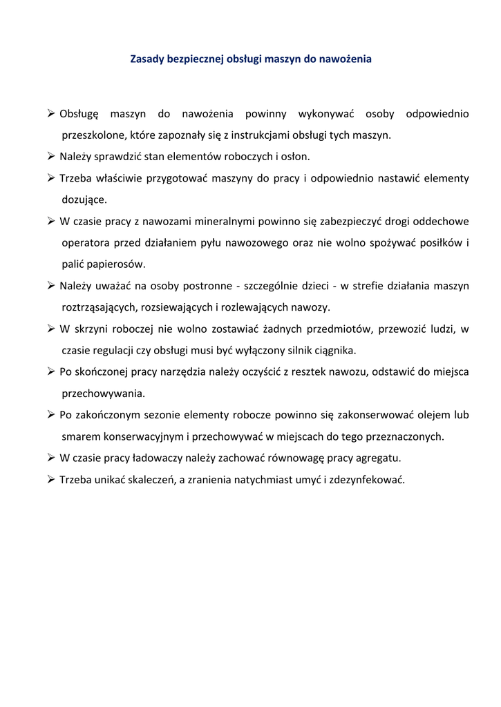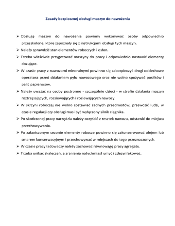 Zasady bezpiecznej obsługi maszyn do nawożenia Obsługę maszyn do nawożenia powinny wykonywać osoby odpowiednio przeszkolone, które zapoznały się z instrukcjami obsługi tych maszyn. Należy sprawdzić stan elementów roboczych i osłon. Trzeba właściwie przygotować maszyny do pracy i odpowiednio nastawić elementy dozujące. W czasie pracy z nawozami mineralnymi powinno się zabezpieczyć drogi oddechowe operatora przed działaniem pyłu nawozowego oraz nie wolno spożywać posiłków i palić papierosów. Należy uważać na osoby postronne - szczególnie dzieci - w strefie działania maszyn roztrząsających, rozsiewających i rozlewających nawozy. W skrzyni roboczej nie wolno zostawiać żadnych przedmiotów, przewozić ludzi, w czasie regulacji czy obsługi musi być wyłączony silnik ciągnika. Po skończonej pracy narzędzia należy oczyścić z resztek nawozu, odstawić do miejsca przechowywania. Po zakończonym sezonie elementy robocze powinno się zakonserwować olejem lub smarem konserwacyjnym i przechowywać w miejscach do tego przeznaczonych. W czasie pracy ładowaczy należy zachować równowagę pracy agregatu. Trzeba unikać skaleczeń, a zranienia natychmiast umyć i zdezynfekować. Szczególną wagę do racjonalnego i bezpiecznego nawożenia przywiązuje KODEKS DOBREJ PRAKTYKI ROLNICZEJ. Poniżej odpowiednie zasady. Środowisko w gospodarstwie należy sporządzić bilans azotu, fosforu, potasu i substancji organicznej. Woda mycie sprzętu rolniczego należy wykonywać w sposób uniemożliwiający przenikanie do wód gruntowych - myjniach na podłożu biologicznym, rozsiewacze i rozlewacze nawozów należy myć bezpośrednio w polu, usuwając wodę podczas przejazdu, podczas przeładunku nawozów nie wolno zanieczyszczać gleby i wody, nawozy trzeba stosować tak, aby ograniczyć przedostawanie się do wód powierzchniowych i podziemnych, nie wolno stosować nawozów mineralnych i organicznych na polach zalanych wodą, przykrytych śniegiem, zamarzniętych, (płynnych i mineralnych azotowych) na glebach bez okrywy roślinnej i na stokach powyżej 10%, na rośliny przeznaczone do bezpośredniego spożycia, nawozy należy stosować równomiernie na całej powierzchni pola, usługowe prace nawożenia mogą wykonywać osoby przeszkolone lub absolwenci szkół rolniczych, nawozy naturalne powinny być stosowane od 1 marca do 30 listopada pod rośliny o długim okresie wegetacji, nawożenie obornikiem należy wykonywać najlepiej wczesną wiosną lub późną jesienią i natychmiast przyorać, azotowe nawozy mineralne powinno się stosować w kilku dawkach w okresie największego zapotrzebowania roślin na składniki pokarmowe. Grunty rolne nawozy wapniowe należy stosować przy kwaśnym odczynie pH poniżej 5,0 - badania wykonywać co 4-6 lat, nie powinno się łączyć nawozów organicznych z wapniowymi - straty amoniaku, dawki nawozów powinny odpowiadać potrzebom pokarmowym roślin. Powietrze należy zabezpieczać nawozy przed rozsypaniem lub pyleniem, nawozy pyliste stosować w dni bezwietrzne o dużej wilgotności względnej, nawozy organiczne wywozić na pole w czasie pochmurnej pogody, nie przeładowywać roztrząsaczy i nie przepełniać beczkowozów.