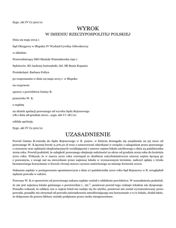 Sygn. akt IV Ca 500/12 WYROK W IMIENIU RZECZYPOSPOLITEJ POLSKIEJ Dnia 29 maja 2013 r. Sąd Okręgowy w Słupsku IV Wydział Cywilny Odwoławczy w składzie: Przewodniczący SSO Mariola Watemborska (spr.) Sędziowie: SO Andrzej Jastrzębski, del. SR Beata Kopania Protokolant: Barbara Foltyn po rozpoznaniu w dniu 29 maja 2013 r. w Słupsku na rozprawie sprawy z powództwa Gminy B. przeciwko W. K. o zapłatę na skutek apelacji pozwanego od wyroku Sądu Rejonowego wB.z dnia 28 grudnia 2011r., sygn. akt I C 187/10 oddala apelację. Sygn. akt IV Ca 500/12 UZASADNIENIE Powód Gmina B.wniosła do Sądu Rejonowego w B. pozew, w którym domagała się zasądzenia na jej rzecz od pozwanego W. K.łącznej kwoty 9.476,22 zł wraz z ustawowymi odsetkami w związku z zaleganiem przez pozwanego z czynszem oraz opłatami eksploatacyjnych wynikającymi z umowy najmu lokalu użytkowego z dnia 23 października 2009 roku. Powód podniósł, że zaległość pozwanego obejmuje należności za okres od grudnia 2009 roku do kwietnia 2010 roku. Wskazał, że w marcu 2010 roku rozwiązał ze skutkiem natychmiastowym umowę najmu łączącą go z pozwanym, z uwagi zaś na niewydanie przez najemcę lokalu w wyznaczonym terminie, naliczył opłatę z tytułu bezumownego korzystania w kwocie równej stawce czynszu umówionego za miesiąc kwiecień 2010r. Nakazem zapłaty w postępowaniu upominawczym z dnia 27 października 2010 roku Sąd Rejonowy w B. uwzględnił żądanie powoda w całości. Pozwany W. K.w sprzeciwie od powyższego nakazu zapłaty wniósł o oddalenie powództwa. W uzasadnieniu podniósł, że nie jest najemcą lokalu gminnego o powierzchni (...)m 2, ponieważ powód tego rodzaju lokalem nie dysponuje. Ponadto wskazał, że oddany mu w najem lokal nie nadaje się do użytku, ponieważ nie został wyremontowany przez powoda, ponadto nie otrzymał od powoda zaświadczenia umożliwiającego mu korzystanie z w/w lokalu, dodał także, że dołączone do pozwu faktury zostały podpisane przez osoby nieuprawnione. Wyrokiem z dnia 28 grudnia 2011 roku Sąd Rejonowy w B. zasądził od pozwanego na rzecz powoda kwotę 9.476,22 zł wraz z ustawowymi odsetkami od kwot (punkt 1 sentencji): • 1.028 zł od dnia 11 grudnia 2009 roku do dnia zapłaty; • 604,16 zł od dnia 24 grudnia 2009 roku do dnia zapłaty; • 1.464 zł od dnia 11 stycznia 2010 roku do dnia zapłaty; • 698,02 zł od dnia 22 stycznia 2010 roku do dnia zapłaty; • 1.464 zł od dnia 11 lutego 2010 roku do dnia zapłaty; • 653,08 od dnia 4 marca 2010 roku do dnia zapłaty; • 1.464 zł od dnia 11 marca 2010 roku do dnia zapłaty; • 1.464 zł od dnia 11 kwietnia 2010 roku do dnia zapłaty; • 636,96 zł od dnia 11 kwietnia 2010 roku do dnia zapłaty. Nadto Sąd Rejonowy zasądził od pozwanego na rzecz powoda kwotę 1.500 zł tytułem zwrotu kosztów procesu. Sąd Rejonowy ustalił następujący stan faktyczny: w dniu 21 września 2009 roku Urząd Miejski w B.podał do publicznej wiadomości wykaz nieruchomości przeznaczonych do sprzedaży, oddania w użytkowanie wieczyste, użytkowanie, najem lub dzierżawę. W wykazie znalazł się również lokal przy ulicy (...), który uprzednio był wynajmowany Prokuraturze Rejonowej w B.Na dzień 22 października 2009 roku wyznaczony został przetarg ustny nieograniczony na najem w/w lokalu. Jednocześnie ustalił Sąd I instancji, że w dniu 19 października 2009 roku lokal ten został udostępniony zainteresowanym. Do przetargu stanęło dwóch oferentów, tj. pozwany W. K.oraz Zakład (...). Następnie w dniu 23 października 2009 roku w B.po uprzednim przeprowadzeniu przetargu nieograniczonego pomiędzy powodem Gminą B.a pozwanym W. K.została zawarta umowa nr (...)w przedmiocie najmu lokalu użytkowego oznaczonego numerem (...)położonego w B.przy ul. (...) Na mocy tejże umowy powód wynajął pozwanemu opisany wyżej lokal użytkowy, natomiast pozwany zobowiązał się do zapłaty czynszu w kwocie 1.464 zł (brutto) z góry do 10-tego dnia każdego miesiąca kalendarzowego. Przedmiotowy lokal został wydany pozwanemu w dniu 23 października 2009 roku. W czasie obowiązywania umowy pozwany nie pozwolił zarządcy lokalu na dokonanie kontroli jego stanu technicznego. Sąd Rejonowy ustalił także, że od grudnia 2009 roku pozwany nie regulował opłat czynszowych oraz opłat z tytułu kosztów eksploatacyjnych w związku z najmem w/w lokalu. Wartości i terminy nieuiszczonych przez powoda należności kształtowały się następująco: a) XII 2009 r. - kwota 1028 zł tytułem czynszu (faktura nr (...)) oraz kwota 604,16 zł tytułem kosztów eksploatacyjnych (faktura nr (...)), b) I 2010 r. – kwota 1464 tytułem czynszu (faktura nr (...)) oraz kwota 698,02 zł tytułem kosztów eksploatacyjnych (faktura (...)), c) II 2010 r. – kwota 1464 tytułem czynszu (faktura nr (...)) oraz kwota 653,08 zł tytułem kosztów eksploatacyjnych (faktura (...)), d) III 2010 r. – kwota 1464 tytułem czynszu (faktura nr (...)) Z dalszych ustaleń Sądu I instancji wynika, że w dniu 3 marca 2010 roku powód rozwiązał z pozwanym umowę najmu powołując się na treść § 9 umowy. Pozwany nie wyraził zgody na wydanie powodowi lokalu pomimo rozwiązania umowy. W związku z niewydaniem lokalu przez pozwanego po rozwiązaniu umowy najmu, za miesiąc kwiecień 2010 r. został on obciążony kwotą 1464 zł (faktura nr (...)) oraz kwotą 636,96 zł (faktura nr (...)) z tytułu bezumownego korzystania z lokalu. W oparciu o tak ustalony stan faktyczny, Sąd I instancji uznał, że powództwo zasługiwało na uwzględnienie. Sąd wyjaśnił, że za wiarygodne uznał złożone w toku niniejszego postępowania zeznania świadków. Były one w jego ocenie spójne, logiczne i jasne. Znajdowały oparcie w pozostałym zgromadzonym materiale dowodowym, z którym wzajemnie się uzupełniały. Nie zawierały informacji sprzecznych, wzajemnie się wykluczających, czy innych niekonsekwencji. Powołując się na tr