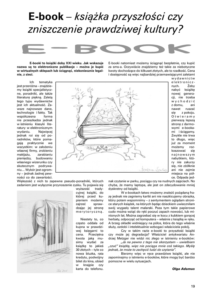 E-book – książka przyszłości czy zniszczenie prawdziwej kultury? E-booki to książki doby XXI wieku. Jak wskazuje nazwa są to elektroniczne publikacje – można je kupić w wirtualnych sklepach lub ściągnąć, niekoniecznie legalnie, z sieci. Ich tematyka jest przeróżna – znajdziemy książki specjalistyczne, poradniki, ale także literaturę piękną. Zaletą tego typu wydawnictw jest ich aktualność. Zawsze najnowsze dane, technologie i fakty. Tak współczesna forma nie przeszkadza jednak w istnieniu klasyki literatury w elektronicznym wydaniu. Najwięcej jednak roi się od poradników, które pomagają praktycznie we wszystkim: w założeniu własnej firmy, zrobieniu makijażu, zarabianiu pieniędzy, budowaniu własnego wizerunku czy skutecznym podrywaniu… Wybór jest ogromny – jednak żadnej pewności co do zawartości. Większość z nich to zapewne pseudo-poradniki, których zadaniem jest wyłącznie przynoszenie zysku. Tu pojawia się wyższość tradycyjnej książki, do której przed kupieniem możemy zajrzeć sprawdzając jej stronę merytoryczną. Niestety to, co często oddala od kupna w prawdziwej księgarni to cena. Przeciętna kwota jaką musimy wydać za książkę to jakieś 30 złotych – tyle co nowa bluzka, rata kredytu, podwójny bilet do kina, obiad w knajpie czy karta do telefonu. E-booki natomiast możemy ściągnąć bezpłatnie, czy kupić za sms-a. Oczywiście znajdziemy też takie za niebotyczne kwoty dochodzące do kilkuset złotych, ale to rzadkość. Cena i dostępność są więc najbardziej przemawiającymi zaletami wydawnictw elektronicznych. Żeby nabyć książkę nowej generacji, nie trzeba wychodzić z domu, ani nawet ruszać się z pokoju. Otwieramy pierwszą lepszą stronę z darmowymi e-bookami i ściągamy. Zwykle nie trwa to długo, więc już za moment możemy rozkoszować się najnowszym nabytkiem, który nie zakurzy się, nie zżółknie ani nie zajmie miejsca na półce. Odpada jednak czytanie w parku, pociągu czy na nudnych zajęciach. No chyba, że mamy laptopa, ale jest on zdecydowanie mniej dyskretny od książki. W e-bookach łatwo możemy znaleźć pożądaną frazę jednak nie zagniemy kartki ani nie naszkicujemy obrazka, który potem wspomnimy – z sentymentem oglądam stronice starych książek, na których będąc dzieckiem uwieczniłam swój wygasły talent malarski. Poza tym takie papierowe cudo można wziąć do ręki poczuć zapach nowości, lub minionych lat. Można zagrzebać się w kocu z kubkiem gorącej herbaty, odpocząć od komputera – właśnie z książką w ręku. A brzeg okładki widniejący na półce, która do tego właśnie służy, ozdobi i intelektualnie wzbogaci właściciela pokój. Czy w takim razie e-booki to przyszłość książki czy może jej degradacja? Właściciel antykwariatu Andrzej Metzger nie widzi nic złego w istnieniu e-booków: „Ja na pewno z tego nie skorzystam – uwielbiam „czuć” książkę, więc nie pociąga mnie coś takiego. Myślę jednak, że może to zachęcić ludzi do czytania”. Bierzmy więc w ręce prawdziwe książki, ale nie zapominajmy o istnieniu e-booków, które mogą być bardzo pomocne w wielu sytuacjach. Olga Adamus 19