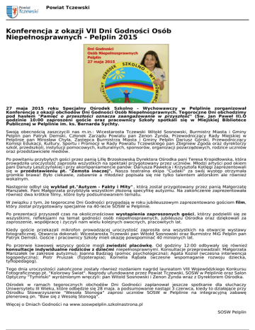 Powiat Tczewski Konferencja z okazji VII Dni Godności Osób Niepełnosprawnych - Pelplin 2015 27 maja 2015 roku Specjalny Ośrodek Szkolno - Wychowawczy w Pelplinie zorganizował Konferencję z okazji obchodów Dni Godności Osób Niepełnosprawnych. Tegoroczne Dni obchodzimy pod hasłem "Pamięć o przeszłości oznacza zaangażowanie w przyszłość" (Św. Jan Paweł II).O godzinie 10:00 zaproszeni goście oraz pracownicy Szkoły spotkali się w Miejskiej Bibliotece Publicznej w Pelplinie im. ks. Bernarda Sychty. Swoją obecnością zaszczycili nas m.in.: Wicestarosta Tczewski Witold Sosnowski, Burmistrz Miasta i Gminy Pelplin pan Patryk Demski, Członek Zarządu Powiatu pan Zenon Żynda, Przewodniczący Rady Miejskiej w Pelplinie pan Mirosław Chyła, Zastępca Burmistrza Miasta i Gminy Pelplin Dariusz Górski, Przewodniczący Komisji Edukacji, Kultury, Sportu i Promocji w Rady Powiatu Tczewskiego pan Zbigniew Zgoda oraz dyrektorzy szkół, przedszkoli, instytucji pomocowych, kulturalnych, sponsorów, organizacji pozarządowych, rodzice uczniów oraz przedstawiciele mediów. Po powitaniu przybyłych gości przez panią Lillę Brzoskowską Dyrektora Ośrodka pani Teresa Kropidłowska, która prowadziła uroczystość zaprosiła wszystkich na spektakl przygotowany przez uczniów. Młodzi artyści pod okiem pani Danuty Leszczyńskiej i przy akompaniamencie panów: Dariusza Pawelca i Krzysztofa Kotlęgi zaprezentowali się w przedstawieniu pt. "Zemsta inaczej". Nasza teatralna ekipa "Cudaki" za swój występ otrzymała gromkie brawa! Było ciekawie, zabawnie a młodzież popisała się nie tylko talentem aktorskim ale również wokalnym. Następnie odbył się wykład pt."Autyzm - Fakty i Mity" , która został przygotowany przez panią Małgorzatę Marszałek. Pani Małgorzata przybliżyła wszystkim złożoną specyfikę autyzmu. Na zakończenie zaprezentowała również dwa krótkie filmy, które były podsumowaniem tematu. W związku z tym, że tegoroczne Dni Godności przypadają w roku jubileuszowym zaprezentowano gościom film, który został przygotowany specjalnie na 40-lecie SOSW w Pelplinie. Po prezentacji przyszedł czas na okolicznościowe wystąpienia zaproszonych gości, którzy podzielili się ze wszystkimi, refleksjami na temat godności osób niepełnosprawnych, jubileuszu Ośrodka oraz dziękowali za zaproszenie, współpracę i życzyli nam wielu kolejnych owocnych, pracowitych lat. Kiedy goście przekazali mikrofon prowadzącej uroczystość zaprosiła ona wszystkich na otwarcie wystawy fotograficznej. Otwarcia dokonali: Wicestarosta Tczewski pan Witold Sosnowski oraz Burmistrz MiG Pelplin pan Patryk Demski. Goście i pracownicy Szkoły mieli okazję powspominać 40 minionych lat. Po przerwie kawowej wszyscy goście mogli zwiedzić placówkę. Od godziny 12:00 odbywały się również konsultacje indywidualne rodziców z dziećmi niepełnosprawnymi. Konsultacje przeprowadzali: Małgorzata Marszałek (w zakresie autyzmu); Joanna Badziąg (pomoc psychologiczna); Agata Kozioł (wczesna interwencja logopedyczna); Piotr Pruszak (fizjoterapia); Kornelia Rąbała (wczesne wspomaganie rozwoju dziecka, tyflopedagog). Tego dnia uroczystości zakończone zostały również rozdaniem nagród laureatom VIII Wojewódzkiego Konkursu Fotograficznego pt. "Kolorowy Świat". Nagrody ufundowane przez Powiat Tczewski, SOSW w Pelplinie oraz Salon Optyczny "Tymiński" wyróżnionym wręczyli: pan Witold Sosnowski i Zenon Żynda wraz z Dyrektorem Ośrodka. Ośrodek w ramach tegorocznych obchodów Dni Godności zaplanował jeszcze spotkanie dla słuchaczy Uniwersytetu III Wieku, które odbędzie się 28 maja. a podsumowanie nastąpi 3 czerwca, kiedy to działające przy Ośrodku Stowarzyszenie "Wesoła Stonoga" zaprosi uczniów SOSW w Pelplinie na integracyjną zabawę plenerową pn. "Baw się z Wesołą Stonogą". Więcej o Dniach Godności na www.soswpelplin.szkolnastrona.pl SOSW Pelplin Powiat Tczewski Patronat Honorowy: - Ks. Infułat Tadeusz Brzeziński Proboszcz Parafii Katedralnej w Pelplinie - Tadeusz Dzwonkowski - Starosta Tczewski - Patryk Demski - Burmistrz Miasta i Gminy Pelplin Partnerzy: - Miejska Biblioteka Publiczna im. ks. Bernarda Sychty w Pelplinie - Dom Pomocy Społecznej w Rudnie - Pomorska Liga Tenisa Stołowego Osób Niepełnosprawnych - Stowarzyszenie "Wesoła Stonoga" - Zespół Szkół Ponadgimnazjalnych w Pelplinie Partnerzy medialni: - "Radio Głos" - TV-Pelplin - Informator Pelpliński Sponsorzy: - Powiat Tczewski - Miasto i Gmina Pelplin - Bank Spółdzielczy w Skórczu Oddział w Pelplinie - Masarnia Rąbała - Piekarnia - Ciastkarnia Meler - Salon Optyczny Tomasz Tymiński Konferencja z okazji VII Dni Godności Osób Niepełnosprawnych Pelplin 2015 fot. SOSW Pelplin Powiat Tczewski Powered by TCPDF (www.tcpdf.org)