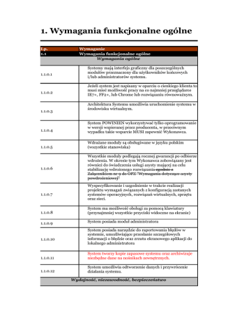 1. Wymagania funkcjonalne ogólne Lp. 1.1 1.1.0.1 1.1.0.2 1.1.0.3 Wymaganie Wymagania funkcjonalne ogólne Wymagania ogólne Systemy mają interfejs graficzny dla poszczególnych modułów przeznaczony dla użytkowników końcowych i/lub administratorów systemu. Jeżeli system jest napisany w oparciu o cienkiego klienta to musi mieć możliwość pracy na co najmniej przeglądarce IE7+, FF2+, lub Chrome lub rozwiązaniu równoważnym. Architektura Systemu umożliwia uruchomienie systemu w środowisku wirtualnym. 1.1.0.4 System POWINIEN wykorzystywać tylko oprogramowanie w wersji wspieranej przez producenta, w przeciwnym wypadku takie wsparcie MUSI zapewnić Wykonawca. 1.1.0.5 Wdrażane moduły są obsługiwane w języku polskim (wszystkie stanowiska) 1.1.0.6 1.1.0.7 Wszystkie moduły podlegają rocznej gwarancji po odbiorze wdrożenia. W okresie tym Wykonawca zobowiązany jest również do świadczenia usługi asysty mającej na celu stabilizację wdrożonego rozwiązania zgodnie z Załącznikiem nr 9 do OPZ "Wymagania dotyczące asysty powdrożeniowej" Wyspecyfikowanie i uzgodnienie w trakcie realizacji projektu wymagań związanych z konfiguracją zastanych systemów operacyjnych, rozwiązań wirtualnych, sprzętu oraz sieci. 1.1.0.8 System ma możliwość obsługi za pomocą klawiatury (przynajmniej wszystkie przyciski widoczne na ekranie) 1.1.0.9 System posiada moduł administratora 1.1.0.10 System posiada narzędzie do raportowania błędów w systemie, umożliwiające przesłanie szczegółowych informacji o błędzie oraz zrzutu ekranowego aplikacji do lokalnego administratora 1.1.0.11 System tworzy kopie zapasowe systemu oraz archiwizuje niezbędne dane na nośnikach zewnętrznych. 1.1.0.12 System umożliwia odtworzenie danych i przywrócenie działania systemu. Wydajność, niezawodność, bezpieczeństwo 1.1.0.13 1.1.0.14 1.1.0.15 1.1.0.16 1.1.0.17 1.1.0.18 1.1.0.19 Rozwiązanie działające z wykorzystaniem rozwiązań wirtualizacyjnych takich jak VMWare ESX lub wyższej, Hyper-V 2 lub wyższej, lub równoważne. Zapewnienie wydajności poprzez zastosowanie równoważenia obciążenia pomiędzy wiele procesorów, komputerów, dysków, połączeń sieciowych lub innych zasobów (load balancing), między innymi poprzez wpsółpracę z mechanizmami wirtualizacyjnymi. Dostarczenie i zaimplementowanie polityki zarządzania automatycznie wykonywanymi kopiami bezpieczeństwa danych systemowych, oprogramowania oraz baz danych i dokumentów Dostarczenie i zainstalowanie na serwerach oprogramowania systemowego z systemem bezpieczeństwa opartym na protokole LDAP w implementacji zgodnej z usługami katalogowymi dostosowanymi do środowiska informatycznego już funkcjonującego u Zamawiającego Możliwość automatycznego monitorowania (np. wysyłanie alertów) dla zdefiniowanych kryteriów określających graniczne wartości krytyczne np. powyżej 90% zajętości dysku itp. System MUSI zapewniać mechanizmy umożliwiające automatyczną lub pół-automatyczną aktualizację oprogramowania, w szczególności MUSI pozwalać na naprawę błędów związanych z bezpieczeństwem. Interfejsy systemu MUSZĄ wykorzystywać do działania powszechnie znane, stosowane i udokumentowane mechanizmy komunikacji międzysystemowej, takie jak np. Webservice, SOAP, XML etc. Jeżeli konieczne jest wykorzystanie protokołów binarnych lub takich, których użycie może podlegać ograniczeniom, np. protokołów własnościowych („proprietary”), opatentowanych lub w inny sposób zastrzeżonych to konieczne jest każdorazowe uzyskanie pisemnej zgody od Zamawiającego na takie odstępstwo architektoniczne. Wymagania dotyczące niezawodności systemu jako całości 1.1.0.20 1.1.0.21 Transakcyjność systemu gwarantująca spójny obraz informacji z poziomu dowolnej stacji roboczej, nawet w czasie intensywnych operacji zmieniających dane uwzględniając ograniczoną przepustowość łącza oraz cache na stacjach roboczych. Zgodność transakcji w systemie ze standardem ACID (atomowość, spójność, izolacja, trwałość), gwarantująca wydajną, ciągłą i niezawodną pracę systemu. 1.1.0.22 Możliwość monitorowania obciążenia systemu oraz jego dostrajanie do bieżącej liczby użytkowników, liczby zapisywanych dokumentów i wykonywanych operacji przetwarzania. Wymagania dotyczące bezpieczeństwa systemu jako całości 1.1.0.23 1.1.0.23.1 1.1.0.24 1.1.0.24.1 1.1.0.24.2 1.1.0.24.3 1.1.0.24.4 1.1.0.24.5 1.1.0.25 1.1.0.25.1 Założenia ogólne Producent oprogramowania dba o ciągły rozwój produktu funkcjonalny i technologiczny. Oprogramowanie systemu Oprogramowanie POWINNO być uruchomione z minimalnymi uprawnieniami, które są konieczne do jego poprawnego funkcjonowania. W szczególności oprogramowanie NIE POWINNO być uruchamiane z uprawnieniami administratora (root'a lub administratora). Tam gdzie to możliwe, MUSZĄ być wykorzystywane mechanizmy separacji uprawnień. W Systemie NIE POWINNO być zainstalowane, ani tym bardziej uruchomione oprogramowanie, które nie jest konieczne do poprawnej realizacji wymagań funkcjonalnych, biznesowych lub zadań związanych z administracją systemem. W Systemie POWINNY być wdrożone wszystkie udostępniane przez dostawców oprogramowania Aktualizacje Bezpieczeństwa starsze niż 30 dni roboczych dla wszystkich składników oprogramowania (w tym także oprogramowania systemowego, firmware oraz sterowników). System jest odporny na typowe ataki typu DoS, SQL Injection, XSS, man in the middle, lub analogiczne. Oprogramownie nie posiada furtek programistycznych umożliwiających obejście typowych mechanizmów uwierzytelnienia i autoryzacji (tzw. back-doors). Dostęp do sieci IP i ruch sieciowy System MUSI być umieszczony w oddzielnym (przeznaczonym wyłącznie dla niego) segmencie sieci fizycznym lub logicznym (VLAN). Jeżeli uzyskanie takiej architektury jest niemożliwe albo nieefektywne to konieczne jest każdorazowe uzyskanie pisemnej zgody od Zamawiaj