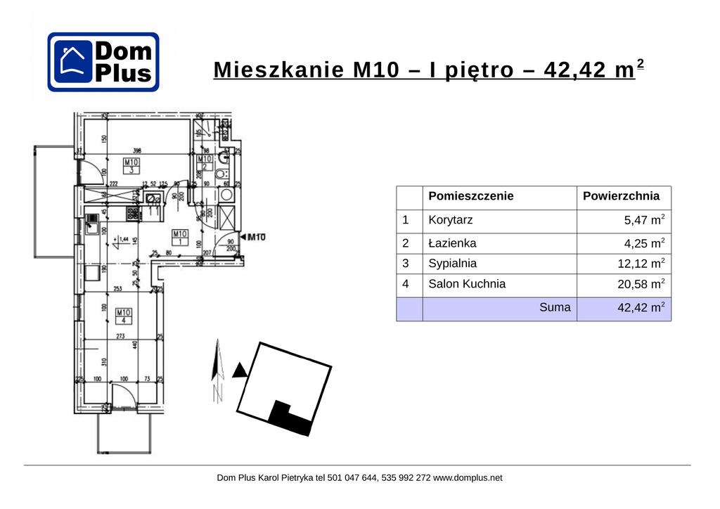 Mieszkanie M10 – I piętro – 42,42 m 2 Pomieszczenie Powierzchnia 1 Korytarz 5,47 m2 2 Łazienka 4,25 m2 3 Sypialnia 12,12 m2 4 Salon Kuchnia 20,58 m2 Suma Dom Plus Karol Pietryka tel 501 047 644, 535 992 272 www.domplus.net 42,42 m2