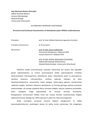 mgr Katarzyna Bocian-Ostrzycka Zakład Genetyki Bakterii Instytut Mikrobiologii Wydział Biologii Uniwersytet Warszawski AUTOREFERAT ROZPRAWY DOKTORSKIEJ Structural and functional characteristics of Helicobacter pylori HP0231 oxidoreductase Promotor: prof. dr hab. Elżbieta Katarzyna Jagusztyn-Krynicka Promotor pomocniczy: dr Anna Łasica Recenzenci: prof. dr hab. Iwona Fijałkowska Pracownia Mutagenezy i Reperacji DNA Instytut Biochemii i Biofizyki PAN prof. dr hab. Jolanta Zakrzewska-Czerwińska Zakład Mikrobiologii Molekularnej, Wydział Biotechnologii, Uniwersytet Wrocławski Obiektem badań prezentowanej rozprawy doktorskiej był system Dsb (disulfide bond) odpowiedzialny za zmiany potranslacyjne białek (wprowadzanie mostków disiarczkowych) mikroorganizmu Helicobacter pylori. Helicobacter pylori to gramujemna, spiralnie skręcona, mikroaerofilna, ruchliwa pałeczka należąca do klasy Epsilonproteobacteria, powszechny ludzki patogen kolonizujący głównie powierzchnię nabłonka żołądka. Skutkiem zakażenia Helicobacter są choroby górnego odcinka przewodu pokarmowego: od ostrego zapalenia błony śluzowej żołądka, poprzez zapalenia przewlekłe, które następnie mogą doprowadzić do rozwoju choroby wrzodowej. Następstwem chronicznych infekcji może być rozwój choroby nowotworowej żołądka (adenocarcinoma), dlatego też, WHO zaliczyła H. pylori do I klasy karcinogenów. Wiele czynników wirulencji licznych bakterii patogennych to białka pozacytoplazmatyczne zawierające więcej niż jedną resztę cysteinową. Dla osiągnięcia właściwej struktury wymagają wprowadzania mostków disiarczkowych pomiędzy grupami -SH reszt cysteinowych. W komórkach Escherichia coli białka Dsb działają na terenie peryplazmy, w dwóch szlakach metabolicznych: utleniania (EcDsbA, EcDsbB) i izomeryzacji/redukcji (głównie EcDsbC i EcDsbD). Dodatkowym elementem systemu Dsb E. coli jest białko DsbG. Główna oksydoreduktaza wprowadzająca mostki disiarczkowe do białek w komórkach wielu gatunków bakterii to monomeryczne białko DsbA. Obiektem badań opisanych w prezentowanej rozprawie jest białko HP0231 Helicobacter pylori, unikatowa dimeryczna tiolowa oksydoreduktaza, funkcjonalny odpowiednik monomerycznego DsbA. Jednak w literaturze, początkowo zostało ono opisane jako białko DsbG. Aby lepiej zrozumieć proces oksydacyjnego zwijania białek H. pylori w prezentowanej rozprawie przeprowadzono eksperymenty mające na celu: (1) poznanie filogenezy białka HP0231, (2) określenie właściwości biochemicznych białka, (3) ustalenie roli kluczowych aminokwasów budujących centrum katalityczne oraz (4) określenie roli domeny dimeryzacyjnej HP0231. Przeprowadzone analizy filogenetyczne wykazały, iż ewolucyjnie domena katalityczna HP0231 jest najbliżej spokrewniona z domeną katalityczną EcDsbG choć posiada motywy typowe dla klasycznych DsbA klasy I (np. EcDsbA). Na poziomie strukturalnym domeny katalityczne zarówno białka HP0231 jak i DsbG są najbardziej zbliżone do domen katalitycznych białek DsbA klasy II (np. MtbDsbA – DsbA Mycobacterium tuberculosis). Przeprowadzone badania właściwości biochemicznych HP0231 wykazały, że HP0231 jest tiolową oksydoreduktazą o aktywności oksydacyjnej posiadającą dodatkowo właściwości białka opiekuńczego (podobnie jak EcDsbC/G), ale bez właściwości izomeryzacyjnych, które są charakterystyczne dla EcDsbC. Poznanie roli domeny dimeryzacyjnej oraz kluczowych aminokwasów motywu katalitycznego wymagało skonstruowania hybrydowych białek, skróconego białka HP0231 (HP0231m) pozbawionego domeny dimeryzacyjnej oraz szczepów kodujących punktowo zmienione HP0231. Wiadomo, że kluczowe znaczenie dla funkcji oksydoreduktaz mają dwie aminokwasowe reszty cysteiny tworzące charakterystyczny motyw aktywny CXXC oraz aminokwasowa reszta cis-proliny. Skonstruowane mutanty punktowe dotyczyły aminokwasów zarówno motywu CXXC (zamiana motywu charakterystycznego dla HP0231 na motyw EcDsbG/C) jak i aminokwasu poprzedzającego prolinę w pętli cis-Pro (zamiana VcP na TcP). Przeprowadzone badania potwierdziły aktywność oksydacyjną HP0231 oraz funkcjonowanie badanej proteiny jako białka opiekuńczego. Aktywność „chaperonowa” jest niezależna od aktywności oksydacyjnej oraz struktury trzeciorzędowej. Wykazano, że kluczową rolę w funkcjonowaniu HP0231 pełni motyw cis-Pro oraz udokumentowano, że niewielkie zmiany motywów centrum aktywnego przekształcają HP0231 o aktywności oksydazy w białko dwufunkcyjne. W badaniu funkcji hybrydowych białek w komórkach natywnego gospodarza funkcjonalne były wyłącznie warianty HP0231 zawierające natywną domenę dimeryzacyjną, co wskazuje, że struktura trzeciorzędowa HP0231 warunkuje rozpoznanie substratów. Otrzymane wyniki wskazują, że domena dimeryzacyjna białka HP0231 jest kluczowa dla zachowania jego aktywności w komórkach natywnego gospodarza. Ta nietypowa oksydoreduktaza pełni zarówno funkcje oksydazy wprowadzającej mostki disiarczkowe, jak i białka opiekuńczego. Struktura dimeru nie jest niezbędna dla aktywności HP0231 jako białka opiekuńczego, natomiast proces wprowadzania mostków disiarczkowych w komórkach H. pylori jest warunkowany zarówno przez obecność odpowiedniego motywu katalitycznego jak i przez trzeciorzędową strukturę białka HP0231. W skład prezentowanej rozprawy doktorskiej wchodzą następujące publikacje: 1. Katarzyna M. Bocian-Ostrzycka, Anna M. Łasica, Stanisław Dunin-Horkawicz, Magdalena J. Grzeszczuk, Karolina Drabik, Aneta M. Dobosz, Renata Godlewska, Elżbieta Nowak, Jean-François Collet, Elżbieta K. Jagusztyn-Krynicka (2015) Functional and evolutionary analyses of Helicobacter pylori HP0231 (DsbK) protein with strong oxidative and chaperone activity characterized by a highly diverged dimerization domain. Frontiers in Microbiology, 6:1065. 2. Katarzyna M. Bocian-Ostrzycka, Magdalena J. Grzeszczuk, Anna M. Banaś, 