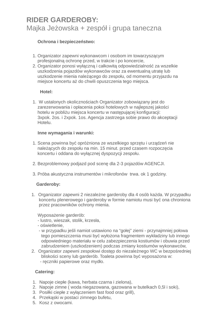 RIDER GARDEROBY: Majka Jeżowska + zespół i grupa taneczna Ochrona i bezpieczeństwo: 1. Organizator zapewni wykonawcom i osobom im towarzyszącym profesjonalną ochronę przed, w trakcie i po koncercie, 2. Organizator ponosi wyłączną i całkowitą odpowiedzialność za wszelkie uszkodzenia pojazdów wykonawców oraz za ewentualną utratę lub uszkodzenie mienia należącego do zespołu, od momentu przyjazdu na miejsce koncertu aż do chwili opuszczenia tego miejsca. Hotel: 1. W ustalonych okolicznościach Organizator zobowiązany jest do zarezerwowania i opłacenia pokoi hotelowych w najlepszej jakości hotelu w pobliżu miejsca koncertu w następującej konfiguracji: 3xpok. 2os. i 2xpok. 1os. Agencja zastrzega sobie prawo do akceptacji Hotelu. Inne wymagania i warunki: 1. Scena powinna być opróżniona ze wszelkiego sprzętu i urządzeń nie należących do zespołu na min. 15 minut. przed czasem rozpoczęcia koncertu i oddana do wyłącznej dyspozycji zespołu. 2. Bezproblemowy podjazd pod scenę dla 2-3 pojazdów AGENCJI. 3. Próba akustyczna instrumentów i mikrofonów trwa. ok 1 godziny. Garderoby: 1. Organizator zapewni 2 niezależne garderoby dla 4 osób każda. W przypadku koncertu plenerowego i garderoby w formie namiotu musi być ona chroniona przez pracowników ochrony mienia. Wyposażenie garderób: - lustro, wieszak, stolik, krzesła, - oświetlenie, - w przypadku jeśli namiot ustawiono na “gołej” ziemi - przynajmniej połowa tego pomieszczenia musi być wyłożona fragmentem wykładziny lub innego odpowiedniego materiału w celu zabezpieczenia kostiumów i obuwia przed zabrudzeniem (uszkodzeniem) podczas zmiany kostiumów wykonawców, 2. Organizator zapewni zespołowi dostęp do niezależnego WC w bezpośredniej bliskości sceny lub garderób. Toaleta powinna być wyposażona w: - ręczniki papierowe oraz mydło. Catering: 1. 2. 3. 4. 5. Napoje ciepłe (kawa, herbata czarna i zielona), Napoje zimne ( woda niegazowana, gazowana w butelkach 0,5l i soki), Posiłki ciepłe z wyłączeniem fast food oraz grill), Przekąski w postaci zimnego bufetu, Kosz z owocami. W przypadku niespełnienia powyższych warunków, zespół ma prawo odmowy wykonania pracy (koncertu), zaś Organizator zobowiązany jest do wypłacenia Agencji redART pełnej kwoty, na jaką opiewa podpisania UMOWA KONCERTOWA. AKCEPTUJĘ POWYŻSZE WARUNKI I ZOBOWIĄZUJĘ SIĘ DO ICH REALIZACJI ............ ... ............................................. . Czytelny podpis Organizatora lub osoby upoważnionej do reprezentowania Organizatorów imprezy www.majkajezowska.pl Data facebook.com/majkajezowska