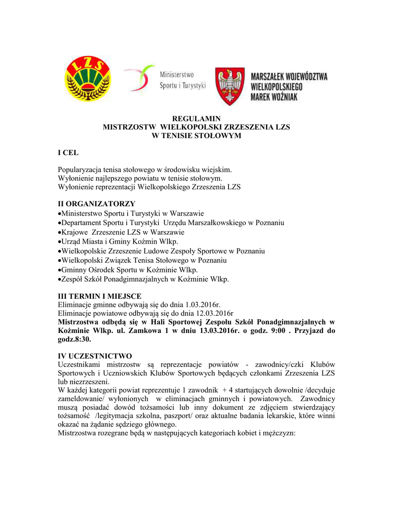 REGULAMIN MISTRZOSTW WIELKOPOLSKI ZRZESZENIA LZS W TENISIE STOŁOWYM I CEL Popularyzacja tenisa stołowego w środowisku wiejskim. Wyłonienie najlepszego powiatu w tenisie stołowym. Wyłonienie reprezentacji Wielkopolskiego Zrzeszenia LZS II ORGANIZATORZY Ministerstwo Sportu i Turystyki w Warszawie Departament Sportu i Turystyki Urzędu Marszałkowskiego w Poznaniu Krajowe Zrzeszenie LZS w Warszawie Urząd Miasta i Gminy Koźmin Wlkp. Wielkopolskie Zrzeszenie Ludowe Zespoły Sportowe w Poznaniu Wielkopolski Związek Tenisa Stołowego w Poznaniu Gminny Ośrodek Sportu w Koźminie Wlkp. Zespół Szkół Ponadgimnazjalnych w Koźminie Wlkp. III TERMIN I MIEJSCE Eliminacje gminne odbywają się do dnia 1.03.2016r. Eliminacje powiatowe odbywają się do dnia 12.03.2016r Mistrzostwa odbędą się w Hali Sportowej Zespołu Szkół Ponadgimnazjalnych w Kożminie Wlkp. ul. Zamkowa 1 w dniu 13.03.2016r. o godz. 9:00 . Przyjazd do godz.8:30. IV UCZESTNICTWO Uczestnikami mistrzostw są reprezentacje powiatów - zawodnicy/czki Klubów Sportowych i Uczniowskich Klubów Sportowych będących członkami Zrzeszenia LZS lub niezrzeszeni. W każdej kategorii powiat reprezentuje 1 zawodnik + 4 startujących dowolnie /decyduje zameldowanie/ wyłonionych w eliminacjach gminnych i powiatowych. Zawodnicy muszą posiadać dowód tożsamości lub inny dokument ze zdjęciem stwierdzający tożsamość /legitymacja szkolna, paszport/ oraz aktualne badania lekarskie, które winni okazać na żądanie sędziego głównego. Mistrzostwa rozegrane będą w następujących kategoriach kobiet i mężczyzn: Młodzik Kadet Junior Senior ur. 2003 i młodsze/si ur.2001-2002 ur.1998-2000 ur. 1997 starsze/si V ZGŁOSZENIA Zgłoszenia ilościowe przyjmowane są w WZ LZS Poznań ul.Oś.Tysiąclecia 4 61-255 Poznań do dnia 10.03.2016r. mail:[email protected] Zgłoszenia imienne do dnia 11.03.2016r. na adres: [email protected] według wzoru: Powiat.................................................................. Lp. Imię i nazwisko Data urodzenia kat. wiekowa powiat klub VI SPOSÓB PRZEPROWADZENIA Sposób przeprowadzenia mistrzostw zostanie ustalony po otrzymaniu zgłoszeń. VII PUNKTACJA Lok. 1 2 Pkt. 12 10 3 8 4 7 5-6 6 7-8 5 9-12 4 13-16 17-24 25-32 3 2 1 Do klasyfikacji drużynowej powiatów brane będą punkty uzyskane przez wszystkich reprezentantów powiatu w każdej kategorii wiekowej. W przypadku równej ilości punktów uzyskanych przez 2 lub więcej powiaty o kolejności decydują wyższe miejsca zajęte przez zawodników /czki/. VIII NAGRODY Indywidualne za miejsce I-III - medale Drużynowe za miejsce I-VI - puchary IX ZASADY FINANSOWANIA Koszty organizacyjne i nagród w zawodach wojewódzkich pokrywają organizatorzy. Koszty przejazdów na zawody i organizacji imprez gminnych i powiatowych pokrywają zainteresowane gminy i powiaty. X UWAGI KOŃCOWE Za aktualne badania lekarskie odpowiedzialni są kierownicy ekip. Wszelkie sprawy sporne i nie ujęte w niniejszym regulaminie rozstrzygają organizatorzy Uczestnicy imprezy objęci są ubezpieczeniem zbiorowym zawartym przez Wielkopolskie Zrzeszenie Ludowe Zespoły Sportowe w Poznaniu.