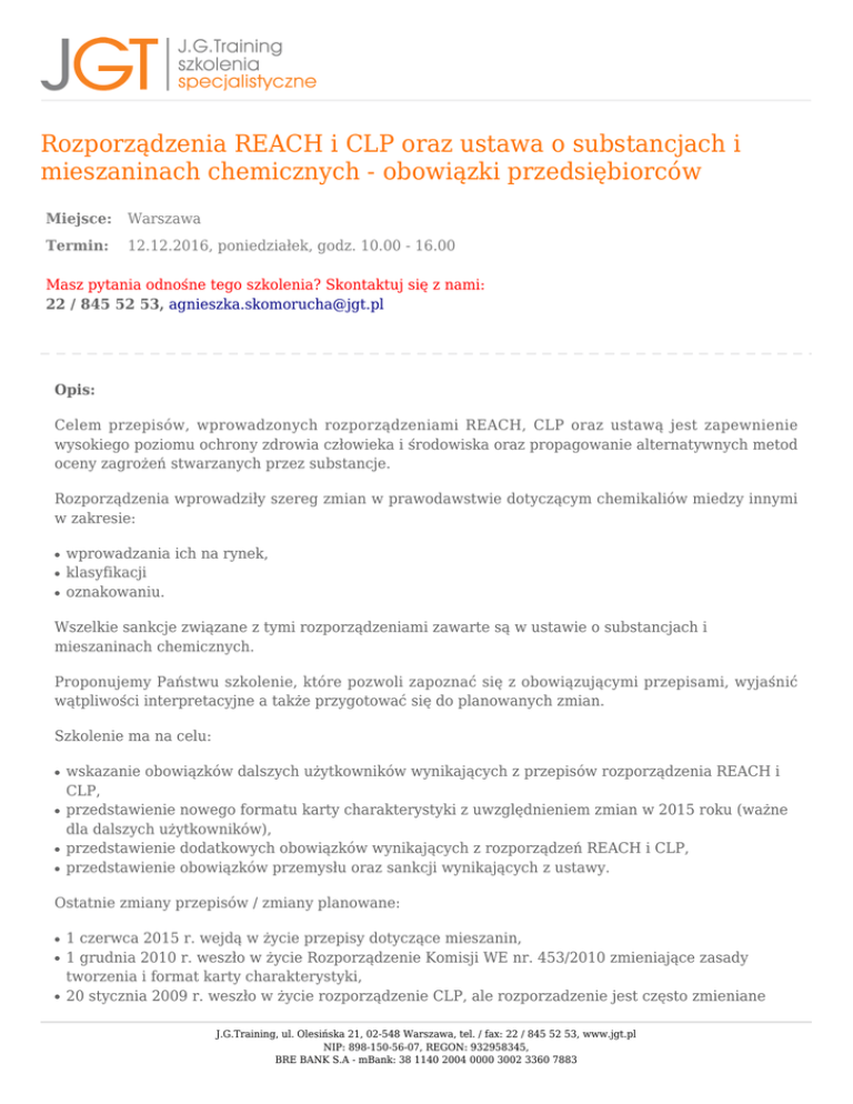 Rozporządzenia REACH i CLP oraz ustawa o substancjach i mieszaninach chemicznych - obowiązki przedsiębiorców Miejsce: Warszawa Termin: 12.12.2016, poniedziałek, godz. 10.00 - 16.00 Masz pytania odnośne tego szkolenia? Skontaktuj się z nami: 22 / 845 52 53, [email protected] Opis: Celem przepisów, wprowadzonych rozporządzeniami REACH, CLP oraz ustawą jest zapewnienie wysokiego poziomu ochrony zdrowia człowieka i środowiska oraz propagowanie alternatywnych metod oceny zagrożeń stwarzanych przez substancje. Rozporządzenia wprowadziły szereg zmian w prawodawstwie dotyczącym chemikaliów miedzy innymi w zakresie: ● ● ● wprowadzania ich na rynek, klasyfikacji oznakowaniu. Wszelkie sankcje związane z tymi rozporządzeniami zawarte są w ustawie o substancjach i mieszaninach chemicznych. Proponujemy Państwu szkolenie, które pozwoli zapoznać się z obowiązującymi przepisami, wyjaśnić wątpliwości interpretacyjne a także przygotować się do planowanych zmian. Szkolenie ma na celu: ● ● ● ● wskazanie obowiązków dalszych użytkowników wynikających z przepisów rozporządzenia REACH i CLP, przedstawienie nowego formatu karty charakterystyki z uwzględnieniem zmian w 2015 roku (ważne dla dalszych użytkowników), przedstawienie dodatkowych obowiązków wynikających z rozporządzeń REACH i CLP, przedstawienie obowiązków przemysłu oraz sankcji wynikających z ustawy. Ostatnie zmiany przepisów / zmiany planowane: ● ● ● 1 czerwca 2015 r. wejdą w życie przepisy dotyczące mieszanin, 1 grudnia 2010 r. weszło w życie Rozporządzenie Komisji WE nr. 453/2010 zmieniające zasady tworzenia i format karty charakterystyki, 20 stycznia 2009 r. weszło w życie rozporządzenie CLP, ale rozporzadzenie jest często zmieniane J.G.Training, ul. Olesińska 21, 02-548 Warszawa, tel. / fax: 22 / 845 52 53, www.jgt.pl NIP: 898-150-56-07, REGON: 932958345, BRE BANK S.A - mBank: 38 1140 2004 0000 3002 3360 7883 ● 1 czerwca 2007 r. weszło w życie rozporządzenie REACH, załączniki do rozporządzenia są często zmieniane. Program: 1. Obowiązki dalszych użytkowników wynikające z rozporządzenia REACH i CLP: przekazywanie informacji, gromadzenie informacji, przechowywanie danych, informowanie Europejskiej Agencji Chemikaliów, śledzenie wszelkich zmian związanych z ograniczeniami i zakazami, przeklasyfikowanie i oznakowanie wynikające z wytycznych rozporządzenia CLP, zmiany w klasyfikacji niektórych substancji – nowe obowiązki, nowe obowiązki wynikające z rozporządzenia CLP. ❍ ❍ ❍ ❍ ❍ ❍ ❍ ❍ 2. Karta charakterystyki po 1 czerwca 2015: nowy format, nowe informacje, okresy przejściowe tylko dla niektórych podmiotów, sposób przekazywania, scenariusze narażenia. ❍ ❍ ❍ ❍ ❍ 3. Procedura udzielania zezwoleń: substancje SVHC, lista kandydacka, lista priorytetowa, substancje z załącznika XIV, kto powinien się starać o zezwolenie, niebezpieczna procedura dla przedsiębiorstw, dlaczego w głównej mierze dotknie dalszych użytkowników, koszty. ❍ ❍ ❍ ❍ ❍ ❍ ❍ ❍ 4. Podstawowe zagadnienia ustawy o substancjach chemicznych i ich mieszaninach: ❍ ❍ ❍ ❍ ❍ zastosowanie ustawy, informowanie Inspektora ds. Substancji Chemicznych – proponowane zmiany, akty wykonawcze do ustawy, organy nadzoru oraz ich kompetencje, wybrane kary: związane z nieprzestrzeganiem przepisów ustawy, związane z nieprzestrzeganiem przepisów rozporządzenia REACH, związane z nieprzestrzeganiem przepisów rozporządzenia CLP. 5. Pytania, dyskusja, konsultacje. J.G.Training, ul. Olesińska 21, 02-548 Warszawa, tel. / fax: 22 / 845 52 53, www.jgt.pl NIP: 898-150-56-07, REGON: 932958345, BRE BANK S.A - mBank: 38 1140 2004 0000 3002 3360 7883 Wykładowca: Naczelnik Wydz. Krajowego Centrum Informacyjnego ds. REACH i CLP w Departamencie ds. Substancji i Mieszanin Niebezpiecznych w Biurze do Spraw Substancji Chemicznych. Zajmuje się sprawami dotyczącymi rozporządzenia REACH, klasyfikacją i oznakowaniem chemikaliów. Ponadto Reprezentuje Krajowe Centrum Informacyjnego ds. REACH (Polski Helpdesk ds. REACH) w unijnej sieci REACH HELP NET, która działa w ramach ECHA (Europejskiej Agencji Chemikaliów) w Helsinkach. Jest członkiem grupy roboczej Komisji Europejskiej w sprawie Klasyfikacji i Oznakowania Niebezpiecznych Substancji w Europejskim Biurze Chemicznym, członkiem Grupy Roboczej dot. Niebezpiecznych Preparatów oraz uczestnikiem spotkań Grupy Roboczej, która stanowi jednostkę pomocniczą dla Komisji Europejskiej w zagadnieniach dotyczących Dyrektywy Preparatowej. Współpracuje z przemysłem w sprawie ustawodawstwa chemicznego głownie klasyfikacji, oznakowania, kart charakterystyki oraz wypełniania wytycznych rozporządzenia REACH. Miejsce: Miejsce szkolenia zlokalizowane w centrum Warszawy, czas dojazdu tramwajem z Dworca Centralnego - około 5 minut. Na 4 dni robocze przed planowanym terminem szkolenia skontaktujemy się z Państwem i przekażemy szczegółowe informacje na temat lokalizacji szkolenia. Hotele w pobliżu miejsca szkolenia: Hotel Campanile, ul. Towarowa 2, Warszawa Cena noclegu zależy od terminu i wolnych miejsc w Hotelu. Koszt od 279 zł (jedynka ze śniadaniem), tel. 22 582 72 00, http://www.campanile-warszawa.pl/pl Hotel Golden Tulip, ul. Towarowa 2, Warszawa Cena noclegu zależy od terminu i wolnych miejsc w Hotelu. Koszt od 315 zł (jedynka ze śniadaniem), tel. 22 582 75 00, http://www.goldentulipwarsawcentre.com/pl Hotel Premiere Classe, ul. Towarowa 2, Warszawa Cena noclegu zależy od terminu i wolnych miejsc w Hotelu. Koszt od 177 zł (jedynka ze śniadaniem), tel. 22 624 08 00, http://www.premiere-classe-warszawa.pl/pl J.G.Training, ul. Olesińska 21, 02-548 Warszawa, tel. / fax: 22 / 845 52 53, www.jgt.pl NIP: 898-150-56-07, REGON: 932958345, BRE BANK S.A - mBank: 38 1140 2004 0000 3002 3360 7883 Cena: 590,00 zł + 23% VAT = 725,70 zł brutto 590,00 zł + VAT zw = 590,00 zł brutto - w przypadk