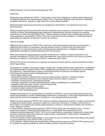 Międzynarodowe warunki ograniczonej gwarancji Tefal