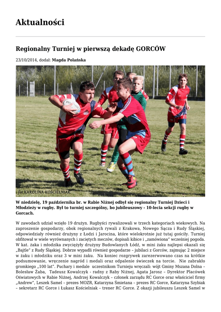 Aktualności Regionalny Turniej w pierwszą dekadę GORCÓW 23/10/2014, dodał: Magda Polańska W niedzielę, 19 października br. w Rabie Niżnej odbył się regionalny Turniej Dzieci i Młodzieży w rugby. Był to turniej szczególny, bo jubileuszowy - 10-lecia sekcji rugby w Gorcach. W zawodach udział wzięło 19 drużyn. Rugbyści rywalizowali w trzech kategoriach wiekowych. Na zaproszenie gospodarzy, obok regionalnych rywali z Krakowa, Nowego Sącza i Rudy Śląskiej, odpowiedziały również drużyny z Łodzi i Jarocina, które wielokrotnie już tutaj gościły. Turniej obfitował w wiele wyrównanych i zaciętych meczów, dopisali kibice i „zamówiona” wcześniej pogoda. W kat. żaka i młodzika zwyciężyły drużyny Budowlanych Łódź, w mini żaku najlepsi okazali się „Bajtle” z Rudy Śląskiej. Dobrze wypadli również gospodarze – jubilaci z Gorców, zajmując 2 miejsce w żaku i młodziku oraz 3 w mini żaku. Na koniec rozgrywek zarezerwowano czas na krótkie podsumowanie, wręczenie nagród i medali oraz odpalenie świeczek na torcie. Nie zabrakło gromkiego „100 lat”. Puchary i medale uczestnikom Turnieju wręczali: wójt Gminy Mszana Dolna – Bolesław Żaba, Tadeusz Kowalczyk - radny z Raby Niżnej, Agata Jarosz – Dyrektor Placówek Oświatowych w Rabie Niżnej, Andrzej Kowalczyk – członek zarządu RC Gorce oraz właściciel firmy „Andrew”, Leszek Samel – prezes MOZR, Katarzyna Śmietana – prezes RC Gorce, Katarzyna Szybiak – sekretarz RC Gorce i Łukasz Kościelniak – trener RC Gorce. Z okazji jubileuszu Leszek Samel w imieniu Małopolskiego Okręgowego Związku Rugby złożył na ręce zarządu RC Gorce życzenia dalszych sukcesów, pogratulował wzorowej pracy oraz wręczył okolicznościową pamiątkę. Życzenia i gratulacje jubilatom złożył również Wójt Bolesław Żaba. Turniej ten stał się również okazją do podziękowania wspierającym nas od lat firmom i osobom prywatnym – podkreślają organizatorzy. Serdecznie dziękujemy wszystkim, którzy przez te 10-lat obdarowali nas wsparciem, a w szczególności właścicielom firm: „Andrew” – Produkcja Drzewna, Zakłady Mięsne Cichański, Piekarnia Marszalik, Silla, Reklama „PePe”, Gracja, Bakoma, Tymbark, Gonga i Stano oraz Zarządom: Banku Spółdzielczego w Mszanie Dolnej i GS Samopomoc Chłopska w Mszanie Dolnej oraz Panu Czesławowi Szynalikowi. Podziękowania kierujemy również do rodziców i innych osób prywatnych zaangażowanych w pracę na rzecz klubu i organizację jubileuszowych zawodów. Turniej zorganizowano dzięki wsparciu Urzędu Gminy Mszana Dolna. Wyniki Turnieju: Młodzik – wyniki: (czas gry 2x20min) Gorce – Sparta/NHRK 87:0 (41:0) Budowlani – Sparta/NHRK 64:0 (26:0) Gorce – Budowlani 0:33 (0:7) Tabela: 1. Budowlani Łódź 6pkt 97:0 2. Gorce Raba Niżna 4pkt 87:0 3. Sparta Jarocin/NHRK 2pkt 0:151 Najlepszy Zawodnik – Igor Białek (Budowlani) Żak – wyniki: Gr. A 1. Budowlani 2. Ruda Śl. 3. NHRK Budowlani – Ruda Śl. 6:1 Budowlani – NHRK 11:0 NHRK – Ruda Śl. 1:10 Tabela: 1. Budowlani Łódź 6pkt 17:1 2. Ruda Śląska 4pkt 11:7 3. NHRK 2pkt 1:21 Gr. B 1. Gorce 2. Sparta 3. Nowy Sącz 4. Lubień Gorce – Sparta 8:4 Nowy Sącz – Lubień 2:4 Gorce – Nowy Sącz 12:0 Sparta – Lubień 1:3 Sparta – Nowy Sącz 5:2 Gorce – Lubień 8:1 Tabela: 1. Gorce Raba Niżna 9pkt 28:5 2. UKS Rugby Lubień 7pkt 8:11 3. Sparta Jarocin 5pkt 10:13 4. Biało- Czarni Nowy Sącz 3pkt 4:21 O miejsce 5: NHRK – Sparta Jarocin 0:3 O miejsce 3: Ruda Śląska – UKS Lubień 9:0 O miejsce 1: Budowlani Łódź – Gorce Raba Niżna 8:0 Końcowa kolejność: 1. Budowlani Łódź 2. Gorce Raba Niżna 3. Rugby Ruda Śląska 4. UKS Rugby Lubień 5. Sparta Jarocin 6. Nowa Huta Rugby Klub 7. Biało – Czarni Nowy Sącz Najlepszy zawodnik – Mateusz Nowak „Cichy” (Budowlani) Mini żak – wyniki: Gr. A 1. Budowlani 2. NHRK 3.Nowy Sącz Budowlani – NHRK 8:1 Budowlani – Nowy Sącz 4:1 NHRK – Nowy Sącz 3:3 Tabela: 1. Budowlani Łódź 6pkt 12:2 2. Nowy Sącz 3pkt 4:7 3. NHRK 3pkt 4:11 Gr. B 1. Gorce 2.SP 17 Nowy Sącz 3. NHRK II Gorce – SP 17 6:0 Gorce – NHRK II 6:0 SP 17 – NHRK 6:0 Tabela: 1. Gorce Raba Niżna 6pkt 12:0 2. SP 17 Nowy Sącz 4pkt 6:6 3. NHRK II 2pkt 0:12 Gr. C 1. Ruda Śl.2. Juvenia Kraków3. Sparta Jarocin Ruda Śl. – Juvenia 2:0 Ruda Śl. – Sparta 2:2 Juvenia – Sparta 2:2 Tabela: 1. Ruda Śląska 5pkt 4:2 2. Sparta Jarocin 4pkt 4:4 3. Juvenia Kraków 3pkt 2:4 O miejsca 7-9 NHRK – NHRK II 3:7 NHRK – Juvenia 1:8 NHRK II – Juvenia 11:0 Tabela: 7. NHRK II 6pkt 18:3 8. Juvenia 4pkt 8:12 9. NHRK 2pkt 4:15 0 miejsca 4-6 Nowy Sącz – SP 17 3:2 Nowy Sącz – Sparta 0:5 SP 17 – Sparta 2:6 Tabela: 4. Sparta Jarocin 6pkt 11:2 5. Nowy Sącz 4pkt 3:7 6. SP 17 2pkt 4:9 O miejsca 1-3 Budowlani – Gorce 3:2 Budowlani – Ruda Śląska 2:5 Gorce – Ruda Śląska 3:4 Tabela: 1. Ruda Śląska 6pkt 9:5 2. Budowlani Łódź 4pkt 5:7 3. Gorce Raba Niżna 2pkt 5:7 Końcowa kolejność: 1. Rugby Ruda Śląska 2. Budowlani Łódź 3. Gorce Raba Niżna 4. Sparta Jarocin 5. Biało – Czarni Nowy Sącz 6. SP 17 Nowy Sącz 7. NHRK II 8. Juvenia Kraków 9. NHRK Najlepszy zawodnik – Patryk Karwot (Ruda Śląska) red. Łukasz Kościelniak fot. Karolina Kościelniak