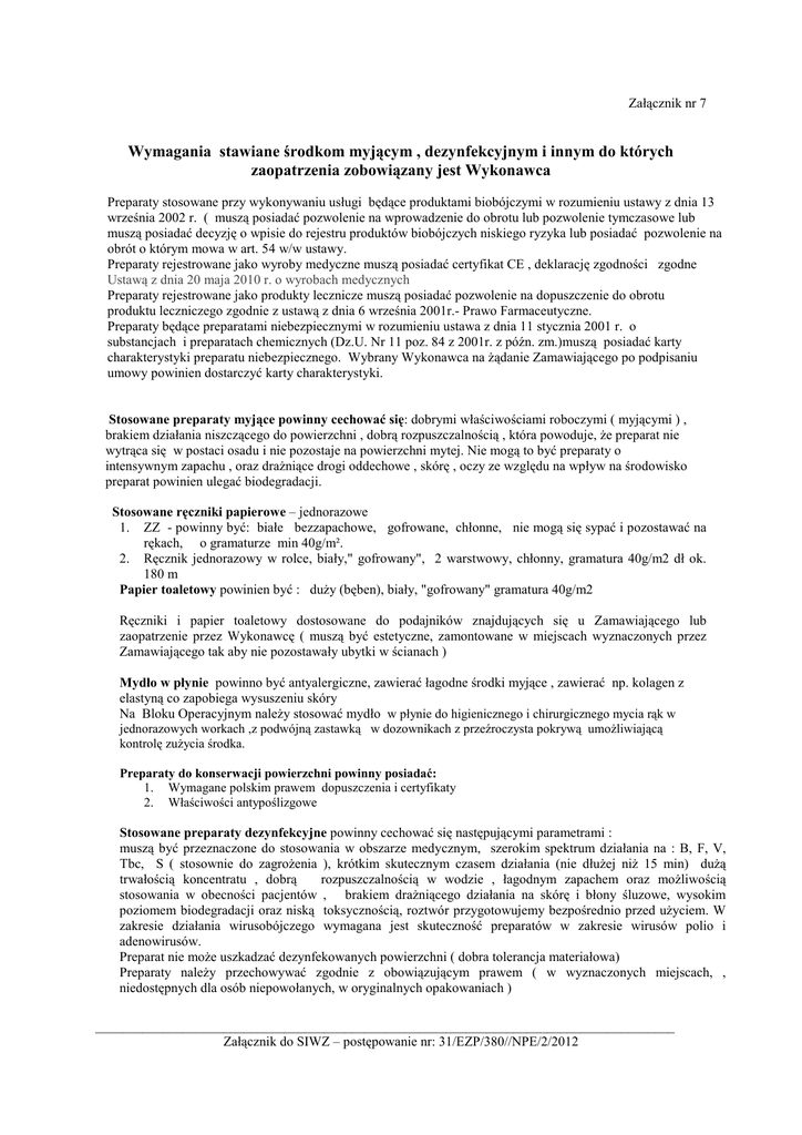 Załącznik nr 7 Wymagania stawiane środkom myjącym , dezynfekcyjnym i innym do których zaopatrzenia zobowiązany jest Wykonawca Preparaty stosowane przy wykonywaniu usługi będące produktami biobójczymi w rozumieniu ustawy z dnia 13 września 2002 r. ( muszą posiadać pozwolenie na wprowadzenie do obrotu lub pozwolenie tymczasowe lub muszą posiadać decyzję o wpisie do rejestru produktów biobójczych niskiego ryzyka lub posiadać pozwolenie na obrót o którym mowa w art. 54 w/w ustawy. Preparaty rejestrowane jako wyroby medyczne muszą posiadać certyfikat CE , deklarację zgodności zgodne Ustawą z dnia 20 maja 2010 r. o wyrobach medycznych Preparaty rejestrowane jako produkty lecznicze muszą posiadać pozwolenie na dopuszczenie do obrotu produktu leczniczego zgodnie z ustawą z dnia 6 września 2001r.- Prawo Farmaceutyczne. Preparaty będące preparatami niebezpiecznymi w rozumieniu ustawa z dnia 11 stycznia 2001 r. o substancjach i preparatach chemicznych (Dz.U. Nr 11 poz. 84 z 2001r. z późn. zm.)muszą posiadać karty charakterystyki preparatu niebezpiecznego. Wybrany Wykonawca na Ŝądanie Zamawiającego po podpisaniu umowy powinien dostarczyć karty charakterystyki. Stosowane preparaty myjące powinny cechować się: dobrymi właściwościami roboczymi ( myjącymi ) , brakiem działania niszczącego do powierzchni , dobrą rozpuszczalnością , która powoduje, Ŝe preparat nie wytrąca się w postaci osadu i nie pozostaje na powierzchni mytej. Nie mogą to być preparaty o intensywnym zapachu , oraz draŜniące drogi oddechowe , skórę , oczy ze względu na wpływ na środowisko preparat powinien ulegać biodegradacji. Stosowane ręczniki papierowe – jednorazowe 1. ZZ - powinny być: białe bezzapachowe, gofrowane, chłonne, nie mogą się sypać i pozostawać na rękach, o gramaturze min 40g/m². 2. Ręcznik jednorazowy w rolce, biały," gofrowany", 2 warstwowy, chłonny, gramatura 40g/m2 dł ok. 180 m Papier toaletowy powinien być : duŜy (bęben), biały, "gofrowany" gramatura 40g/m2 Ręczniki i papier toaletowy dostosowane do podajników znajdujących się u Zamawiającego lub zaopatrzenie przez Wykonawcę ( muszą być estetyczne, zamontowane w miejscach wyznaczonych przez Zamawiającego tak aby nie pozostawały ubytki w ścianach ) Mydło w płynie powinno być antyalergiczne, zawierać łagodne środki myjące , zawierać np. kolagen z elastyną co zapobiega wysuszeniu skóry Na Bloku Operacyjnym naleŜy stosować mydło w płynie do higienicznego i chirurgicznego mycia rąk w jednorazowych workach ,z podwójną zastawką w dozownikach z przeźroczysta pokrywą umoŜliwiającą kontrolę zuŜycia środka. Preparaty do konserwacji powierzchni powinny posiadać: 1. Wymagane polskim prawem dopuszczenia i certyfikaty 2. Właściwości antypoślizgowe Stosowane preparaty dezynfekcyjne powinny cechować się następującymi parametrami : muszą być przeznaczone do stosowania w obszarze medycznym, szerokim spektrum działania na : B, F, V, Tbc, S ( stosownie do zagroŜenia ), krótkim skutecznym czasem działania (nie dłuŜej niŜ 15 min) duŜą trwałością koncentratu , dobrą rozpuszczalnością w wodzie , łagodnym zapachem oraz moŜliwością stosowania w obecności pacjentów , brakiem draŜniącego działania na skórę i błony śluzowe, wysokim poziomem biodegradacji oraz niską toksycznością, roztwór przygotowujemy bezpośrednio przed uŜyciem. W zakresie działania wirusobójczego wymagana jest skuteczność preparatów w zakresie wirusów polio i adenowirusów. Preparat nie moŜe uszkadzać dezynfekowanych powierzchni ( dobra tolerancja materiałowa) Preparaty naleŜy przechowywać zgodnie z obowiązującym prawem ( w wyznaczonych miejscach, , niedostępnych dla osób niepowołanych, w oryginalnych opakowaniach ) ______________________________________________________________________________________ Załącznik do SIWZ – postępowanie nr: 31/EZP/380//NPE/2/2012 Roztwory robocze środków dezynfekcyjnych i myjących naleŜy przygotowywać zgodnie z zaleceniami producenta uŜywając odpowiedniego do poziomu zanieczyszczenia , ściśle zdefiniowanego procedurą stęŜenia roboczego oraz zalecanej przez producenta temp. roztworów roboczych. Naczynia zawierające uŜytkowe roztwory muszą być oznakowane - posiadać ulotkę informacyjna ( nazwa preparatu, stęŜenie, data przygotowania , podpis osoby przygotowującej roztwór). Do dezynfekcji naleŜy uŜywać czystych, zdezynfekowanych i suchych pojemników Podczas przygotowywania roztworów naleŜy stosować środki ochrony osobistej Stosowanie preparatów dezynfekcyjnych za pomocą spryskiwaczy ( bez względu na rodzaj substancji aktywnych) powinna być ograniczona do małych i/lub trudno dostępnych powierzchni W przypadku zagroŜenia prątkami gruźlicy oraz do dezynfekcji brudnych powierzchni nie naleŜy stosować urządzeń spryskujących. Preparaty myjące i dezynfekujące powinny być kompatybilne ( zgodne w zakresie składu chemicznego i ph roztwory robocze ) Wszędzie tam, gdzie to moŜliwe naleŜy uŜywać preparatów myjąco –dezynfekcyjnych Podczas doboru preparatów naleŜy kierować się zasadą uzyskania maksymalnej efektywności działania przy zastosowaniu minimalnych skutecznych stęŜeń roboczych Stosowane preparaty dezynfekcyjne 1. Preparat do dezynfekcji rąk z wyjątkiem bloku operacyjnego Preparat alkoholowy w Ŝelu o właściwościach tiksotropowych przeznaczony do higienicznej i chirurgicznej dezynfekcji rąk, posiadający neutralne pH, nie zawierający barwników i substancji zapachowych , zawierający substancje nawilŜające, które zapobiegają wysuszaniu skóry Przebadany dermatologicznie. Produkt o szerokim zakresie działania - B, Tbc, F, V , ( HIV, HBV, HCV, rotavirus, herpesvirus , wirus grypy ,norovirus poliovirus, adenovirus ) , udokumentowany badaniami wg obowiązujących norm. Inaktywacja wirusa Polio - nie dłuŜej niŜ 30 sekund . W/w preparat powinien 