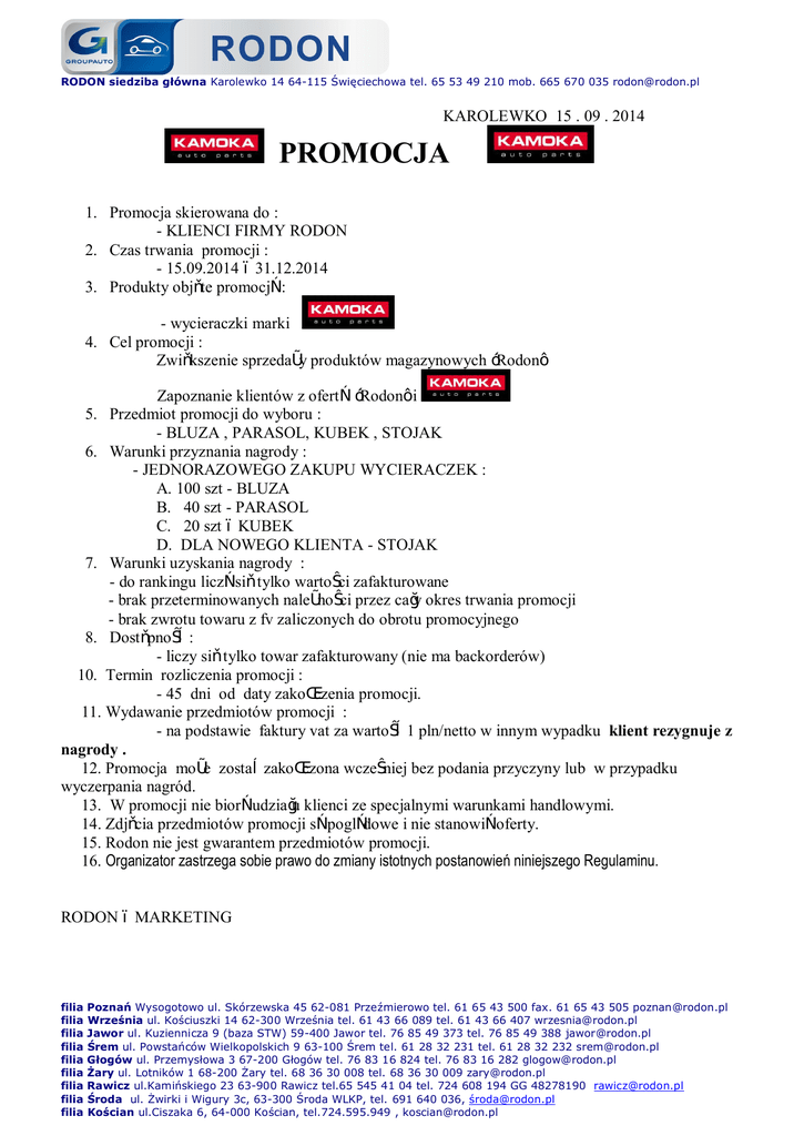 RODON siedziba główna Karolewko 14 64-115 Święciechowa tel. 65 53 49 210 mob. 665 670 035 [email protected] KAROLEWKO 15 . 09 . 2014 PROMOCJA 1. Promocja skierowana do : - KLIENCI FIRMY RODON 2. Czas trwania promocji : - 15.09.2014 – 31.12.2014 3. Produkty objęte promocją : - wycieraczki marki 4. Cel promocji : Zwiększenie sprzedaży produktów magazynowych ‘Rodon’ Zapoznanie klientów z ofertą ‘Rodon’ i 5. Przedmiot promocji do wyboru : - BLUZA , PARASOL, KUBEK , STOJAK 6. Warunki przyznania nagrody : - JEDNORAZOWEGO ZAKUPU WYCIERACZEK : A. 100 szt - BLUZA B. 40 szt - PARASOL C. 20 szt – KUBEK D. DLA NOWEGO KLIENTA - STOJAK 7. Warunki uzyskania nagrody : - do rankingu liczą się tylko wartości zafakturowane - brak przeterminowanych należności przez cały okres trwania promocji - brak zwrotu towaru z fv zaliczonych do obrotu promocyjnego 8. Dostępność : - liczy się tylko towar zafakturowany (nie ma backorderów) 10. Termin rozliczenia promocji : - 45 dni od daty zakończenia promocji. 11. Wydawanie przedmiotów promocji : - na podstawie faktury vat za wartość 1 pln/netto w innym wypadku klient rezygnuje z nagrody . 12. Promocja może zostać zakończona wcześniej bez podania przyczyny lub w przypadku wyczerpania nagród. 13. W promocji nie biorą udziału klienci ze specjalnymi warunkami handlowymi. 14. Zdjęcia przedmiotów promocji są poglądowe i nie stanowią oferty. 15. Rodon nie jest gwarantem przedmiotów promocji. 16. Organizator zastrzega sobie prawo do zmiany istotnych postanowień niniejszego Regulaminu. RODON – MARKETING filia filia filia filia filia filia filia filia filia Poznań Wysogotowo ul. Skórzewska 45 62-081 Przeźmierowo tel. 61 65 43 500 fax. 61 65 43 505 [email protected] Września ul. Kościuszki 14 62-300 Września tel. 61 43 66 089 tel. 61 43 66 407 [email protected] Jawor ul. Kuziennicza 9 (baza STW) 59-400 Jawor tel. 76 85 49 373 tel. 76 85 49 388 [email protected] Śrem ul. Powstańców Wielkopolskich 9 63-100 Śrem tel. 61 28 32 231 tel. 61 28 32 232 [email protected] Głogów ul. Przemysłowa 3 67-200 Głogów tel. 76 83 16 824 tel. 76 83 16 282 [email protected] Żary ul. Lotników 1 68-200 Żary tel. 68 36 30 008 tel. 68 36 30 009 [email protected] Rawicz ul.Kamińskiego 23 63-900 Rawicz tel.65 545 41 04 tel. 724 608 194 GG 48278190 [email protected] Środa ul. Żwirki i Wigury 3c, 63-300 Środa WLKP, tel. 691 640 036, ś[email protected] Kościan ul.Ciszaka 6, 64-000 Kościan, tel.724.595.949 , [email protected]