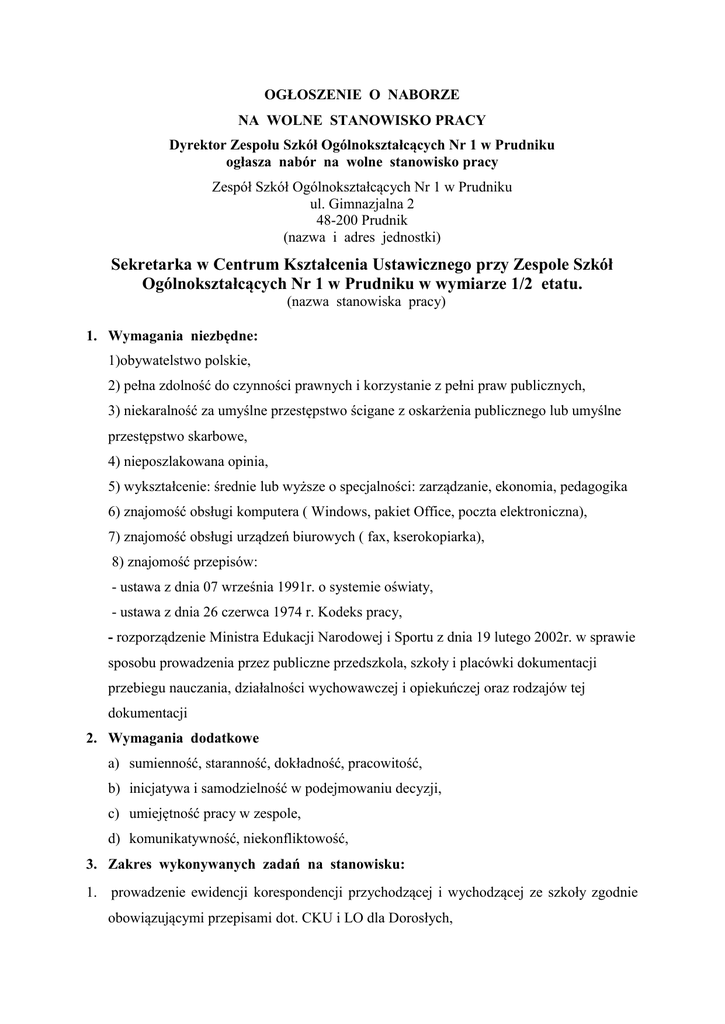 OGŁOSZENIE O NABORZE NA WOLNE STANOWISKO PRACY Dyrektor Zespołu Szkół Ogólnokształcących Nr 1 w Prudniku ogłasza nabór na wolne stanowisko pracy Zespół Szkół Ogólnokształcących Nr 1 w Prudniku ul. Gimnazjalna 2 48-200 Prudnik (nazwa i adres jednostki) Sekretarka w Centrum Kształcenia Ustawicznego przy Zespole Szkół Ogólnokształcących Nr 1 w Prudniku w wymiarze 1/2 etatu. (nazwa stanowiska pracy) 1. Wymagania niezbędne: 1)obywatelstwo polskie, 2) pełna zdolność do czynności prawnych i korzystanie z pełni praw publicznych, 3) niekaralność za umyślne przestępstwo ścigane z oskarżenia publicznego lub umyślne przestępstwo skarbowe, 4) nieposzlakowana opinia, 5) wykształcenie: średnie lub wyższe o specjalności: zarządzanie, ekonomia, pedagogika 6) znajomość obsługi komputera ( Windows, pakiet Office, poczta elektroniczna), 7) znajomość obsługi urządzeń biurowych ( fax, kserokopiarka), 8) znajomość przepisów: - ustawa z dnia 07 września 1991r. o systemie oświaty, - ustawa z dnia 26 czerwca 1974 r. Kodeks pracy, - rozporządzenie Ministra Edukacji Narodowej i Sportu z dnia 19 lutego 2002r. w sprawie sposobu prowadzenia przez publiczne przedszkola, szkoły i placówki dokumentacji przebiegu nauczania, działalności wychowawczej i opiekuńczej oraz rodzajów tej dokumentacji 2. Wymagania dodatkowe a) sumienność, staranność, dokładność, pracowitość, b) inicjatywa i samodzielność w podejmowaniu decyzji, c) umiejętność pracy w zespole, d) komunikatywność, niekonfliktowość, 3. Zakres wykonywanych zadań na stanowisku: 1. prowadzenie ewidencji korespondencji przychodzącej i wychodzącej ze szkoły zgodnie obowiązującymi przepisami dot. CKU i LO dla Dorosłych, 2. zadania związane z „obowiązkiem szkolnym”, 3. przygotowywanie oferty szkoleń i warsztatów organizowanych przez CKU, 4. sporządzanie dokumentacji dotyczącej wynagrodzenia pracowników CKU, 5. prowadzenie gospodarki finansowej CKU, 6. prowadzenie dokumentacji szkoły, 7. prowadzenie akt osobowych pracowników pedagogicznych oraz uczniów, 8. archiwizacja dokumentów zgodnie z instrukcja kancelaryjną, 9. wykonywanie innych poleceń zleconych przez dyrektora lub zastępcę dyrektora szkoły. 4.Wymagane dokumenty: 1) list motywacyjny, 2) życiorys - CV wraz z informacją o wykształceniu i opisem dotychczasowego przebiegu pracy zawodowej, 3) kopie świadectw pracy ( poświadczone przez kandydata za zgodność z oryginałem), 4) oświadczenie o stanie zdrowia niezbędnym do pracy na danym stanowisku, 5) kopie dyplomów potwierdzających wykształcenie i dodatkowe kwalifikacje ( poświadczone przez kandydata za zgodność z oryginałem), 6) oryginał kwestionariusza osobowego, 7) oświadczenie o pełnej zdolności do czynności prawnych i korzystaniu z pełni praw publicznych, 8) oświadczenie o niekaralności za umyślne przestępstwo ścigane z oskarżenia publicznego oraz umyślne przestępstwo skarbowe, 9) oświadczenie kandydata, że w przypadku wyboru jego oferty zobowiązuje się nie pozostawać w innym stosunku pracy, który uniemożliwiłby mu wykonywanie obowiązków w wymiarze 1 etatu, 10) oświadczenie, że kandydat nie był karany zakazem pełnienia funkcji kierowniczych związanych z dysponowaniem środkami publicznymi, o których mowa w ustawie o odpowiedzialności za naruszenie dyscypliny finansów publicznych ( Dz. U. z 2005r. Nr 14, poz. 114) Wymagane dokumenty aplikacyjne należy składać w sekretariacie Zespołu Szkół Ogólnokształcących Nr 1 w Prudniku 48-200 Prudnik, ul. Gimnazjalna 2, lub pocztą na adres 48-200 Prudnik, ul. Gimnazjalna 2 z dopiskiem „Nabór na stanowisko: Sekretarka w Zespole Szkół Ogólnokształcących Nr 1 w Prudniku w nieprzekraczalnym terminie do dnia 1 września 2014r. Informacja o wynikach naboru będzie umieszczona na stronie internetowej Zespołu Szkół Ogólnokształcących Nr 1 w Prudniku ul. Gimnazjalna 2, 48-200 Prudnik. Wymagane dokumenty aplikacyjne: list motywacyjny, szczegółowe CV (z uwzględnieniem dokładnego przebiegu kariery zawodowej), powinny być opatrzone klauzulą: „Wyrażam zgodę na przetwarzanie moich danych osobowych zawartych w ofercie pracy dla potrzeb niezbędnych do realizacji procesu rekrutacji zgodnie z ustawą z 29.08.1997r. o ochronie danych osobowych (Dz. U. z 2002r. nr 101, poz. 926) oraz ustawą z 21.11.2008r. o pracownikach samorządowych (Dz. U. z 2008r. nr 223, poz. 145). Prudnik, dnia 22.08. 2014r.