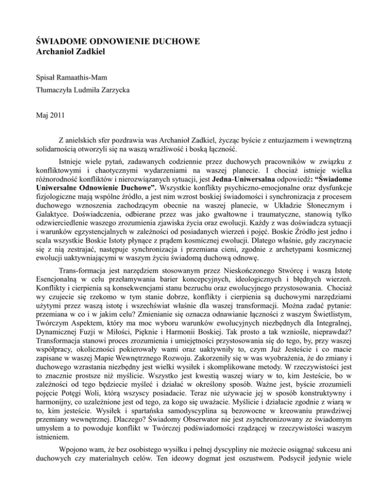 ŚWIADOME ODNOWIENIE DUCHOWE Archanioł Zadkiel Spisał Ramaathis-Mam Tłumaczyła Ludmiła Zarzycka Maj 2011 Z anielskich sfer pozdrawia was Archanioł Zadkiel, życząc byście z entuzjazmem i wewnętrzną solidarnością otworzyli się na waszą wrażliwość i boską łączność. Istnieje wiele pytań, zadawanych codziennie przez duchowych pracowników w związku z konfliktowymi i chaotycznymi wydarzeniami na waszej planecie. I chociaż istnieje wielka różnorodność konfliktów i nierozwiązanych sytuacji, jest Jedna-Uniwersalna odpowiedź: “Świadome Uniwersalne Odnowienie Duchowe”. Wszystkie konflikty psychiczno-emocjonalne oraz dysfunkcje fizjologiczne mają wspólne źródło, a jest nim wzrost boskiej świadomości i synchronizacja z procesem duchowego wznoszenia zachodzącym obecnie na waszej planecie, w Układzie Słonecznym i Galaktyce. Doświadczenia, odbierane przez was jako gwałtowne i traumatyczne, stanowią tylko odzwierciedlenie waszego zrozumienia zjawiska życia oraz ewolucji. Każdy z was doświadcza sytuacji i warunków egzystencjalnych w zależności od posiadanych wierzeń i pojęć. Boskie Źródło jest jedno i scala wszystkie Boskie Istoty płynące z prądem kosmicznej ewolucji. Dlatego właśnie, gdy zaczynacie się z nią zestrajać, następuje synchronizacja i przemiana cieni, zgodnie z archetypami kosmicznej ewolucji uaktywniającymi w waszym życiu świadomą duchową odnowę. Trans-formacja jest narzędziem stosowanym przez Nieskończonego Stwórcę i waszą Istotę Esencjonalną w celu przełamywania barier koncepcyjnych, ideologicznych i błędnych wierzeń. Konflikty i cierpienia są konsekwencjami stanu bezruchu oraz ewolucyjnego przystosowania. Chociaż wy czujecie się rzekomo w tym stanie dobrze, konflikty i cierpienia są duchowymi narzędziami użytymi przez waszą istotę i wszechświat właśnie dla waszej transformacji. Można zadać pytanie: przemiana w co i w jakim celu? Zmienianie się oznacza odnawianie łączności z waszym Świetlistym, Twórczym Aspektem, który ma moc wyboru warunków ewolucyjnych niezbędnych dla Integralnej, Dynamicznej Fuzji w Miłości, Pięknie i Harmonii Boskiej. Tak prosto a tak wzniośle, nieprawdaż? Transformacja stanowi proces zrozumienia i umiejętności przystosowania się do tego, by, przy waszej współpracy, okoliczności pokierowały wami oraz uaktywniły to, czym Już Jesteście i co macie zapisane w waszej Mapie Wewnętrznego Rozwoju. Zakorzeniły się w was wyobrażenia, że do zmiany i duchowego wzrastania niezbędny jest wielki wysiłek i skomplikowane metody. W rzeczywistości jest to znacznie prostsze niż myślicie. Wszystko jest kwestią waszej wiary w to, kim Jesteście, bo w zależności od tego będziecie myśleć i działać w określony sposób. Ważne jest, byście zrozumieli pojęcie Potęgi Woli, którą wszyscy posiadacie. Teraz nie używacie jej w sposób konstruktywny i harmonijny, co uzależnione jest od tego, za kogo się uważacie. Myślicie i działacie zgodnie z wiarą w to, kim jesteście. Wysiłek i spartańska samodyscyplina są bezowocne w kreowaniu prawdziwej przemiany wewnętrznej. Dlaczego? Świadomy Obserwator nie jest zsynchronizowany ze świadomym umysłem a to powoduje konflikt w Twórczej podświadomości rządzącej w rzeczywistości waszym istnieniem. Wpojono wam, że bez osobistego wysiłku i pełnej dyscypliny nie możecie osiągnąć sukcesu ani duchowych czy materialnych celów. Ten ideowy dogmat jest oszustwem. Podsycił jedynie wiele konfliktów, niezgody i cierpienia w waszym społeczeństwie oraz w sferze duchowości. Doświadczane przez was cierpienie oraz inne ewolucyjne rany są wynikiem mylnego rozumienia procesu ewolucji i duchowego wznoszenia się. W związku z tym my, sfery boskiego światła, zapraszamy was, abyście zrewidowali przejawiane koncepcje ideowe, wierzenia oraz perspektywę egzystencjalną. Przemiana wewnętrzna jest zagadnieniem świadomej odnowy oraz rozumienia skutków, jakie powoduje wola, świadomie użyta w celu przeprogramowania podświadomego umysłu poprzez umysł świadomy. Podświadomość twórcza jest kluczem i sanktuarium, gdzie rodzą się procesy, których doświadczaliście w ciągu waszego istnienia. Dlatego tak niezbędne jest, abyście począwszy od tej chwili, zaczęli rozumieć naturę jedności istniejącą pomiędzy niższym a wyższym ciałem mentalnym. Myślicie, czujecie i działacie w oparciu o pojęcia i wierzenia, które uznaliście za pożyteczne, by tworzyć stan komfortu i harmonii wewnętrznej. Kto jest odpowiedzialny za kreowanie, integrację i aktywację waszych myśli, emocji i działań? Podświadomość twórcza - wyższy umysł, połączony z Nieskończoną Inteligencją Stwórcy Kosmicznego, dzięki czemu wszystko działa synchronicznie i spójnie. Nieporozumienia i konflikty są prowokowane przez was, gdy nie jesteście w harmonii z Siłą Kosmiczną nadzorującą i projektującą procesy ewolucji. A więc, przemiana nie polega na procesie dyscypliny, pochłaniającym waszą uwagę i energię, lecz jest stanem kontroli i świadomego odnowienia waszych wierzeń i fałszywych pojęć na temat życia oraz duchowej ewolucji. Kluczem do przemiany i duchowego wzrastania jest świadome przeprogramowanie twórczej podświadomości poprzez zmianę pojęć i wierzeń prowadzących do harmonii, piękna i synchronii z boskim kosmicznym porządkiem. To przeprogramowanie i świadome odnowienie realizuje się poprzez wizualizacje zsynchronizowane harmonijnie z potęgą woli. Ona selekcjonuje myśli podsycając te stany psychiczne, emocjonalne i fizjologiczne, które pragniecie zmienić. Wszystko skupia się wokół świadomej duchowej odnowy dotyczącej tego, czym pragniecie Być a nie waszej obecnej wiary w to, kim jesteście. Obecnie stanowicie kompendium ideologii, pojęć i wierzeń, które wchłonęliście ze sfery kulturalnej i wychowawczej, w jakich wzrastaliście. Określają one waszą Idios