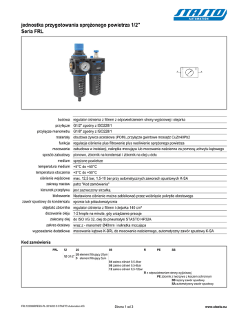 jednostka przygotowania sprężonego powietrza 1/2" Seria FRL budowa regulator ciśnienia z filtrem z odpowietrzeniem strony wyjściowej i olejarka przyłącze G1/2" zgodny z ISO228/1 przyłącze manometru G1/8" zgodny z ISO228/1 materiały obudowa żywica acetalowa (POM), przyłącze gwintowe mosiądz CuZn40Pb2 funkcja regulacja ciśnienia plus filtrowanie plus naoliwienie sprężonego powietrza mocowanie zabudowa w instalacji, nakrętka mocująca lub mocowanie naścienne za pomocą uchwytu kątowego sposób zabudowy pionowo, zbiornik na kondensat i zbiornik na olej u dołu medium sprężone powietrze temperatura medium +5°C do +50°C temperatura otoczenia +5°C do +50°C ciśnienie wejściowe max. 12,5 bar, 1,5-10 bar przy automatycznych zaworach spustowych K-SA zakresy nastaw patrz "Kod zamówienia" kierunek przepływu jest zaznaczony strzałką blokowanie Nastawione ciśnienie można zablokować przez wciśnięcie pokrętła obrotowego zawór spustowy do kondensatu ręcznie lub półautomatycznie objętość zbiornika regulator ciśnienia z filtrem i olejarka 140 cm³ dozowanie oleju 1-2 krople na minute, gdy urządzenie pracuje zalecany olej do ISO VG 32, olej do pneumatyki STASTO HP32A zakres dostawy wraz z - manometr Ø40mm i nakrętka mocująca wyposażenie dodatkowe mocowanie kątowe K-BRL do mocowania naściennego, automatyczny zawór spustowy K-SA Kod zamówienia FRL 12 20 08 R PE SS 20 element filtrujący 20ym 12 G1/2" 5 element filtrujący 5ym 04 zakres ciśnień 0,5-4bar 08 zakres ciśnień 0,5-8bar 12 zakres ciśnień 0,5-12bar R z odpowietrzeniem strony wyjściowej PE zbiornik z tworzywa z koszem ochronnym SS ręczny zawór spustowy SA automatyczny zawór spustowy FRL122008RPESS-PL-2016/02 © STASTO Automation KG Strona 1 od 3 www.stasto.eu wymiary ciężar 0,94 kg diagram przepływu ciśnienie wejściowe = 10bar, przepływ w stanie normalnym charakterystyka regulacji niezmienny przepływ = 900Nl/min FRL122008RPESS-PL-2016/02 © STASTO Automation KG Strona 2 od 3 www.stasto.eu wyposażenie dodatkowe A B C D E F typ 55 27 40 42 33 5,5 K-BRL rysunki poglądowe Zmiany w konstrukcji, wymiarach i wykonaniu materiałowym zastrzeżone FRL122008RPESS-PL-2016/02 © STASTO Automation KG Strona 3 od 3 www.stasto.eu