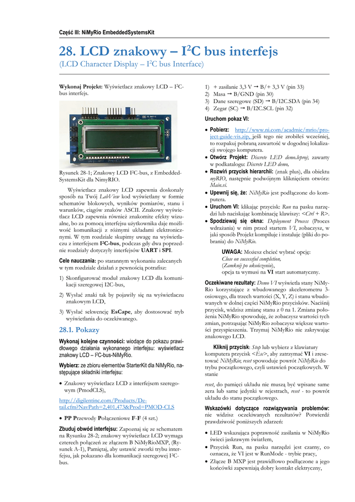 Część III: NiMyRio EmbeddedSystemsKit 28. LCD znakowy – I2C bus interfejs (LCD Character Display – I2C bus Interface) Wykonaj Projekt: Wyświetlacz znakowy LCD – I2Cbus interfejs. 1) 2) 3) 4) + zasilanie 3,3 V B/+ 3,3 V (pin 33) Masa B/GND (pin 30) Dane szeregowe (SD) B/I2C.SDA (pin 34) Zegar (SC) B/I2C.SCL (pin 32) Uruchom pokaz VI: Rysunek 28-1; Znakowy LCD I2C-bus, z EmbeddedSystemsKit dla NimyRIO. Wyświetlacz znakowy LCD zapewnia doskonały sposób na Twój LabView kod wyświetlany w formie schematów blokowych, wyników pomiarów, stanu i warunków, ciągów znaków ASCII. Znakowy wyświetlacz LCD zapewnia również znakomite efekty wizualne, bo za pomocą interfejsu użytkownika daje możliwość komunikacji z różnymi układami elektronicznymi. W tym rozdziale skupimy uwagę na wyświetlaczu z interfejsem I2C-bus, podczas gdy dwa poprzednie rozdziały dotyczyły interfejsów UART i SPI. Cele nauczania: po starannym wykonaniu zalecanych w tym rozdziale działań z pewnością potrafisz: 1) Skonfigurować moduł znakowy LCD dla komunikacji szeregowej I2C-bus, 2) Wysłać znaki tak by pojawiły się na wyświetlaczu znakowym LCD, 3) Wysłać sekwencję EsCape, aby dostosować tryb wyświetlania do oczekiwanego. 28.1. Pokazy Wykonaj kolejne czynności: wiodące do pokazu prawidłowego działania wykonanego interfejsu: wyświetlacz znakowy LCD – I2C-bus-NiMyRio. Wybierz: ze zbioru elementów StarterKit dla NiMyRio, następujące składniki interfejsu: Znakowy wyświetlacz LCD z interfejsem szeregowym (PmodCLS), http://digilentinc.com/Products/Detail.cfm?NavPath=2,401,473&Prod=PMOD-CLS PP Przewody Połączeniowe F-F (4 szt.) Zbuduj obwód interfejsu: Zapoznaj się ze schematem na Rysunku 28-2; znakowy wyświetlacz LCD wymaga czterech połączeń ze złączem B NiMyRioMXP, (Rysunek A-1), Pamiętaj, aby ustawić zworki trybu interfejsu, jak pokazano dla komunikacji szeregowej I2Cbus. Pobierz: http://www.ni.com/acadmic/mrio/project-guide-vis.zip, jeśli tego nie zrobiłeś wcześniej, to rozpakuj pobraną zawartość w dogodnej lokalizacji swojego komputera. Otwórz Projekt: Discrete LED demo.lvproj; zawarty w podkatalogu: Discrete LED demo, Rozwiń przycisk hierarchii: (znak plus), dla obiektu myRIO, następnie podwójnym kliknięciem otwórz: Main.vi. Upewnij się, że: NiMyRio jest podłączone do komputera. Uruchom VI: klikając przycisk: Run na pasku narzędzi lub naciskając kombinację klawiszy: <Ctrl + R>. Spodziewaj się okna: Deployment Process (Proces wdrażania) w nim przed startem VI, zobaczysz, w jaki sposób Projekt kompiluje i instaluje (pliki do pobrania) do NiMyRio. UWAGA: Możesz chcieć wybrać opcję: Close on successful completion, (Zamknij po ukończeniu), opcja ta wymusi na VI start automatyczny. Oczekiwane rezultaty: Demo VI wyświetla stany NiMyRio korzystające z wbudowanego akcelerometru 3osiowego, dla trzech wartości (X, Y, Z) i stanu wbudowanych w dolnej części NiMyRio przycisków. Naciśnij przycisk, widzisz zmianę stanu z 0 na 1. Zmiana położenia NiMyRio spowoduję, że zobaczysz wartości tych zmian, potrząsając NiMyRio zobaczysz większe wartości przyspieszenia. Trzymaj NiMyRio nie zakrywając znakowego LCD. Kliknij przycisk: Stop lub wybierz z klawiatury komputera przycisk <Esc>, aby zatrzymać VI i zresetować NiMyRio; reset spowoduje powrót NiMyRio do trybu początkowego, czyli ustawień początkowych. W stanie reset, do pamięci układu nie muszą być wpisane same zera lub same jedynki w rejestrach, reset - to powrót układu do stanu początkowego. Wskazówki dotyczące rozwiązywania problemów: nie widzisz oczekiwanych rezultatów? Potwierdź prawdziwość poniższych zdarzeń: LED wskazująca poprawność zasilania w NiMyRio świeci jaskrawym światłem, Przycisk Run, na pasku narzędzi jest czarny, co oznacza, że VI jest w RunMode - trybie pracy, Złącze B MXP jest prawidłowo podłączone a jego końcówki zapewniają dobry kontakt elektryczny, Poprawne wyświetlanie na znakowym LCD danych, dwukrotnie sprawdź końcówki przyłączeniowe i upewnij się, że urządzenie jest podłączone do NiMyRio poprzez interfejs I2C-bus, liniami SDA do znakowego LCD SD zacisk na złączu J2 i linii SCL do SC terminala; sprawdzić, poprawność podłączenia zasilania. Prawidłowe ustawienie zworek trybu, prostokąt na Rysunku 28-2, określa region gdzie są te zworki, sprawdź ich konfigurację. Rysunek 28-2; Układ pokazowy, Schemat ideowy, propozycje połączeń do złącza B NImyRIOMXP UWAGA: Sprawdź dokładnie połączenia: SDA i SCL, w przypadku błędów powinien pojawić się komunikat: Błąd-36011, występował w myRIO Write I2C.vi podobnych przypadkach. Ten komunikat oznacza, że NiMyRio nie otrzymał oczekiwanego potwierdzenie od interfejsu I2Cbus wyświetlania znaków LCD. 28.2. Teoria interfejsu Obwód interfejsu: Znakowy LCD obsługuje trzy szeregowe standardy komunikacyjne: UART (Universal Asynchronus Reciver-Transmitter), SPI (Serial Peripheral Interface) oraz I2C-bus (Inter IC). W tym rozdziale uwagę naszą skupimy na znakowym LCD z interfejsem I2C-bus (oznaczanym także, jako I2C), dwa poprzednie rozdziały to omówienie pozostałych przypadków. Funkcjonalność znakowego LCD w samej postaci jest niezależna od wybranego standardu komunikacyjnego (rodzaju interfejsu). Wystarczy wysłać znaki w kodzie ASCII poprzez I2C-bus do wyświetlacza i otrzymamy linię (rekord) na jego ekranie. Wysyłając sekwencję EsCape, możemy skonfigurować inne właściwości i funkcjonalności znakowego LCD takie jak: wyświetlanie kursora, wyświetlanie i miganie kursora, przewijanie ekranu, i tak dalej. Uważnie przestudiuj wideo: LCD Character Display http://youtu.be/m0Td7KbhvdI 10:35 NiMyRio Project Essentials Guide LCD Character Display - Digilent PmodCLS properties - Escape sequences - LabView Coding Demo Dowiesz się, jak wysłać informacje, sekwencje znakowe oraz instrukcje konfigurujące LCD. Uważnie przestudiuj wideo: I2