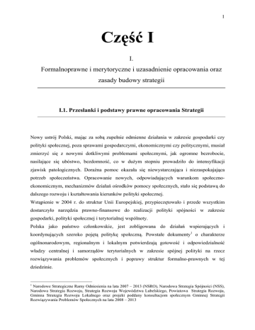 1 I. Formalnoprawne i merytoryczne i uzasadnienie opracowania oraz zasady budowy strategii I.1. Przesłanki i podstawy prawne opracowania Strategii Nowy ustrój Polski, mając za sobą zupełnie odmienne działania w zakresie gospodarki czy polityki społecznej, poza sprawami gospodarczymi, ekonomicznymi czy politycznymi, musiał zmierzyć się z nowymi dotkliwymi problemami społecznymi, jak ogromne bezrobocie, nasilające się ubóstwo, bezdomność, co w dużym stopniu prowadziło do intensyfikacji zjawisk patologicznych. Doraźna pomoc okazała się niewystarczająca i niezaspokajająca potrzeb społeczeństwa. Opracowanie nowych, odpowiadających warunkom społecznoekonomicznym, mechanizmów działań ośrodków pomocy społecznych, stało się podstawą do dalszego rozwoju i kształtowania kierunków polityki społecznej. Wstąpienie w 2004 r. do struktur Unii Europejskiej, przypieczętowało i przede wszystkim dostarczyło narzędzia prawno-finansowe do realizacji polityki spójności w zakresie gospodarki, polityki społecznej i terytorialnej wspólnoty. Polska jako państwo członkowskie, jest zobligowana do działań wspierających i koordynujących szeroko pojętą politykę społeczną. Powstałe dokumenty1 o charakterze ogólnonarodowym, regionalnym i lokalnym potwierdzają gotowość i odpowiedzialność władzy centralnej i samorządów terytorialnych w zakresie spójnej polityki na rzecz rozwiązywania problemów społecznych i poprawy struktur formalno-prawnych w tej dziedzinie. 1 Narodowe Strategiczne Ramy Odniesienia na lata 2007 – 2013 (NSRO), Narodowa Strategia Spójności (NSS), Narodowa Strategia Rozwoju, Strategia Rozwoju Województwa Lubelskiego, Powiatowa Strategia Rozwoju, Gminna Strategia Rozwoju Lokalnego oraz projekt poddany konsultacjom społecznym Gminnej Strategii Rozwiązywania Problemów Społecznych na lata 2008 – 2013 2 Obecnie pomoc osobom potrzebującym świadczona jest w oparciu o zasady określone m.in. w ustawie o pomocy społecznej: • zadaniem pomocy społecznej jest udzielenie osobom i rodzinom odpowiednich do okoliczności rodzajów, form i rozmiarów wsparcia dla usamodzielnienia się oraz integracji ze środowiskiem; • pomoc społeczna organizowana jest przez organy administracji rządowej i samorządowej przy partnerskiej współpracy z organizacjami społecznymi i pozarządowymi, Kościołem • Katolickim, innymi kościołami i związkami wyznaniowymi oraz osobami fizycznymi i prawnymi; • jednym z wymogów udzielenia pomocy, oprócz formalnoprawnych, jest obowiązek współdziałania osób i rodzin korzystających z pomocy przy rozwiązywaniu ich trudnej sytuacji życiowej. Podstawą do opracowania Gminnej Strategii Rozwiązywania Problemów Społecznych (SRPS), jest art.17 ust. 1 pkt 1 ustawy z dnia 12 marca 2004 r. o pomocy społecznej (Dz. U. z 2008r. Nr 115, poz. 728 ) - do zadań własnych gminy o charakterze obowiązkowym należy: opracowanie i realizacja gminnej strategii rozwiązywania problemów społecznych ze szczególnym uwzględnieniem programów pomocy społecznej, profilaktyki i rozwiązywania problemów alkoholowych i innych, których celem jest integracja osób i rodzin z grup szczególnego ryzyka. 1.1. Powiązanie z krajowymi aktami prawnymi Działania zawarte w Strategii są spójne z postanowieniami innych aktów prawnych, a w szczególności: 1) ustawy z dnia 29 maja 2003 roku o działalności pożytku publicznego i o wolontariacie (Dz.U. z 2003 r. Nr 96, poz. 873 i Nr 96, poz. 874); 2) ustawy z dnia 13 czerwca 2003 roku o zatrudnieniu socjalnym (Dz.U. z 2004 r. Nr 69, poz. 624); 3) ustawy z dnia 26 października 1982 roku o wychowaniu w trzeźwości i przeciwdziałaniu alkoholizmowi (Dz.U. z 2004 r. Nr 29, poz. 257); 3 4) ustawy z 24 kwietnia 1997 roku o przeciwdziałaniu narkomanii (Dz.U. Nr 75, poz. 468 z późn. zm.); 5) ustawy z dnia 20 kwietnia 2004 roku o promocji zatrudnienia i instytucjach rynku pracy (Dz.U. 1997 r. Nr 25, poz. 128 z późn. zm.); 6) ustawy z dnia 27 sierpnia 1997 roku o rehabilitacji zawodowej i społecznej oraz zatrudnianiu osób niepełnosprawnych (Dz.U. Nr 123, poz. 776 z późn. zm.); 7) ustawy z dnia 29 lipca 2005 roku o przeciwdziałaniu przemocy w rodzinie (Dz.U. z 2005 r. Nr 180, poz. 1493). 1.2. Zgodność ze Strategią Rozwoju Województwa Lubelskiego na lata 2006 – 2020 Założenia i cele niniejszej Strategii wpisują się w priorytety zawarte w Strategii Rozwoju Województwa Lubelskiego na lata 2006 – 2020; opracowanej na zlecenie Urzędu Marszałkowskiego Województwa Lubelskiego oraz Ministerstwa Nauki i Informatyzacji. 1.3. Zgodność z Narodowym Programem Zdrowia na lata 2007 - 2015 Działania przedstawione w Strategii są zgodne z zawartymi w Programie, głównie z: 1. celem strategicznym nr 2 celów dotyczących ryzyka i działania w zakresie promocji zdrowia: Zmniejszenie i zmiana struktury spożycia alkoholu oraz zmniejszenie szkód zdrowotnych spowodowanych alkoholem oraz celem strategicznym nr 4: Zwiększenie aktywności fizycznej ludności. 2. celem strategicznym nr 8 dotyczącym celów zdrowotnych: Zmniejszenie różnic społecznych i terytorialnych w stanie zdrowia populacji. 3. celem strategicznym nr 8 dotyczącym wybranych populacji: Wspieranie rozwoju i zdrowia fizycznego i psychospołecznego oraz zapobieganie najczęstszym problemom zdrowotnym i społecznym dzieci i młodzieży, celem nr 9: Tworzenie warunków do zdrowego i aktywnego życia osób starszych i celem nr 10: Tworzenie warunków dla aktywnego życia osób niepełnosprawnych. 4 1.4. Zgodność z Narodowym Programem Profilaktyki i Rozwiązywania Problemów Alkoholowych na lata 2006-2010 Opracowany na podstawie art. 3 ust. 3 pkt 1ustawy o wychowaniu w trzeźwości i przeciwdziałaniu alkoholizmowi przez Państwową Agencję Rozwiązywania Problemów Alkoholowych (Dz.U. z 2004 r. Nr 29, poz. 257); szczególnie zaś z art. art. 1, 2, 4¹. 1.5. Zgodność z Krajowym Programem Zabezpieczenie Sp