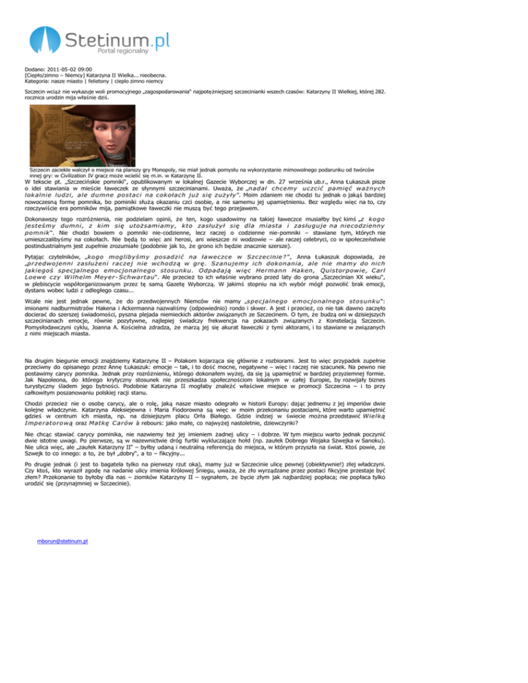 Dodano: 2011-05-02 09:00 [Ciepło/zimno – Niemcy] Katarzyna II Wielka... nieobecna. Kategoria: nasze miasto | felietony | cieplo zimno niemcy Szczecin wciąż nie wykazuje woli promocyjnego „zagospodarowania“ najpotężniejszej szczecinianki wszech czasów: Katarzyny II Wielkiej, której 282. rocznica urodzin mija właśnie dziś. Szczecin zaciekle walczył o miejsce na planszy gry Monopoly, nie miał jednak pomysłu na wykorzystanie mimowolnego podarunku od twórców innej gry: w Civilization IV gracz może wcielić się m.in. w Katarzynę II. W tekscie pt. „Szczecińskie pomniki“, opublikowanym w lokalnej Gazecie Wyborczej w dn. 27 września ub.r., Anna Łukaszuk pisze o idei stawiania w mieście ławeczek ze słynnymi szczecinianami. Uważa, że „nadal chcemy uczcić pamięć ważnych lokalnie ludzi, ale dumne postaci na cokołach już się zużyły ”. Moim zdaniem nie chodzi tu jednak o jakąś bardziej nowoczesną formę pomnika, bo pominiki służą okazaniu czci osobie, a nie samemu jej upamiętnieniu. Bez względu więc na to, czy rzeczywiście era pomników mija, pamiątkowe ławeczki nie muszą być tego przejawem. Dokonawszy tego rozróżnienia, nie podzielam opinii, że ten, kogo usadowimy na takiej ławeczce musiałby być kimś „z kogo jesteśmy dumni, z kim się utożsamiamy, kto zasłużył się dla miasta i zasługuje na niecodzienny pomnik “. Nie chodzi bowiem o pomniki nie-codzienne, lecz raczej o codzienne nie-pomniki – stawiane tym, których nie umieszczalibyśmy na cokołach. Nie będą to więc ani herosi, ani wieszcze ni wodzowie – ale raczej celebryci, co w społeczeństwie postindustrialnym jest zupełnie zrozumiałe (podobnie jak to, że grono ich będzie znacznie szersze). Pytając czytelników, „kogo moglibyśmy posadzić na ławeczce w Szczecinie ? “, Anna Łukaszuk dopowiada, że „przedwojenni zasłużeni raczej nie wchodzą w grę. Szanujemy ich dokonania, ale nie mamy do nich jakiegoś specjalnego emocjonalnego stosunku. Odpadają więc Hermann Haken, Quistorpowie, Carl Loewe czy Wilhelm Meyer - Schwartau “. Ale przecież to ich właśnie wybrano przed laty do grona „Szczecinian XX wieku“, w plebiscycie współorganizowanym przez tę samą Gazetę Wyborczą. W jakimś stopniu na ich wybór mógł pozwolić brak emocji, dystans wobec ludzi z odległego czasu... Wcale nie jest jednak pewne, że do przedwojennych Niemców nie mamy „specjalnego emocjonalnego stosunku “: imionami nadburmistrzów Hakena i Ackermanna nazwaliśmy (odpowiednio) rondo i skwer. A jest i przecież, co nie tak dawno zaczęło docierać do szerszej świadomości, pyszna plejada niemieckich aktorów związanych ze Szczecinem. O tym, że budzą oni w dzisiejszych szczecinianach emocje, równie pozytywne, najlepiej świadczy frekwencja na pokazach związanych z Konstelacją Szczecin. Pomysłodawczyni cyklu, Joanna A. Kościelna zdradza, że marzą jej się akurat ławeczki z tymi aktorami, i to stawiane w związanych z nimi miejscach miasta. Na drugim biegunie emocji znajdziemy Katarzynę II – Polakom kojarząca się głównie z rozbiorami. Jest to więc przypadek zupełnie przeciwny do opisanego przez Annę Łukaszuk: emocje – tak, i to dość mocne, negatywne – więc i raczej nie szacunek. Na pewno nie postawimy carycy pomnika. Jednak przy rozróżnieniu, którego dokonałem wyżej, da się ją upamiętnić w bardziej przyziemnej formie. Jak Napoleona, do którego krytyczny stosunek nie przeszkadza społecznościom lokalnym w całej Europie, by rozwijały biznes turystyczny śladem jego bytności. Podobnie Katarzyna II mogłaby znaleźć właściwe miejsce w promocji Szczecina – i to przy całkowitym poszanowaniu polskiej racji stanu. Chodzi przecież nie o osobę carycy, ale o rolę, jaką nasze miasto odegrało w historii Europy: dając jednemu z jej imperiów dwie kolejne władczynie. Katarzyna Aleksiejewna i Maria Fiodorowna są więc w moim przekonaniu postaciami, które warto upamiętnić gdzieś w centrum ich miasta, np. na dzisiejszym placu Orła Białego. Gdzie indziej w świecie można przedstawić Wielką Imperatorową oraz Matkę Carów à rebours: jako małe, co najwyżej nastoletnie, dziewczynki? Nie chcąc stawiać carycy pominika, nie nazwiemy też jej imieniem żadnej ulicy – i dobrze. W tym miejscu warto jednak poczynić dwie istotne uwagi. Po pierwsze, są w nazewnictwie dróg furtki wykluczające hołd (np. zaułek Dobrego Wojaka Szwejka w Sanoku). Nie ulica więc, ale „zaułek Katarzyny II“ – byłby udaną i neutralną referencją do miejsca, w którym przyszła na świat. Ktoś powie, że Szwejk to co innego: a to, że był „dobry“, a to – fikcyjny... Po drugie jednak (i jest to bagatela tylko na pierwszy rzut oka), mamy już w Szczecinie ulicę pewnej (obiektywnie!) złej władczyni. Czy ktoś, kto wyraził zgodę na nadanie ulicy imienia Królowej Śniegu, uważa, że zło wyrządzane przez postaci fikcyjne przestaje być złem? Przekonanie to byłoby dla nas – ziomków Katarzyny II – sygnałem, że bycie złym jak najbardziej popłaca; nie popłaca tylko urodzić się (przynajmniej w Szczecinie). [email protected]