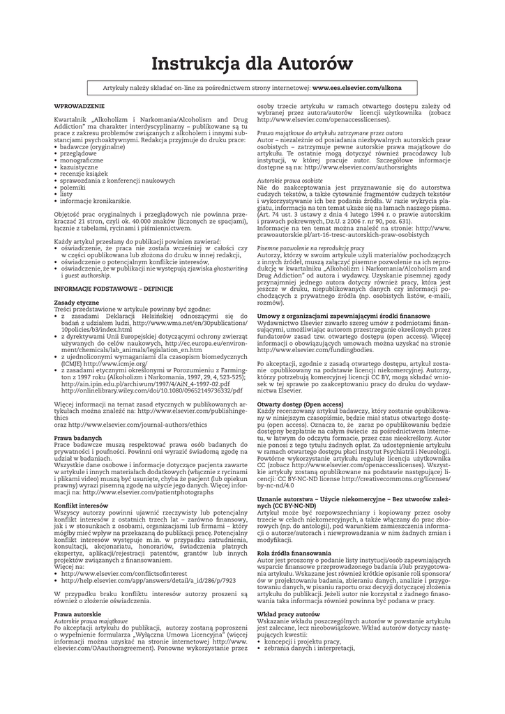 Instrukcja dla Autorów Artykuły należy składać on-line za pośrednictwem strony internetowej: www.ees.elsevier.com/alkona WPROWADZENIE Kwartalnik „Alkoholizm i Narkomania/Alcoholism and Drug Addiction” ma charakter interdyscyplinarny – publikowane są tu prace z zakresu problemów związanych z alkoholem i innymi substancjami psychoaktywnymi. Redakcja przyjmuje do druku prace: • badawcze (oryginalne) • przeglądowe • monograficzne • kazuistyczne • recenzje książek • sprawozdania z konferencji naukowych • polemiki • listy • informacje kronikarskie. Objętość prac oryginalnych i przeglądowych nie powinna przekraczać 21 stron, czyli ok. 40.000 znaków (liczonych ze spacjami), łącznie z tabelami, rycinami i piśmiennictwem. Każdy artykuł przesłany do publikacji powinien zawierać: • oświadczenie, że praca nie została wcześniej w całości czy w części opublikowana lub złożona do druku w innej redakcji, • oświadczenie o potencjalnym konflikcie interesów, • oświadczenie, że w publikacji nie występują zjawiska ghostwriting i guest authorship. INFORMACJE PODSTAWOWE – DEFINICJE Zasady etyczne Treści przedstawione w artykule powinny być zgodne: • z zasadami Deklaracji Helsińskiej odnoszącymi się do badań z udziałem ludzi, http://www.wma.net/en/30publications/ 10policies/b3/index.html • z dyrektywami Unii Europejskiej dotyczącymi ochrony zwierząt używanych do celów naukowych, http://ec.europa.eu/environment/chemicals/lab_animals/legislation_en.htm • z ujednoliconymi wymaganiami dla czasopism biomedycznych (ICMJE) http://www.icmje.org/ • z zasadami etycznymi określonymi w Porozumieniu z Farmington z 1997 roku (Alkoholizm i Narkomania, 1997, 29, 4, 523-525); http://ain.ipin.edu.pl/archiwum/1997/4/AiN_4-1997-02.pdf http://onlinelibrary.wiley.com/doi/10.1080/09652149736332/pdf Więcej informacji na temat zasad etycznych w publikowanych artykułach można znaleźć na: http://www.elsevier.com/publishingethics oraz http://www.elsevier.com/journal-authors/ethics Prawa badanych Prace badawcze muszą respektować prawa osób badanych do prywatności i poufności. Powinni oni wyrazić świadomą zgodę na udział w badaniach. Wszystkie dane osobowe i informacje dotyczące pacjenta zawarte w artykule i innych materiałach dodatkowych (włącznie z rycinami i plikami video) muszą być usunięte, chyba że pacjent (lub opiekun prawny) wyrazi pisemną zgodę na użycie jego danych. Więcej informacji na: http://www.elsevier.com/patientphotographs Konflikt interesów Wszyscy autorzy powinni ujawnić rzeczywisty lub potencjalny konflikt interesów z ostatnich trzech lat – zarówno finansowy, jak i w stosunkach z osobami, organizacjami lub firmami – który mógłby mieć wpływ na przekazaną do publikacji pracę. Potencjalny konflikt interesów występuje m.in. w przypadku zatrudnienia, konsultacji, akcjonariatu, honorariów, świadczenia płatnych ekspertyz, aplikacji/rejestracji patentów, grantów lub innych projektów związanych z finansowaniem. Więcej na: • http://www.elsevier.com/conflictsofinterest • http://help.elsevier.com/app/answers/detail/a_id/286/p/7923 osoby trzecie artykułu w ramach otwartego dostępu zależy od wybranej przez autora/autorów licencji użytkownika (zobacz http://www.elsevier.com/openaccesslicenses). Prawa majątkowe do artykułu zatrzymane przez autora Autor – niezależnie od posiadania niezbywalnych autorskich praw osobistych – zatrzymuje pewne autorskie prawa majątkowe do artykułu. Te ostatnie mogą dotyczyć również pracodawcy lub instytucji, w której pracuje autor. Szczegółowe informacje dostępne są na: http://www.elsevier.com/authorsrights Autorskie prawa osobiste Nie do zaakceptowania jest przyznawanie się do autorstwa cudzych tekstów, a także cytowanie fragmentów cudzych tekstów i wykorzystywanie ich bez podania źródła. W razie wykrycia plagiatu, informacja na ten temat ukaże się na łamach naszego pisma. (Art. 74 ust. 3 ustawy z dnia 4 lutego 1994 r. o prawie autorskim i prawach pokrewnych, Dz.U. z 2006 r. nr 90, poz. 631). Informacje na ten temat można znaleźć na stronie: http://www. prawoautorskie.pl/art-16-tresc-autorskich-praw-osobistych Pisemne pozwolenie na reprodukcję pracy Autorzy, którzy w swoim artykule użyli materiałów pochodzących z innych źródeł, muszą załączyć pisemne pozwolenie na ich reprodukcję w kwartalniku „Alkoholizm i Narkomania/Alcoholism and Drug Addiction” od autora i wydawcy. Uzyskanie pisemnej zgody przynajmniej jednego autora dotyczy również pracy, która jest jeszcze w druku, niepublikowanych danych czy informacji pochodzących z prywatnego źródła (np. osobistych listów, e-maili, rozmów). Umowy z organizacjami zapewniającymi środki finansowe Wydawnictwo Elsevier zawarło szereg umów z podmiotami finansującymi, umożliwiając autorom przestrzeganie określonych przez fundatorów zasad tzw. otwartego dostępu (open access). Więcej informacji o obowiązujących umowach można uzyskać na stronie http://www.elsevier.com/fundingbodies. Po akceptacji, zgodnie z zasadą otwartego dostępu, artykuł zostanie opublikowany na podstawie licencji niekomercyjnej. Autorzy, którzy potrzebują komercyjnej licencji CC BY, mogą składać wniosek w tej sprawie po zaakceptowaniu pracy do druku do wydawnictwa Elsevier. Otwarty dostęp (Open access) Każdy recenzowany artykuł badawczy, który zostanie opublikowany w niniejszym czasopiśmie, będzie miał status otwartego dostępu (open access). Oznacza to, że zaraz po opublikowaniu będzie dostępny bezpłatnie na całym świecie za pośrednictwem Internetu, w łatwym do odczytu formacie, przez czas nieokreślony. Autor nie ponosi z tego tytułu żadnych opłat. Za udostępnienie artykułu w ramach otwartego dostępu płaci Instytut Psychiatrii i Neurologii. Powtórne wykorzystanie artykułu reguluje licencja użytkownika CC (zobacz http://www.elsevier.com/openaccessl