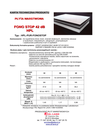 KARTA TECHNICZNA PRODUKTU PŁYTA WARSTWOWA FONO STOP 42 dB HPL Typ : HPL-PUR-FONOSTOP Zastosowanie : do wypełnienia drzwi, bram, ścianek działowych, elementów elewacji w budynkach: mieszkalnych, usługowych, przemysłowych i użyteczności publicznej w tym w szpitalach Dokumenty formalno-prawne : ATEST HIGIENICZNY HK/B/1371/01/2012 RAPORT Z BADAŃ ITB Nr LAOO-1r98/14/200NA Budowa płyty i opis techniczny poszczególnych warstw : Okładzina zewnętrzna : Wysokociśnieniowy laminat HPL zgodnie z DIN EN 438 Odporna na warunki atmosferyczne wg DIN 53387 Powierzchnia zewnętrzna twarda, dobra odporność na ścieranie, zarysowania i uderzenia. Odporna na promieniowanie UV Długotrwała w użytkowaniu i zachowaniu kolorystyki, nie korodująca klasa palności B2 wg DIN 410 Rdzeń : twarda pianka poliuretanowa i specjalne warstwy izolujące dźwięk Grubość (mm) 32 36 40 Wymiary (mm) na zamówienie na zamówienie na zamówienie Folia ochronna tak tak tak Ciężar kg/m² 37,8 38 38,2 Zakres temperatur -30 do +60°C -30 do +60°C -30 do +60°C Izolacyjność akustyczna* (dB) Współ. K (W/m² x K) Rw (C, Ctr) = 42 (-1,-3) ocena przy zastosowaniu w przegrodzie wewnętrznej RA1 = 41 dB ocena przy zastosowaniu w przegrodzie zewnętrznej RA2 = 39 dB 1,45 1,17 0,98 * Wskaźniki określone na podstawie badań Akredytowanego Labolatorium Akustycznego ITB, Raport Nr LAOO-1r98/14/200NA PRODUCENT PŁYT WARSTWOWYCH ul. Gazowa 26a 50-513 Wrocław tel. 71 347 25 60, fax 71 347 25 70 [email protected] www.al-land.pl