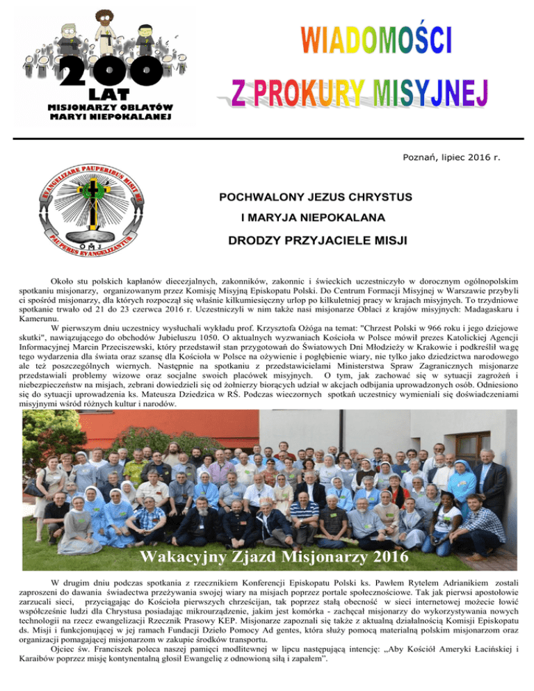 Poznań, lipiec 2016 r. POCHWALONY JEZUS CHRYSTUS I MARYJA NIEPOKALANA DRODZY PRZYJACIELE MISJI Około stu polskich kapłanów diecezjalnych, zakonników, zakonnic i świeckich uczestniczyło w dorocznym ogólnopolskim spotkaniu misjonarzy, organizowanym przez Komisję Misyjną Episkopatu Polski. Do Centrum Formacji Misyjnej w Warszawie przybyli ci spośród misjonarzy, dla których rozpoczął się właśnie kilkumiesięczny urlop po kilkuletniej pracy w krajach misyjnych. To trzydniowe spotkanie trwało od 21 do 23 czerwca 2016 r. Uczestniczyli w nim także nasi misjonarze Oblaci z krajów misyjnych: Madagaskaru i Kamerunu. W pierwszym dniu uczestnicy wysłuchali wykładu prof. Krzysztofa Ożóga na temat: "Chrzest Polski w 966 roku i jego dziejowe skutki", nawiązującego do obchodów Jubieluszu 1050. O aktualnych wyzwaniach Kościoła w Polsce mówił prezes Katolickiej Agencji Informacyjnej Marcin Przeciszewski, który przedstawił stan przygotowań do Światowych Dni Młodzieży w Krakowie i podkreślił wagę tego wydarzenia dla świata oraz szansę dla Kościoła w Polsce na ożywienie i pogłębienie wiary, nie tylko jako dziedzictwa narodowego ale też poszczególnych wiernych. Następnie na spotkaniu z przedstawicielami Ministerstwa Spraw Zagranicznych misjonarze przedstawiali problemy wizowe oraz socjalne swoich placówek misyjnych. O tym, jak zachować się w sytuacji zagrożeń i niebezpieczeństw na misjach, zebrani dowiedzieli się od żołnierzy biorących udział w akcjach odbijania uprowadzonych osób. Odniesiono się do sytuacji uprowadzenia ks. Mateusza Dziedzica w RŚ. Podczas wieczornych spotkań uczestnicy wymieniali się doświadczeniami misyjnymi wśród różnych kultur i narodów. Wakacyjny Zjazd Misjonarzy 2016 W drugim dniu podczas spotkania z rzecznikiem Konferencji Episkopatu Polski ks. Pawłem Rytelem Adrianikiem zostali zaproszeni do dawania świadectwa przeżywania swojej wiary na misjach poprzez portale społecznościowe. Tak jak pierwsi apostołowie zarzucali sieci, przyciągając do Kościoła pierwszych chrześcijan, tak poprzez stałą obecność w sieci internetowej możecie łowić współcześnie ludzi dla Chrystusa posiadając mikrourządzenie, jakim jest komórka - zachęcał misjonarzy do wykorzystywania nowych technologii na rzecz ewangelizacji Rzecznik Prasowy KEP. Misjonarze zapoznali się także z aktualną działalnością Komisji Episkopatu ds. Misji i funkcjonującej w jej ramach Fundacji Dzieło Pomocy Ad gentes, która służy pomocą materialną polskim misjonarzom oraz organizacji pomagającej misjonarzom w zakupie środków transportu. Ojciec św. Franciszek poleca naszej pamięci modlitewnej w lipcu następującą intencję: „Aby Kościół Ameryki Łacińskiej i Karaibów poprzez misję kontynentalną głosił Ewangelię z odnowioną siłą i zapałem”. V Konferencja Ogólna Episkopatu Ameryki Łacińskiej i Karaibów z 2007 roku w Aparecida nakreśliła plan duszpasterski dla tego regionu. Istnieje konieczność reformy struktur i zwrócenia uwagi na niektóre aspekty życia religijnego. Bardziej należy zaangażować się w formację biblijną, aby wierni mieli łatwiejszy kontakt ze Słwem Bożym. Przypomina się o Eucharystii, jako centrum życia chrześcijańskiego. Należy bardziej rozwijać opcję kościoła na rzecz ubogich, która ma doprowadzić do rzeczywistej obecności w dzielnicach nędzy, życia i pracy wśród najuboższych. Na urlopie w Polsce przebywają misjonarze: z Madagaskaru – O. Mariusz Kasperski, Bracia: Daniel Kloch i Bogusław Guzik, a z Kamerunu O. Jan Kobzan i O. Janusz Milanowski pracujący w diecezji Ojca Biskupa Eugeniusza Juretzko. Od czerwca na specjalne zaproszenie Prokury Misyjnej przyjechała do Polski delegacja młodzieży malgaskiej z naszych parafii w Toamasina: Edgard (pracownik radia katolickiego) i Claudine z Fianarantsoa. Będą uczestnikami Światowych Dni Młodzieży w Krakowie i Wrocławiu (spotkanie młodzieży oblackiej z całego świata). Obdarzeni talentami muzycznymi Edgard pomagają animować spotkania i zloty Przyjaciół Misji Oblackich poprzez Edgard i Claudine dawanie świadectwa oraz śpiew i taniec. Wiadomości z Ukrainy przekazuje O. Paweł Tomys OMI Pozdrawiam serdecznie ze Lwowa. Tym razem krótko zrelacjonuję spotkanie Oblatów, które w maju odbyło się na Wołyniu. 9 maja wszyscy Oblaci należący do delegatury ukraińskiej (czyli wszystkie placówki na Ukrainie oraz Piatigorsk w Rosji), zebrali się w domu rekolekcyjnym w Równym. Następnego dnia udaliśmy się do miejscowości Rokitne, gdzie jest rzymskokatolicka parafia. Znajduje się ona najbliżej od - nieistniejącej już dzisiaj - wioski Okopy, gdzie pracował Ojciec Ludwik Wrodarczyk. Mszy św., na której byli obecni miejscowi parafianie, a którą koncelebrowali także tamtejsi duszpasterze - Ojcowie Pallotyni, przewodniczył O. Marian Puchała, wikariusz prowincjalny z Poznania. On też podczas homilii przybliżył wszystkim zebranym postać Ojca Ludwika, zamordowanego w grudniu 1943 roku, podczas tzw. rzezi wołyńskiej przez ukraińskich nacjonalistów. Potem udaliśmy się na miejsce, gdzie kiedyś pracował O. Ludwik. Obecnie są to gołe pola. Odprawiając drogę krzyżową (przerwaną przez potężną ulewę), doszliśmy do cmentarza, który należał do wioski Okopy. Przed dziewięciu laty, podczas podobnego spotkania, postawiliśmy symboliczny krzyż, a w tym roku tablicę z modlitwą o beatyfikację Ojca Ludwika. W środę, 11 maja, w katedrze w Łucku rozpoczął się proces beatyfikacyjny Ojca Ludwika. Eucharystii przewodniczył ks. bp Witalis Skomarowski, biskup łucki. Oprócz wikariusza prowincjalnego i zebranych Oblatów we Mszy św. uczestniczyli też liczni kapłani z łuckiej diecezji. Po Eucharystii odbyło się oficjalne otwarcie procesu diecezjalnego. O. Andrzej Maćków OMI, wicepostulator tego procesu, wyjaśnił krótko zebranym, na czym polega samo otwarcie procesu i jak