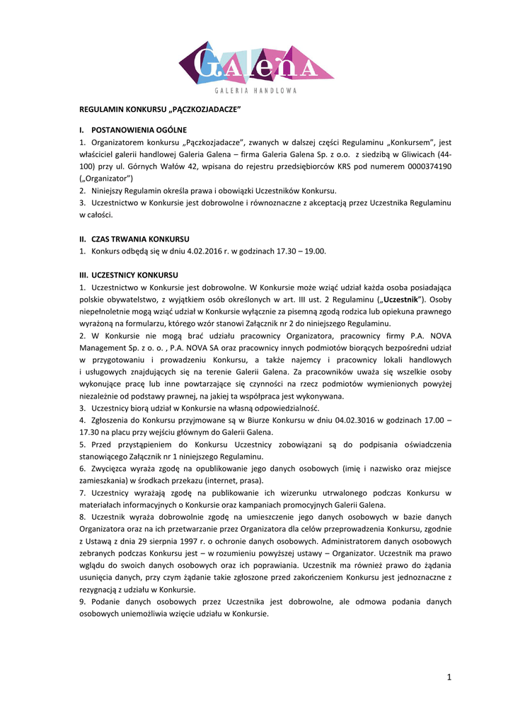 REGULAMIN KONKURSU „PĄCZKOZJADACZE” I. POSTANOWIENIA OGÓLNE 1. Organizatorem konkursu „Pączkozjadacze”, zwanych w dalszej części Regulaminu „Konkursem”, jest właściciel galerii handlowej Galeria Galena – firma Galeria Galena Sp. z o.o. z siedzibą w Gliwicach (44100) przy ul. Górnych Wałów 42, wpisana do rejestru przedsiębiorców KRS pod numerem 0000374190 („Organizator”) 2. Niniejszy Regulamin określa prawa i obowiązki Uczestników Konkursu. 3. Uczestnictwo w Konkursie jest dobrowolne i równoznaczne z akceptacją przez Uczestnika Regulaminu w całości. II. CZAS TRWANIA KONKURSU 1. Konkurs odbędą się w dniu 4.02.2016 r. w godzinach 17.30 – 19.00. III. UCZESTNICY KONKURSU 1. Uczestnictwo w Konkursie jest dobrowolne. W Konkursie może wziąć udział każda osoba posiadająca polskie obywatelstwo, z wyjątkiem osób określonych w art. III ust. 2 Regulaminu („Uczestnik”). Osoby niepełnoletnie mogą wziąć udział w Konkursie wyłącznie za pisemną zgodą rodzica lub opiekuna prawnego wyrażoną na formularzu, którego wzór stanowi Załącznik nr 2 do niniejszego Regulaminu. 2. W Konkursie nie mogą brać udziału pracownicy Organizatora, pracownicy firmy P.A. NOVA Management Sp. z o. o. , P.A. NOVA SA oraz pracownicy innych podmiotów biorących bezpośredni udział w przygotowaniu i prowadzeniu Konkursu, a także najemcy i pracownicy lokali handlowych i usługowych znajdujących się na terenie Galerii Galena. Za pracowników uważa się wszelkie osoby wykonujące pracę lub inne powtarzające się czynności na rzecz podmiotów wymienionych powyżej niezależnie od podstawy prawnej, na jakiej ta współpraca jest wykonywana. 3. Uczestnicy biorą udział w Konkursie na własną odpowiedzialność. 4. Zgłoszenia do Konkursu przyjmowane są w Biurze Konkursu w dniu 04.02.3016 w godzinach 17.00 – 17.30 na placu przy wejściu głównym do Galerii Galena. 5. Przed przystąpieniem do Konkursu Uczestnicy zobowiązani są do podpisania oświadczenia stanowiącego Załącznik nr 1 niniejszego Regulaminu. 6. Zwycięzca wyraża zgodę na opublikowanie jego danych osobowych (imię i nazwisko oraz miejsce zamieszkania) w środkach przekazu (internet, prasa). 7. Uczestnicy wyrażają zgodę na publikowanie ich wizerunku utrwalonego podczas Konkursu w materiałach informacyjnych o Konkursie oraz kampaniach promocyjnych Galerii Galena. 8. Uczestnik wyraża dobrowolnie zgodę na umieszczenie jego danych osobowych w bazie danych Organizatora oraz na ich przetwarzanie przez Organizatora dla celów przeprowadzenia Konkursu, zgodnie z Ustawą z dnia 29 sierpnia 1997 r. o ochronie danych osobowych. Administratorem danych osobowych zebranych podczas Konkursu jest – w rozumieniu powyższej ustawy – Organizator. Uczestnik ma prawo wglądu do swoich danych osobowych oraz ich poprawiania. Uczestnik ma również prawo do żądania usunięcia danych, przy czym żądanie takie zgłoszone przed zakończeniem Konkursu jest jednoznaczne z rezygnacją z udziału w Konkursie. 9. Podanie danych osobowych przez Uczestnika jest dobrowolne, ale odmowa podania danych osobowych uniemożliwia wzięcie udziału w Konkursie. 1 IV. ZASADY I PRZEBIEG KONKURSU 1. Ilość pączków do zjedzenia: 5 sztuk. Pączki zostaną dostarczone przez Organizatora. 2. Na czas Konkursu każdy Uczestnik otrzyma butelkę wody niegazowanej o pojemności 0,5 l. 3. Zwycięzcą Konkursu zostanie Uczestnik, który w najkrótszym czasie zje 5 pączków i poinformuje o tym poprzez podniesienie do góry ręki. 4. Prawidłowy przebieg Konkursu nadzorować będzie Komisja powołana przez Organizatora. 5. W Konkursie może wystartować maksymalnie 30 osób. O uczestnictwie decyduje kolejność zgłoszeń. Konkurs odbywać się będzie w turach po maksymalnie 4 zawodników, zgodnie z kolejnością zgłoszeń. 6. W przypadku uzyskania dwóch lub większej ilości takich samych czasów, Organizator zastrzega sobie prawo do przeprowadzenia dogrywki. 7. Wyniki Konkursu zostaną ogłoszone niezwłocznie po ich ustaleniu przez Komisję. 8. Decyzje Komisji są ostateczne i wiążące. V. NAGRODY 1. Zwycięzca otrzyma tytuł Najszybszego Pączkozjadacza Galerii Galena 2016, dyplom, komplet gadżetów Galerii Galena oraz nagrodę w postaci bonu na zakupy w Carrefour o wartości 200 zł. 2. Organizator oświadcza, że łączna wartość nagród dla Zwycięzcy w Konkursie nie przekracza kwoty 760 zł brutto (zgodnie z art. 21 pkt 1 ppkt 68 ustawy o podatku dochodowym od osób fizycznych) i tym samym nagroda jest zwolniona z podatku dochodowego od wygranych w konkursach. VI. POSTANOWIENIA KOŃCOWE 1. Regulamin dostępny jest w siedzibie Organizatora, w Biurze Administracji Galerii Galena oraz na stronie www.galeriagalena.pl 2. Nagrody nie podlegają zamianie na równowartość pieniężną. 3. Wszelkie reklamacje dotyczące Konkursu powinny być zgłaszane w formie pisemnej wraz z uzasadnieniem w terminie 7 dni od daty Konkursu. Organizator jest zobowiązany do rozpatrzenia reklamacji w ciągu 14 dni od daty otrzymania pisma składającego reklamację. 4. Organizator zastrzega sobie prawo do zmiany terminu i miejsca przeprowadzenia Konkursu, terminu i miejsca publikacji Regulaminu oraz ogłoszenia wyników. 5. W przypadku wątpliwości dotyczących zasad Konkursu Organizator zastrzega sobie prawo do interpretacji przedstawionych w niniejszym Regulaminie zasad i warunków. 6. Organizator zastrzega sobie prawo do odwołania Konkursu bez podania przyczyny. 7. Wszelkie spory powstałe na tle niniejszych Regulaminu będą rozpoznawane przez rzeczowo i miejscowo właściwy sąd powszechny – zgodnie z obowiązującymi przepisami prawa. Załącznik nr 1 OŚWIADCZENIE UCZESTNIKA KONKURSU Ja, niżej podpisany(a): Imię i nazwisko: ……………………………………………………………………………………………………………. Adres zamieszkania(ulica, numer domu, numer mieszkania, kod pocztowy miasto): 