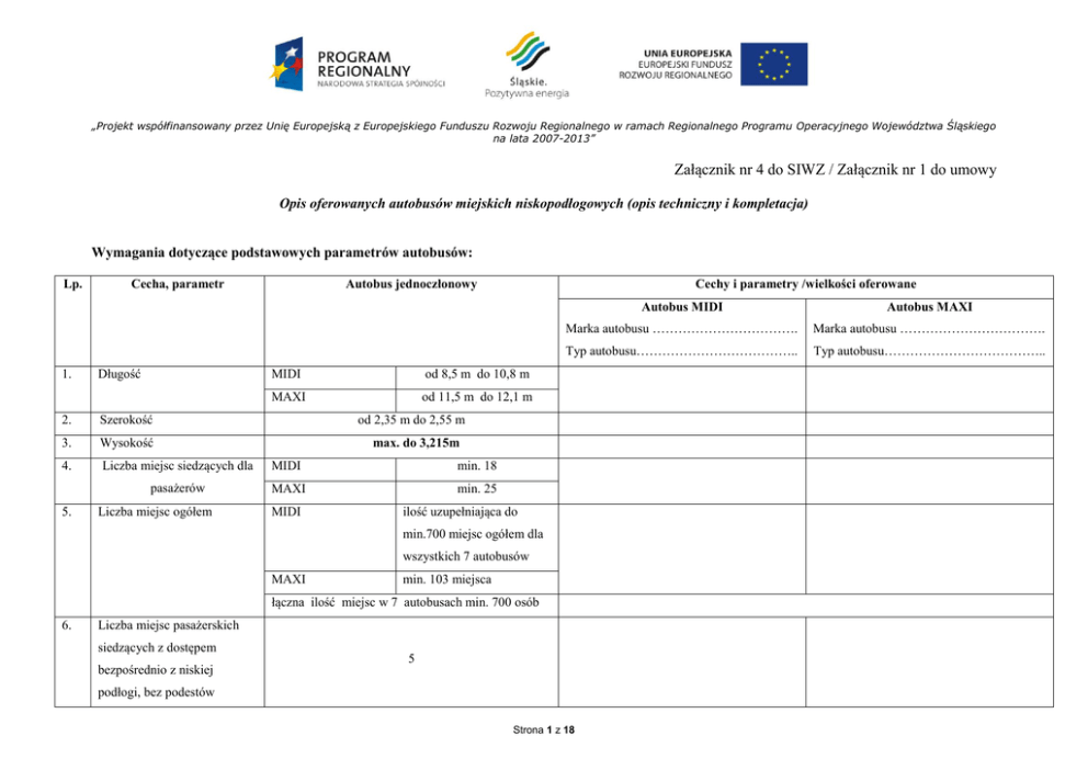 „Projekt współfinansowany przez Unię Europejską z Europejskiego Funduszu Rozwoju Regionalnego w ramach Regionalnego Programu Operacyjnego Województwa Śląskiego na lata 2007-2013” Załącznik nr 4 do SIWZ / Załącznik nr 1 do umowy Opis oferowanych autobusów miejskich niskopodłogowych (opis techniczny i kompletacja) Wymagania dotyczące podstawowych parametrów autobusów: Lp. 1. Autobus jednoczłonowy Cecha, parametr Długość MIDI od 8,5 m do 10,8 m MAXI od 11,5 m do 12,1 m 2. Szerokość 3. Wysokość 4. Liczba miejsc siedzących dla MIDI min. 18 pasażerów MAXI min. 25 5. Liczba miejsc ogółem Cechy i parametry /wielkości oferowane Autobus MIDI Autobus MAXI Marka autobusu ……………………………. Marka autobusu ……………………………. Typ autobusu……………………………….. Typ autobusu……………………………….. od 2,35 m do 2,55 m max. do 3,215m MIDI ilość uzupełniająca do min.700 miejsc ogółem dla wszystkich 7 autobusów MAXI min. 103 miejsca łączna ilość miejsc w 7 autobusach min. 700 osób 6. Liczba miejsc pasażerskich siedzących z dostępem bezpośrednio z niskiej 5 podłogi, bez podestów Strona 1 z 18 „Projekt współfinansowany przez Unię Europejską z Europejskiego Funduszu Rozwoju Regionalnego w ramach Regionalnego Programu Operacyjnego Województwa Śląskiego na lata 2007-2013” 7. Liczba miejsc dla wózków 8. Liczba drzwi dla pasażerów 9. wózek inwalidzki – 1 lub wózek dziecięcy – 1 MIDI nie mniej niż 2 MAXI nie mniej niż 3 Szerokość czynna w świetle drzwi (pomiar na wysokości min. 1200 mm ±1,2m od podłoża) 10. Układ drzwi 11. Podłoga 12. Liczba osi 13. Moc silnika / moment MIDI 1 - 2 lub 2-2 MAXI 2-2–2 Preferowana niska podłoga o jednakowej wysokości na całej długości autobusu bez stopni poprzecznych wzdłuż całego ciągu komunikacyjnego. Zamawiający wymaga wysokości podłogi od podłoża do wszystkich wejść – max. 360 mm. 2 MIDI - min. 130 KW min. 650 Nm MAXI min. 150 KW min. 1000 Nm obrotowy Wymagania szczegółowe dotyczące kompletacji i wyposażenia: Lp. 1. Zespół, instalacja Silnik Cechy i parametry /wielkości oferowane Wymagania Autobus MIDI Pojemność silnika: - dla MIDI od 4,0 dcm3, - dla MAXI od 6,0 dcm3, Strona 2 z 18 Autobus MAXI „Projekt współfinansowany przez Unię Europejską z Europejskiego Funduszu Rozwoju Regionalnego w ramach Regionalnego Programu Operacyjnego Województwa Śląskiego na lata 2007-2013” 2. Zbiornik paliwa 3. Zbiornik AdBlue (jeśli występuje) Układ chłodzenia silnika i ogrzewanie wnętrza autobusu silnik czterosuwowy, rzędowy, chłodzony cieczą, wysokoprężny z bezpośrednim wtryskiem paliwa, spełniający normę emisji min. Euro 5, układ turbodoładowania z chłodzeniem powietrza doładowującego, filtr powietrza typu suchego ze wskaźnikiem zabrudzenia, podgrzewacz rozruchu i podgrzewany filtr paliwa, blokada uruchomienia silnika przy otwartej pokrywie, złącze diagnostyczne umożliwiające diagnozowanie silnika z zewnętrznego urządzenia diagnostycznego w raz z licencjonowanym oprogramowaniem diagnostycznym w j.polskim wyposażony w wyłącznik gaszenia silnika umieszczony pod zewnętrzną klapką tylną komory silnika; zbiornik paliwa wykonany z materiału odpornego na korozję o pojemności min. 150 l układ paliwowy autobusu dostosowany do zasilania ON i biopaliwem – min. B6 Układ paliwowy wyposażony w podgrzewany filtr paliwa Zaopatrzony we wlew z błyskawicznym zamknięciem. Wlew paliwa umożliwiający założenie zabezpieczeń Zbiornik na roztwór mocznika poj. min. 20 dcm³ (dotyczy silników wyposażonych w system SCR) opomiarowany w sposób umożliwiający pełną kontrolę i rozliczanie zużycia związku i zabezpieczony przed oddziaływaniem niskich temperatur. Wskaźnik zużycia umieszczony na desce rozdzielczej kierowcy. Od Wykonawcy autobusów, w których czystość spalin określona normą Euro 5, jest osiągana poprzez system selektywnej redukcji katalitycznej [SCR] wymaga się dostarczenia i instalację w ramach zamówienia stacji napełniania AdBlue w miejscu wskazanym przez zamawiającego na zajezdni Zakładu Komunikacji Miejskiej ul. Polska 21– o pojemności napełniania AdBlue nie mniejszej niż 2000 litrów, z wyposażeniem w licznik pomiarowy, wąż giętki, automatyczny pistolet rury układu chłodzenia i ogrzewania wykonane z materiałów odpornych na korozję (miedź, mosiądz lub tworzywo) połączonych ze sobą złączami z gumy silikonowej, termoizolowane w miejscach tego wymagających, zbiornik wyrównawczy wykonany z materiału odpornego na Strona 3 z 18 „Projekt współfinansowany przez Unię Europejską z Europejskiego Funduszu Rozwoju Regionalnego w ramach Regionalnego Programu Operacyjnego Województwa Śląskiego na lata 2007-2013” 4. Skrzynia biegów korozję, umożliwiający kontrolę poziomu płynu dodatkowo sygnalizacja na desce rozdzielczej niskiego poziomu płynu ogrzewanie wnętrza autobusu wykorzystujące ciepło z układu chłodzenia silnika i automatycznej skrzyni biegów, realizowane za pomocą grzejników konwektorowych oraz przez nagrzewnice z wentylatorami (jedna nagrzewnica w kabinie kierowcy) lub inny system ogrzewania zapewniający spełnienie wszystkich warunków i wymagań pkt 3), konstrukcja nagrzewnic bezpieczna, zabezpieczająca przed zranieniem oraz uszkodzeniem odzieży pasażerów, układ oszczędnościowy, który przy wyłączonym silniku automatycznie wyłącza wszystkie nagrzewnice w przestrzeni pasażerskiej, silniki wentylatorów nagrzewnic z regulowaną prędkością obrotową, podłączony do układu chłodzenia, niezależny od pracy silnika agregat grzewczy zasilany z osobnego zbiornika paliwa, system ogrzewania powinien zapewnić utrzymanie w okresie jesienno –zimowym minimalnej temperatury wewnątrz w pojeździe min +10 ºC przy temperaturze zewnętrznej -15 oC. system ogrzewania wnętrza autobusu grzejnikami konwertorowy