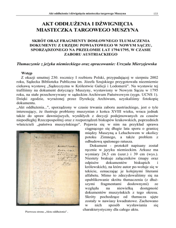 Akt oddłużenia i dźwignięcia miasteczka targowego Muszyna 133 AKT ODDŁUŻENIA I DŹWIGNIĘCIA MIASTECZKA TARGOWEGO MUSZYNA SKRÓT ORAZ FRAGMENTY DOSŁOWNEGO TŁUMACZENIA DOKUMENTU Z URZĘDU POWIATOWEGO W NOWYM SĄCZU, SPORZĄDZONEGO NA PRZEŁOMIE LAT 1794/1795, W CZASIE ZABORU AUSTRIACKIEGO Tłumaczenie z jeżyka niemieckiego oraz opracowanie: Urszula Mierzejewska Wstęp Z okazji smutnej 230. rocznicy I rozbioru Polski, przypadającej w sierpniu 2002 roku, Sądecka Biblioteka Publiczna im. Józefa Szujskiego przygotowała niezmiernie ciekawą wystawę „Sądecczyzna w Królestwie Galicji i Lodomerii". Na wystawie tej trafiliśmy na dokument dotyczący Muszyny, wystawiony w Nowym Sączu w 1795 roku, na stałe przechowywany w sądeckim Archiwum Państwowym (sygn. UCNS 1). Dzięki zgodzie, wyrażonej przez Dyrekcję Archiwum, uzyskaliśmy fotokopię dokumentu. „Akt oddłużenia...", sporządzony w czasie trwania zaboru austriackiego, jest o tyle interesujący, że ilustruje problemy muszynian z końca XVIII wieku, wraca jednak także do spraw dawniejszych, wynikłych z decyzji podejmowanych za czasów niepodległej Rzeczpospolitej oraz z rozporządzeń biskupów krakowskich, poprzednich właścicieli „państwa muszyńskiego". Pojawia się w nim na przykład sprawa ciągnącego się długie lata sporu o granicę między Muszyną a Leluchowem w okolicy potoku Zimnego, a także problem z odbudową spalonego ratusza. Dokument - protokół napisany został ręcznie w języku niemieckim. Arkusz ma wymiary 24,5 cm (szer.) i 39 cm (wys.). Niestety brakuje załączników (mapy oraz odpisów dokumentów biskupich i królewskich), na które autor po-wołuje się w tekście, oznaczając je kolejnymi literami alfabetu. Mimo to zdecydowaliśmy się na opublikowanie skrótu tłumaczenia (z dłuższymi fragmentami dosłownymi) ze względu na niewielką dostępność dokumentów muszyńskich z tego okresu. Skróty pochodzące od tłumacza ujęte zostały w nawiasy kwadratowe. Zachowano w nich sposób wysławiania się charakterystyczny dla całego aktu. Pierwsza strona „Aktu oddłużenia".. 134 Urszula Mierzejewska Nr aktu 422 z dnia 17 stycznia 1795 r. WIELCE SZANOWNY CK SĄDECKI URZĄD POWIATOWY! Niżej podpisany uniżenie przedstawia AKT ODDŁUŻENIA I DŹWIGNIĘCIA MIASTECZKA TARGOWEGO MUSZYNA [Na początku następuje wyjaśnienie, dlaczego ww. akt został przedstawiony urzędowi z opóźnieniem. Zostało to spowodowane tym, że czekano na zarządzoną przez wysoki urząd regulację spisu inwentarza gruntów i danin, o który toczy się spór. Jest on głównym przedmiotem oddłużenia.] Wyjaśnia się to następująco: Miasteczko targowe MUSZYNA jest uważane przez władze gruntowe za miasteczko książąt biskupów krakowskich, posiadające potwierdzenie praw księcia biskupa Radziwiłła z r. 1589, który to akt został przez Sąd Targowy złożony do protokołu pod literą B. Tymczasem również Sąd Targowy dołączył do protokołu - pod literą A dokument z 1391 r. króla Władysława Jagiełły, z którego wynika, że miasteczko to figurowało jako królewska darowizna i to pod nazwą Powroźniki. Przez niepokoje wojenne, pożary lub inne nieszczęścia utraciło ono pierwotne prawa i zmuszone jest ponownie starać się o potwierdzenie praw miejskich. OBSZAR MIEJSKICH GRUNTÓW Granice tego miasteczka targowego opisano w powyższym potwierdzeniu praw miejskich jasno i wyraźnie, i według tego wszystkie grunty istniejące zostały umieszczone na mapie geometrycznej [sic], która znajduje się w protokole pod literą D. Co prawda gmina miejska w r. 1788 rościła sobie prawo do - należącego do wsi Leluchów i w mapie oznaczonego literami A, B i nr 1 - dominialnego lasu, w związku z tym otrzymała [wydany] przez wspólną komisję prowizoryczny dekret na korzyść gminy, który został przez Wysoki Urząd Krajowy potwierdzony w 1788 roku pod liczbą 26552. Ponieważ jednak sołtys leluchowski - jako właściciel łąki wydzielonej z ww. lasu - zakwestionował wynik sporu, uzyskał ponowne rozpatrzenie zapadłej uchwały. Tym samym granica gminy miejskiej została przez drugą komisję cofnięta do linii czerwonej na mapie, to znaczy do prawdziwej granicy To drugie orzeczenie zostało zaaprobowane według tymczasowego badania przez krakowski Urząd Fiskalny, zatwierdzone przez szanowną Gubernię Krajową 16 XI1791 r. pod nr 26746. Przede wszystkim jednak [zostało zaaprobowane] na podstawie poprzedniego biskupiego komisyjnego dekretu z 14 VIII 1613 r. Nie zważając na dokumenty o granicach, podanych dekretach i komisji, a szczególnie bez względu na dotychczasowe spokojne użytkowanie miejskiej własności, kameralne dominia ponownie zażądały prawa własności na wszystkie pozostałe miejskie tereny leśne. Przedmiot sporu przedstawiono - wbrew wszystkim komisyjnym orzeczeniom Wysokiemu Urzędowi Krajowemu celem rozstrzygnięcia. Akt oddłużenia i dźwignięcia miasteczka targowego Muszyna 135 OBCE JURYSDYKCJE W OBRĘBIE MIEJSKIM Jedynie zwierzchnictwo ówczesnego majątku z fundacji religijnej posiada w obrębie miejskim grunty i wykonuje tam swoją jurysdykcję. Grunty te sana mapie oznaczone literami L, M, N, O, P i należały przedtem widocznie do mieszczan, a to: L - jest to pole, o czym świadczy spis inwentarza gruntu z 1768 r., które należało do mieszczanina Sobczaka, a zostało zabrane za długi i włączone do gruntów folwarcznych. Ponieważ jednak mieszczan i chłopów obowiązywało prawo rugowe - wyegzekwowane przez zwierzchnictwo grzywnami pieniężnymi - to istnieje możliwość, że zabranie pola wiąże się z taką karą. M i N - były właściwymi gruntami mieszczańskimi i należały do braci Szostów, których synowie jeszcze żyją. Książę biskup Andrzej Załuski [1746-1758] natomiast myślał o pomnożeniu dochodów i założeniu potażami i odkupił jako własność dziedziczną od braci Szostów - wg protokołu litera E - w roku 1751 te grunty dl