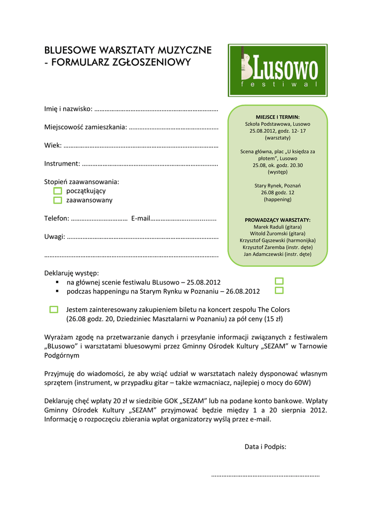 BLUESOWE WARSZTATY MUZYCZNE - FORMULARZ ZGŁOSZENIOWY Imię i nazwisko: ……………………………………………………………… Miejscowość zamieszkania: ……………………………………………. Wiek: ……………………………………………………………………………… Instrument: ……………………………………………………………………. Stopień zaawansowania: początkujący zaawansowany MIEJSCE I TERMIN: Szkoła Podstawowa, Lusowo 25.08.2012, godz. 12- 17 (warsztaty) Scena główna, plac „U księdza za płotem”, Lusowo 25.08, ok. godz. 20.30 (występ) Stary Rynek, Poznań 26.08 godz. 12 (happening) Telefon: …………………………… E-mail…………………................ Uwagi: ……………………………………………………………………………. ……………………………………………………………………………………….. PROWADZĄCY WARSZTATY: Marek Raduli (gitara) Witold Żuromski (gitara) Krzysztof Gąszewski (harmonijka) Krzysztof Zaremba (instr. dęte) Jan Adamczewski (instr. dęte) Deklaruję występ: na głównej scenie festiwalu BLusowo – 25.08.2012 podczas happeningu na Starym Rynku w Poznaniu – 26.08.2012 Jestem zainteresowany zakupieniem biletu na koncert zespołu The Colors (26.08 godz. 20, Dziedziniec Masztalarni w Poznaniu) za pół ceny (15 zł) Wyrażam zgodę na przetwarzanie danych i przesyłanie informacji związanych z festiwalem „BLusowo” i warsztatami bluesowymi przez Gminny Ośrodek Kultury „SEZAM” w Tarnowie Podgórnym Przyjmuję do wiadomości, że aby wziąć udział w warsztatach należy dysponować własnym sprzętem (instrument, w przypadku gitar – także wzmacniacz, najlepiej o mocy do 60W) Deklaruję chęć wpłaty 20 zł w siedzibie GOK „SEZAM” lub na podane konto bankowe. Wpłaty Gminny Ośrodek Kultury „SEZAM” przyjmować będzie między 1 a 20 sierpnia 2012. Informację o rozpoczęciu zbierania wpłat organizatorzy wyślą przez e-mail. Data i Podpis: ………………………………………………………