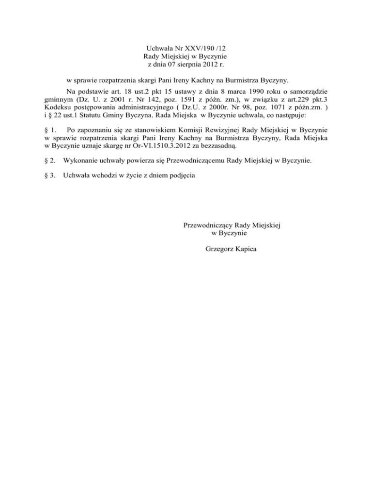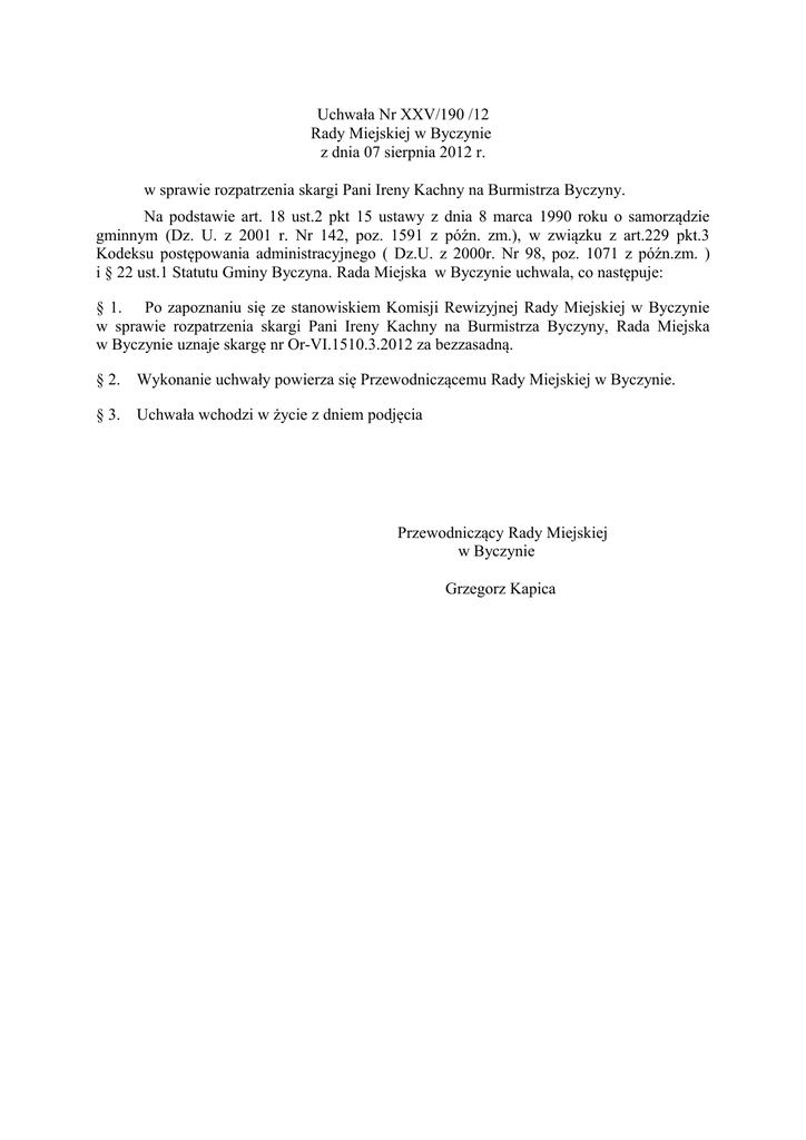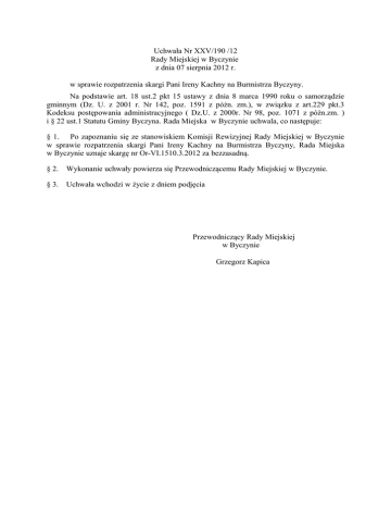 Uchwała Nr XXV/190 /12 Rady Miejskiej w Byczynie z dnia 07 sierpnia 2012 r. w sprawie rozpatrzenia skargi Pani Ireny Kachny na Burmistrza Byczyny. Na podstawie art. 18 ust.2 pkt 15 ustawy z dnia 8 marca 1990 roku o samorządzie gminnym (Dz. U. z 2001 r. Nr 142, poz. 1591 z późn. zm.), w związku z art.229 pkt.3 Kodeksu postępowania administracyjnego ( Dz.U. z 2000r. Nr 98, poz. 1071 z późn.zm. ) i § 22 ust.1 Statutu Gminy Byczyna. Rada Miejska w Byczynie uchwala, co następuje: § 1. Po zapoznaniu się ze stanowiskiem Komisji Rewizyjnej Rady Miejskiej w Byczynie w sprawie rozpatrzenia skargi Pani Ireny Kachny na Burmistrza Byczyny, Rada Miejska w Byczynie uznaje skargę nr Or-VI.1510.3.2012 za bezzasadną. § 2. Wykonanie uchwały powierza się Przewodniczącemu Rady Miejskiej w Byczynie. § 3. Uchwała wchodzi w życie z dniem podjęcia Przewodniczący Rady Miejskiej w Byczynie Grzegorz Kapica Stanowisko Komisji Rewizyjnej dot. skargi Pani Ireny Kachny na działalność Burmistrza Byczyna, że posiadając wiedzę o zagrożeniu zdrowia mieszkańców Biskupic, w związku ze skażeniem wody, nie podjął bezzwłocznie czynności powodujących usunięcie przyczyn zagrożenia . Komisja Rewizyjna przeprowadziła kontrolę w Urzędzie Miejskim w Byczynie na podstawie upoważnienia Nr Or - II 0012.1.42.2012 z dnia 24.07.2012 r. Komisja uzgodniła wspólne stanowisko w składzie: 1) Kulisiński Jacek –przewodniczący komisji, 2) Kaniewska Róża- z-ca przewodniczącego komisji, 3) Rudziewicz Jolanta- członek komisji, 4) Buła Władysław- członek komisji, 5) Robert Świerczek- członek komisji. Wyjaśnień w trakcie rozpatrywania w/w skargi udzielili: 1) Maciej Tomaszczyk- Sekretarz Gminy, 2) Małgorzata Zabierowska- Dyrektor SANEPIDU, 3) Janina Ziemiańska- Kierownik SANEPIDU. Na wstępie posiedzenia Komisja Rewizyjna zapoznała się z całością prowadzonych działań w okresie od 17 III 2012 do 26 III 2012 r. przez Zakład Gospodarki Komunalnej, wydanymi w tej sprawie komunikatami przez Państwowy Powiatowy Inspektorat Sanitarny w Kluczborku, jak również przez Urząd Miejski w Byczynie oraz ZGK Sp.z.o.o. Awaria sieci wodociągowej miała miejsce w nocy z 16.03.2012 r. na 17.03.2012 r. na odcinku Polanowice- Biskupice. Awaria została usunięta w dniu 17.03.2012 r. Pierwsza informacja o zaistniałej awarii dotarła do Pani Dyrektor SANEPIDU 17.03.2012 r. od osoby prywatnej. Jeszcze 17.03.2012 r. Pani Dyrektor SANEPIDU kontaktowała się telefonicznie z Sekretarzem Gminy - Panem Tomaszczykiem, oraz prezesem ZGK Sp.z.o.o - Panem Krzysztofem Sikorskim. Pierwsze próby wody zostały pobrane przez pracowników SANEPIDU w dniu 19.03.2012 r. to jest w poniedziałek, a wyniki badań ogłoszono w dniu 22.03.2012 r. na stronie internetowej Gminy Byczyna. W komunikacie informowano, że w pobranych próbkach wody w dniu 19.03. 2012 r. nie stwierdzono zanieczyszczenia mikrobiologicznego. Komunikat ten został w formie pisemnej przekazany sołtysowi Biskupic w dniu 22.03.2012 r. W dniu 23.03.2012 r. Sanepid wydał kolejny Komunikat ( zamieszczony również na stronie internetowej gminy) informujący o stwierdzonym zanieczyszczeniu mikrobiologicznym w pobranych próbkach wody. W komunikacie podano, że woda w miejscowości Biskupice i Kochłowice nie nadaje się do picia oraz przygotowania posiłków, a kontakt z wodą może powodować zagrożenie zdrowia. W tym samym dniu ukazało się również ogłoszenie Prezesa ZGK Sp.z.o.o informujące o tym, że woda nie nadaje się do spożycia. Informacja taka została przekazana w formie SMS, jak również rozwieszono ogłoszenie na terenie wsi Biskupice i Kochłowice. W dniu 26.03.2012 r. ukazał się kolejny Komunikat Państwowego Powiatowego Inspektoratu Sanitarnego w Kluczborku o przydatności wody do spożycia- informacja ta została przekazana w formie SMS oraz zamieszczona na stronie internetowej gminy . W dniu 28.03.2012 r. Państwowy Inspektorat Sanitarny wydał komunikat potwierdzający przydatność wody do spożycia Komisja Rewizyjna wysłuchała również informacji Pani Dyrektor SANEPIDU dotyczącego stwierdzenia faktu przez Panią Irenę Kachny, że wielu mieszkańców cierpiało w tym czasie na niestrawność, ból głowy i wymioty. Wszyscy lekarze leczący na naszym terenie mają obowiązek zgłosić takie przypadki- jednak nie było takiego zgłoszenia. W Komunikacie SANEPID potwierdził, że najbardziej była zanieczyszczona woda w szkole, jednak jak potwierdziła Pani Dyrektor PSP w Biskupicach, dzieci nie korzystały ze skażonej wody. Na potrzeby szkoły dostarczano wodę dobrej jakości. Po rozmowie z Sekretarzem Gminy - Panem Tomaszczykiem nie uzyskano na potrzebę Komisji Rewizyjnej nazwisk osób, do których osobiście wielokrotnie Pani Irena Kachny zgłaszała telefonicznie potrzebę interwencji. Po zapytaniu Pana Tomaszczyka o jakie osoby w Gminie jak i ZGK chodzi, Pani Kachny wycofała się z tego stwierdzenia i przekazała Sekretarzowi Gminy informacje, że osobiście nie telefonowała do niego. Członkowie Komisji Rewizyjnej nie rozmawiali z Panią Kachny osobiście, gdyż w dniu 24.07.2012 r. była nieobecna na posiedzeniu Komisji z powodu pilnego wyjazdu. Komisja została poinformowana również, że w trakcie usuwania awarii jak również po jej usunięciu dla mieszkańców wsi Biskupice i Kochłowice podstawiono beczkowóz z wodą. W okresie po usunięciu awarii wodociągu miało miejsce kilkakrotne płukanie rurociągu poprzez istniejące hydranty. Również mieszkańcy spuszczali wodę z kranów w swoich mieszkaniach. Komisja zapoznała się również z regulaminem dostarczania wody. Instytucją odpowiedzialną za dostarczanie wody na terenie Gminy Byczyna jest Zakład Gospodarki Komunalnej Sp. z o. o. Wszelkie działanie związane ze sprawnym usunięciem awarii, jak również ustaleniem jej przyczyn należą do obowiązków ZGK Sp.z.o.o Prezes spółki - Pan Sikorski na sesji kwietniowej w sposób szczegółowy i 
