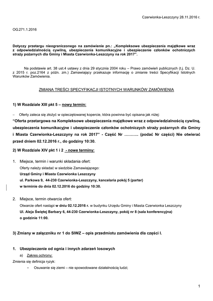 Czerwionka-Leszczyny 28.11.2016 r. OG.271.1.2016 Dotyczy przetargu nieograniczonego na zamówienie pn.: „Kompleksowe ubezpieczenia majątkowe wraz z odpowiedzialnością cywilną, ubezpieczenia komunikacyjne i ubezpieczenie członków ochotniczych straży pożarnych dla Gminy i Miasta Czerwionka-Leszczyny na rok 2017”. Na podstawie art. 38 ust.4 ustawy z dnia 29 stycznia 2004 roku – Prawo zamówień publicznych (t.j. Dz. U. z 2015 r. poz.2164 z późn. zm.) Zamawiający przekazuje informację o zmianie treści Specyfikacji Istotnych Warunków Zamówienia. ZMIANA TREŚCI SPECYFIKACJI ISTOTNYCH WARUNKÓW ZAMÓWIENIA 1) W Rozdziale XIII pkt 5 – nowy termin: Oferty zaleca się złożyć w opieczętowanej kopercie, która powinna być opisana jak niżej: “Oferta przetargowa na Kompleksowe ubezpieczenia majątkowe wraz z odpowiedzialnością cywilną, ubezpieczenia komunikacyjne i ubezpieczenie członków ochotniczych straży pożarnych dla Gminy i Miasta Czerwionka-Leszczyny na rok 2017” - Część Nr ……….. (podać Nr części) Nie otwierać przed dniem 02.12.2016 r., do godziny 10:30. 2) W Rozdziale XIV pkt 1 i 2 - nowe terminy: 1. Miejsce, termin i warunki składania ofert: Oferty należy składać w siedzibie Zamawiającego: Urząd Gminy i Miasta Czerwionka Leszczyny ul. Parkowa 9, 44-230 Czerwionka-Leszczyny, kancelaria pokój 5 (parter) w terminie do dnia 02.12.2016 do godziny 10:30. 2. Miejsce, termin otwarcia ofert: Otwarcie ofert nastąpi w dniu 02.12.2016 r. w budynku Urzędu Gminy i Miasta Czerwionka Leszczyny Ul. Aleja Świętej Barbary 6, 44-230 Czerwionka-Leszczyny, pokój nr 8 (sala konferencyjna) o godzinie 11:00. 3) Zmiany w załączniku nr 1 do SIWZ – opis przedmiotu zamówienia dla części I. 1. Ubezpieczenie od ognia i innych zdarzeń losowych a) Zakres ochrony: Zmienia się definicja ryzyk: Osuwanie się ziemi – nie spowodowane działalnością ludzi; 1 Zapadanie się ziemi - obniżenie poziomu terenu z powodu zawalenia się naturalnych, pustych przestrzeni w głębi Ziemi. W ubezpieczeniu szkód powstałych wskutek zamieszek, sabotażu, strajków, aktów terroryzmu – limit 100 000,00 PLN na jedno i wszystkie zdarzenia w okresie ubezpieczenia, Z zakresu ochrony ubezpieczeniowej wyłącza się dodatkowo szkody : b) powstałe wskutek skażenia biologicznego, chemicznego oraz radioaktywnego; Klauzule: Uzupełnia się treść klauzuli: Klauzula mienia wyłączonego z eksploatacji: Ubezpieczyciel obejmuje ochroną ubezpieczeniową wyłączone z eksploatacji budynki i budowle oraz mienie znajdujące się w nich. Zakres ubezpieczenie obejmuje: pożar, uderzenie pioruna, eksplozja, implozja, upadek statku powietrznego. Limit odpowiedzialności (na jedno i wszystkie zdarzenia) 200 000,00 PLN Dodatkowe zapisy: Poniższe wymogi warunkują odpowiedzialność wykonawcy. 1) mienie wyłączone z eksploatacji podlega stałemu dozorowi; 2) wszelkie maszyny, urządzenia są odłączone od źródeł zasilania oraz odpowiednio zakonserwowane; 3) wszystkie instalacje podlegają bieżącej konserwacji 4) środki zabezpieczenia mienia (zabezpieczenia przeciwpożarowe i przeciwkradzieżowe) utrzymywane są w pełnej sprawności i gotowości do użycia Zmienia się treść klauzuli: Klauzula zabezpieczeń przeciwpożarowych: “Ubezpieczyciel oświadcza, iż jest mu znany stan zabezpieczeń przeciwpożarowych ubezpieczonego mienia i uznaje je za wystarczające - pod warunkiem że zabezpieczenia p.poż są zgodne z obowiązującymi przepisami” Zmienia się treść klauzuli: Klauzula przeoczenia zgłoszenia mienia do ubezpieczenia: Ubezpieczyciel zobowiązany jest do wypłaty odszkodowania w przypadku nie zgłoszenia mienia w trakcie trwania umowy ubezpieczenia. Składka oraz limit odpowiedzialności Ubezpieczyciela za mienie nie zgłoszone będzie naliczona zgodnie klauzulą automatycznego pokrycia. Należna składka z tego tytułu może być potrącona z odszkodowania. Limit na jedno i wszystkie zdarzenia w okresie ubezpieczenia: 200.000 PLN 2. Ubezpieczenie od kradzieży, rabunku i dewastacji a) Ubezpieczone ryzyka: - uzupełnia się zapisy dotyczące kradzieży zwykłej: - kradzież zwykła - zabór mienia bez znamion włamania, czy też rozboju. W odniesieniu do kradzieży zwykłej klauzula nie ma zastosowania do gotówki i wartości pieniężnych, a jedynie do pozostałego 2 mienia. W odniesieniu do ryzyka kradzieży zwykłej jest wymóg, aby Ubezpieczający zawiadomił o tym fakcie Policję bezzwłocznie po stwierdzeniu wystąpienia szkody spowodowanej kradzieżą lub momentu, w którym Ubezpieczający dowiedział się o niej. 4. Ubezpieczenie sprzętu elektronicznego a) Zakres ochrony: Zmienia się definicja ryzyk: - Osuwanie się ziemi – nie spowodowane działalnością ludzi; - Zapadanie się ziemi - obniżenie poziomu terenu z powodu zawalenia się naturalnych, pustych przestrzeni w głębi Ziemi. W ubezpieczeniu szkód powstałych wskutek zamieszek, sabotażu i strajku Z zakresu ochrony ubezpieczeniowej wyłączone są dodatkowo szkody: - powstałe wskutek skażenia biologicznego, chemicznego oraz radioaktywnego; b) Klauzule: Zmienia się treść klauzuli: Klauzula przeoczenia zgłoszenia mienia do ubezpieczenia: Ubezpieczyciel zobowiązany jest do wypłaty odszkodowania w przypadku nie zgłoszenia mienia w trakcie trwania umowy ubezpieczenia. Składka oraz limit odpowiedzialności Ubezpieczyciela za mienie nie zgłoszone będzie naliczona zgodnie klauzulą automatycznego pokrycia. Należna składka z tego tytułu może być potrącona z odszkodowania. Limit na jedno i wszystkie zdarzenia w okresie ubezpieczenia: 200.000 PLN c) Uzgodnienia dodatkowe: Zmienia się opis dotyczący ryzyka kradzieży zwykłej: - Włączenie kradzieży zwykłej – limit na jedno i wszystkie zdarzenia 20 000,00 PLN. Kradzież zwykła - zabór mienia bez znamion włamania, czy też rozboju. W odniesieniu do ryzyka kradzieży zwykłej jest wymóg, aby Ubezpieczający zawiadomił o t