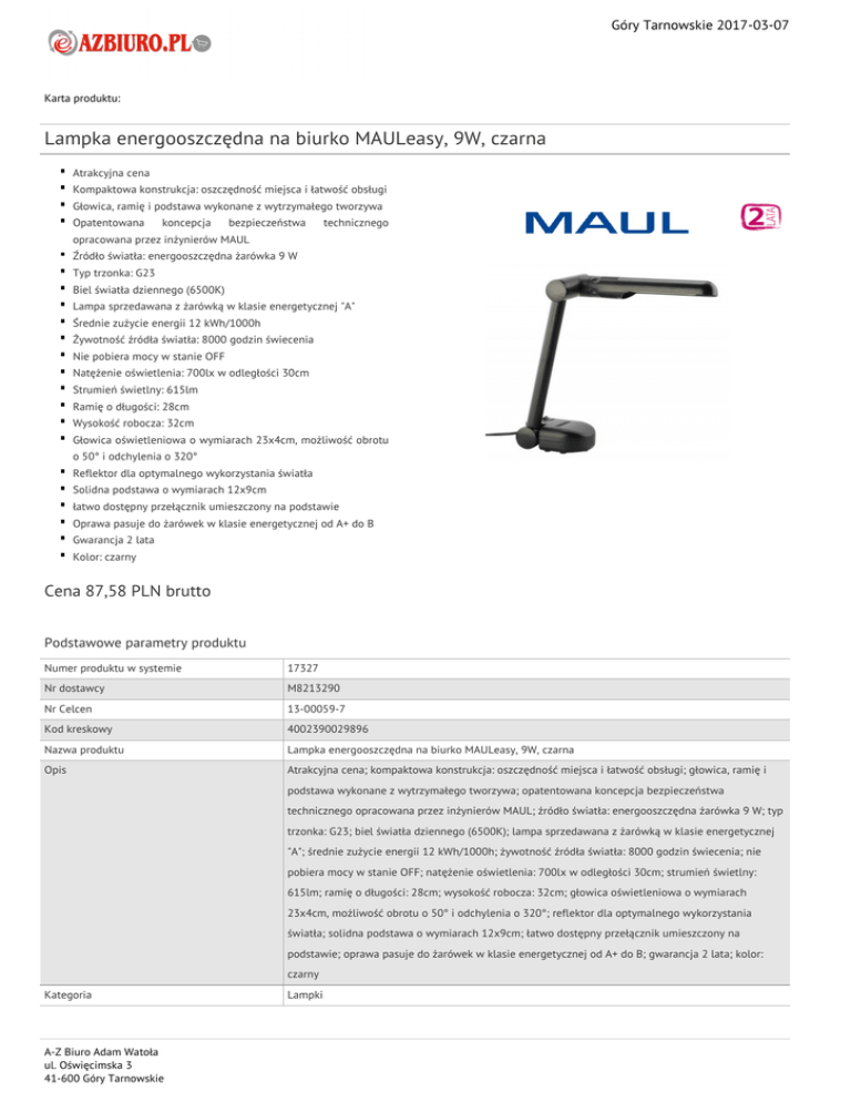 Góry Tarnowskie 2017-03-07 Karta produktu: Lampka energooszczędna na biurko MAULeasy, 9W, czarna Atrakcyjna cena Kompaktowa konstrukcja: oszczędność miejsca i łatwość obsługi Głowica, ramię i podstawa wykonane z wytrzymałego tworzywa Opatentowana koncepcja bezpieczeństwa technicznego opracowana przez inżynierów MAUL Źródło światła: energooszczędna żarówka 9 W Typ trzonka: G23 Biel światła dziennego (6500K) Lampa sprzedawana z żarówką w klasie energetycznej "A" Średnie zużycie energii 12 kWh/1000h Żywotność źródła światła: 8000 godzin świecenia Nie pobiera mocy w stanie OFF Natężenie oświetlenia: 700lx w odległości 30cm Strumień świetlny: 615lm Ramię o długości: 28cm Wysokość robocza: 32cm Głowica oświetleniowa o wymiarach 23x4cm, możliwość obrotu o 50° i odchylenia o 320° Reflektor dla optymalnego wykorzystania światła Solidna podstawa o wymiarach 12x9cm łatwo dostępny przełącznik umieszczony na podstawie Oprawa pasuje do żarówek w klasie energetycznej od A+ do B Gwarancja 2 lata Kolor: czarny Cena 87,58 PLN brutto Podstawowe parametry produktu Numer produktu w systemie 17327 Nr dostawcy M8213290 Nr Celcen 13-00059-7 Kod kreskowy 4002390029896 Nazwa produktu Lampka energooszczędna na biurko MAULeasy, 9W, czarna Opis Atrakcyjna cena; kompaktowa konstrukcja: oszczędność miejsca i łatwość obsługi; głowica, ramię i podstawa wykonane z wytrzymałego tworzywa; opatentowana koncepcja bezpieczeństwa technicznego opracowana przez inżynierów MAUL; źródło światła: energooszczędna żarówka 9 W; typ trzonka: G23; biel światła dziennego (6500K); lampa sprzedawana z żarówką w klasie energetycznej "A"; średnie zużycie energii 12 kWh/1000h; żywotność źródła światła: 8000 godzin świecenia; nie pobiera mocy w stanie OFF; natężenie oświetlenia: 700lx w odległości 30cm; strumień świetlny: 615lm; ramię o długości: 28cm; wysokość robocza: 32cm; głowica oświetleniowa o wymiarach 23x4cm, możliwość obrotu o 50° i odchylenia o 320°; reflektor dla optymalnego wykorzystania światła; solidna podstawa o wymiarach 12x9cm; łatwo dostępny przełącznik umieszczony na podstawie; oprawa pasuje do żarówek w klasie energetycznej od A+ do B; gwarancja 2 lata; kolor: czarny Kategoria A-Z Biuro Adam Watoła ul. Oświęcimska 3 41-600 Góry Tarnowskie Lampki Góry Tarnowskie 2017-03-07 Karta katalogowa produktu cd. Lampka energooszczędna na biurko MAULeasy, 9W, czarna Klasa Premium Marka MAUL Cecha Cykl życia (h) 8000 Typ Energooszczędna Natężenie światła LUMEN 615 Natężenie światła LUX 700 Klasa energetyczna A W ofercie od 2013-01 Rodzaj 9W Produkt Lampka stojąca Materiał Plastik Wspólny słownik zamówień CPV 31521100-5 Certyfikaty Ilość lat gwarancji 2 Hit Hit Nowy produkt w ofercie Standard Wymiary Wysokość (mm) 320 Kolor Kolor Pozostałe zdjęcia produktu Serdecznie zapraszamy do współpracy A-Z Biuro Adam Watoła ul. Oświęcimska 3 41-600 Góry Tarnowskie Czarny Góry Tarnowskie 2017-03-07 A-Z Biuro Adam Watoła zespół. A-Z Biuro Adam Watoła ul. Oświęcimska 3 41-600 Góry Tarnowskie
