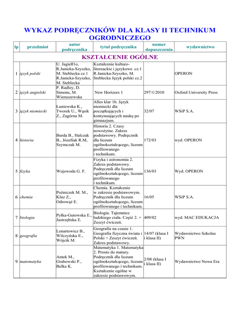 WYKAZ PODRĘCZNIKÓW DLA KLASY II TECHNIKUM OGRODNICZEGO lp przedmiot autor podręcznika tytuł podręcznika numer dopuszczenia wydawnictwo KSZTAŁCENIE OGÓLNE 1 język polski 2 język angielski 3 język niemiecki 4 historia 5 fizyka 6 chemia U. Jagiełł1o, R.Janicka-Szyszko, M. Steblecka cz.1 R.Janicka-Szyszko, M. Steblecka P. Radley, D. Simons, M. Wieruszewska Kształcenie kulturolitereackie i językowe .cz.1 R.Janicka-Szyszko, M. Steblecka Język polski cz.2 New Horizors 1 OPERON 297/1/2010 Alles klar 1b. Język Łuniewska K., niemiecki dla Tworek U., Wąsik początkujących i 32/07 Z., Zagórna M. kontynuujących naukę po gimnazjum. Historia 2. Czasy nowożytne. Zakres Burda B., Halczak podstawowy. Podręcznik B., Józefiak R.M, dla liceum 172/03 Szymczak M. ogólnokształcącego, liceum profilowanego i technikum. Fizyka i astronomia 2. Zakres podstawowy. Podręcznik dla liceum Wojewoda G. F. 136/03 ogólnokształcącego, liceum profilowanego i technikum. Chemia. Kształcenie Poźniczek M. M., w zakresie podstawowym. Kluz Z., Podręcznik dla liceum 16/05 Odrowąż E. ogólnokształcącego, liceum profilowanego i technikum. 7 biologia Biologia. Tajemnice Pyłka-Gutowska E., ludzkiego ciała. Część 2. + 409/02 Jastrzębska E. Zeszyt ćwiczeń. 8 geografia Lenartowicz B., Wilczyńska E., Wójcik M. 9 matematyka Antek M., Grabowski P., Belka K. Geografia na czasie 1. Geografia fizyczna świata i 14/07 (klasa I Polski + Zeszyt ćwiczeń. i klasa II) Zakres podstawowy. Matematyka 1. Matematyka 2. Prosto do matury. Podręcznik dla liceum 2/08 (klasa I ogólnokształcącego, liceum i klasa II) profilowanego i technikum. Kształcenie ogólne w zakresie podstawowym. Oxford University Press WSiP S.A. wyd. OPERON Wyd. OPERON WSiP S.A. wyd. MAC EDUKACJA Wydawnictwo Szkolne PWN Wydawnictwo Nowa Era technologia 10 informacyjna przysposobienie 11 obronne wychowanie do 12 życia w rodzinie Gurbiel E., HardtOlejniczak G., Kołczyk E., Krupicka H., Sysło M.M. Smutek Z. Król Teresa, Ryś Maria Technologia informacyjna. Podręcznik dla liceum 75/02 (klasa I ogólnokształcącego, liceum WSiP SA. i klasa II) profilowanego i technikum. Przysposobienie obronne. Część II. Podręcznik dla liceum ogólnokształcącego, 161/06 wyd. OPERON liceum profilowanego i technikum. "Wędrując ku dorosłości" 270/01 (klasy I Wychowanie do życia w Wyd. Rubikon IV) rodzinie. KSZTAŁCENIE ZAWODOWE - zawód: technik agrobiznesu 1 podstawy przemysłu Pod redakcją Podstawy przetwórstwa spożywczego Zajączkowskiej A. spożywcego 73/98 Format AB Zawojska A., Mossakowska E., 2 podstawy ekonomii Podstawy ekonomii. Daniłowska A., Krawczyk E. (klasa I i klasa II) WSiP 3 podstawy ekonomii Nojszewska E. Podstawy ekonomii. (klasa I i klasa II) WSiP Kożuch A., Marcysiak A., Piechowicz B. Podstawy rachunkowości cz. 1 93/99 WSiP Kożuch A., Mirończuk A. Podstawy ekonomiki agrobiznesu. Cz.1. Podręcznik dla liceum, technikum i szkoły policealnej w zawodach rolnych i gospodarki żywnościowej. 27/00 (klasa I) WSiP S.A. Bryś J., Bryś R. Zarządzanie firmą 5/02 Format AB elementy 4 rachunkowości 5 ekonomika agrobiznesu 6 zarządzanie firmą 7 8 przepisy ruchu drogowego Kodeks drogowy – po zmianach (Dz. U. nr 234/2008) Technika biurowa i Bryś J. komputerowa Technika biurowa i komputerowa. Ćwiczenia. Podręcznik dla liceów i 71/98 szkół policealnych. Zawód: technik agrobiznesu Wyd. eMPi2