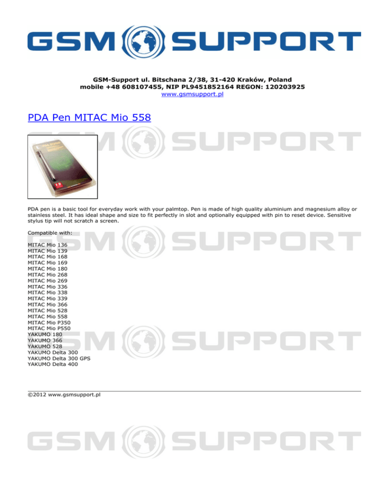 GSM-Support ul. Bitschana 2/38, 31-420 Kraków, Poland mobile +48 608107455, NIP PL9451852164 REGON: 120203925 www.gsmsupport.pl PDA Pen MITAC Mio 558 PDA pen is a basic tool for everyday work with your palmtop. Pen is made of high quality aluminium and magnesium alloy or stainless steel. It has ideal shape and size to fit perfectly in slot and optionally equipped with pin to reset device. Sensitive stylus tip will not scratch a screen. Compatible with: MITAC Mio 136 MITAC Mio 139 MITAC Mio 168 MITAC Mio 169 MITAC Mio 180 MITAC Mio 268 MITAC Mio 269 MITAC Mio 336 MITAC Mio 338 MITAC Mio 339 MITAC Mio 366 MITAC Mio 528 MITAC Mio 558 MITAC Mio P350 MITAC Mio P550 YAKUMO 180 YAKUMO 366 YAKUMO 528 YAKUMO Delta 300 YAKUMO Delta 300 GPS YAKUMO Delta 400 ©2012 www.gsmsupport.pl Powered by TCPDF (www.tcpdf.org)