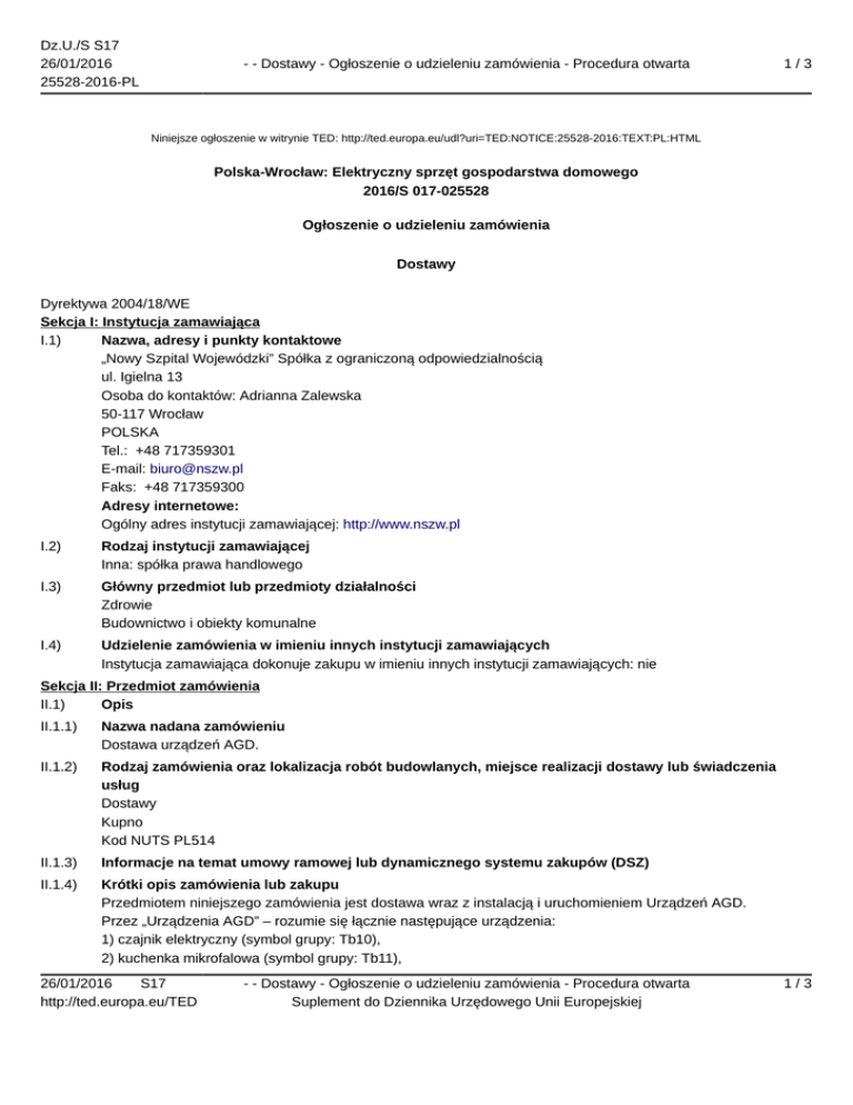 Dz.U./S S17 26/01/2016 25528-2016-PL - - Dostawy - Ogłoszenie o udzieleniu zamówienia - Procedura otwarta 1/3 Niniejsze ogłoszenie w witrynie TED: http://ted.europa.eu/udl?uri=TED:NOTICE:25528-2016:TEXT:PL:HTML Polska-Wrocław: Elektryczny sprzęt gospodarstwa domowego 2016/S 017-025528 Ogłoszenie o udzieleniu zamówienia Dostawy Dyrektywa 2004/18/WE Sekcja I: Instytucja zamawiająca I.1) Nazwa, adresy i punkty kontaktowe „Nowy Szpital Wojewódzki” Spółka z ograniczoną odpowiedzialnością ul. Igielna 13 Osoba do kontaktów: Adrianna Zalewska 50-117 Wrocław POLSKA Tel.: +48 717359301 E-mail: [email protected] Faks: +48 717359300 Adresy internetowe: Ogólny adres instytucji zamawiającej: http://www.nszw.pl I.2) Rodzaj instytucji zamawiającej Inna: spółka prawa handlowego I.3) Główny przedmiot lub przedmioty działalności Zdrowie Budownictwo i obiekty komunalne I.4) Udzielenie zamówienia w imieniu innych instytucji zamawiających Instytucja zamawiająca dokonuje zakupu w imieniu innych instytucji zamawiających: nie Sekcja II: Przedmiot zamówienia II.1) Opis II.1.1) Nazwa nadana zamówieniu Dostawa urządzeń AGD. II.1.2) Rodzaj zamówienia oraz lokalizacja robót budowlanych, miejsce realizacji dostawy lub świadczenia usług Dostawy Kupno Kod NUTS PL514 II.1.3) Informacje na temat umowy ramowej lub dynamicznego systemu zakupów (DSZ) II.1.4) Krótki opis zamówienia lub zakupu Przedmiotem niniejszego zamówienia jest dostawa wraz z instalacją i uruchomieniem Urządzeń AGD. Przez „Urządzenia AGD” – rozumie się łącznie następujące urządzenia: 1) czajnik elektryczny (symbol grupy: Tb10), 2) kuchenka mikrofalowa (symbol grupy: Tb11), 26/01/2016 S17 http://ted.europa.eu/TED - - Dostawy - Ogłoszenie o udzieleniu zamówienia - Procedura otwarta Suplement do Dziennika Urzędowego Unii Europejskiej 1/3 Dz.U./S S17 26/01/2016 25528-2016-PL - - Dostawy - Ogłoszenie o udzieleniu zamówienia - Procedura otwarta 2/3 3) ekspres wysokociśnieniowy (symbol grupy: Tb12), 4) kuchenka nastawna elektryczna (symbol grupy: KNE), wraz z wszystkimi częściami składowymi, wyposażeniem, itp. – zgodnie z parametrami technicznymi i eksploatacyjnymi zawartymi w załączniku nr 6 do SIWZ, a także w ilościach wskazanych w załączniku nr 6a do SIWZ. II.1.5) Wspólny Słownik Zamówień (CPV) 39710000 II.1.6) Informacje na temat Porozumienia w sprawie zamówień rządowych (GPA) Zamówienie jest objęte Porozumieniem w sprawie zamówień rządowych (GPA): nie II.2) Całkowita końcowa wartość zamówienia (zamówień) II.2.1) Całkowita końcowa wartość zamówienia (zamówień) Wartość: 43 492,80 PLN Łącznie z VAT. Stawka VAT (%) 23 Sekcja IV: Procedura IV.1) Rodzaj procedury IV.1.1) Rodzaj procedury Otwarta IV.2) Kryteria udzielenia zamówienia IV.2.1) Kryteria udzielenia zamówienia Oferta najkorzystniejsza ekonomicznie z uwzględnieniem kryteriów 1. Cena. Waga 80 2. Termin realizacji. Waga 10 3. Okres gwarancji. Waga 10 IV.2.2) Informacje na temat aukcji elektronicznej Wykorzystano aukcję elektroniczną: nie IV.3) Informacje administracyjne IV.3.1) Numer referencyjny nadany sprawie przez instytucję zamawiającą ZP/PN/36/2015 IV.3.2) Poprzednie publikacje dotyczące tego samego zamówienia Ogłoszenie o zamówieniu Numer ogłoszenia w Dz.U.: 2015/S 204-370235 z dnia 21.10.2015 Sekcja V: Udzielenie zamówienia V.1) Data decyzji o udzieleniu zamówienia: 5.1.2016 V.2) Informacje o ofertach Liczba otrzymanych ofert: 1 V.3) Nazwa i adres wykonawcy, na rzecz którego została wydana decyzja o udzieleniu zamówienia PHPU ZUBER Andrzej Zuber ul. Krakowska 29C 50-424 Wrocław POLSKA V.4) Informacje na temat wartości zamówienia 26/01/2016 S17 http://ted.europa.eu/TED - - Dostawy - Ogłoszenie o udzieleniu zamówienia - Procedura otwarta Suplement do Dziennika Urzędowego Unii Europejskiej 2/3 Dz.U./S S17 26/01/2016 25528-2016-PL - - Dostawy - Ogłoszenie o udzieleniu zamówienia - Procedura otwarta 3/3 Całkowita końcowa wartość zamówienia: Wartość: 43 492,80 PLN Łącznie z VAT. Stawka VAT (%) 23 V.5) Informacje na temat podwykonawstwa Przewidywane jest zlecenie podwykonawstwa w ramach zamówienia: nie Sekcja VI: Informacje uzupełniające VI.1) Informacje o funduszach Unii Europejskiej Zamówienie dotyczy projektu/programu finansowanego ze środków Unii Europejskiej: nie VI.2) Informacje dodatkowe: VI.3) Procedury odwoławcze VI.3.1) Organ odpowiedzialny za procedury odwoławcze Krajowa Izba Odwoławcza ul. Postępu 17A 02-676 Warszawa POLSKA E-mail: [email protected] Tel.: +48 224587801 Adres internetowy: http://www.uzp.gov.pl Faks: +48 224587800 VI.3.2) Składanie odwołań Dokładne informacje na temat terminów składania odwołań: 1. Odwołanie wnosi się w terminie 10 dni od dnia przesłania informacji o czynności Zamawiającego stanowiącej podstawę jego wniesienia – jeżeli zostały przesłane faksem lub drogą elektroniczną, albo w terminie 15 dni – jeżeli zostały przesłane pisemnie. 2. Odwołanie wobec treści ogłoszenia o zamówieniu, a także wobec postanowień SIWZ, wnosi się w terminie 10 dni od dnia publikacji ogłoszenia w Dzienniku Urzędowym Unii Europejskiej lub zamieszczenia SIWZ na stronie internetowej. 3. Odwołanie wobec czynności innych niż określone w pkt. 1 i 2 powyżej wnosi się w terminie 10 dni od dnia, w którym powzięto lub przy zachowaniu należytej staranności można było powziąć wiadomość o okolicznościach stanowiących podstawę jego wniesienia. VI.3.3) Źródło, gdzie można uzyskać informacje na temat składania odwołań Krajowa Izba Odwoławcza ul. Postępu 17A 02-676 Warszawa POLSKA E-mail: [email protected] Tel.: +48 224587801 Adres internetowy: http://www.uzp.gov.pl Faks: +48 224587800 VI.4) Data wysłania niniejszego ogłoszenia: 21.1.2016 26/01/2016 S17 http://ted.europa.eu/TED - - Dostawy - Ogłoszenie o udzieleniu zamówienia - Procedura otwarta Suplement do Dziennika Urzędowego Unii Euro