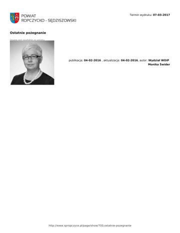 Termin wydruku: 07-03-2017 Ostatnie pożegnanie Image not readable or empty nekr3 ../../../files/redactor/source/nekr3.jpg publikacja: 04-02-2016 , aktualizacja: 04-02-2016, autor: Wydział WOiP Monika Świder http://www.spropczyce.pl/page/show/700,ostatnie-pozegnanie