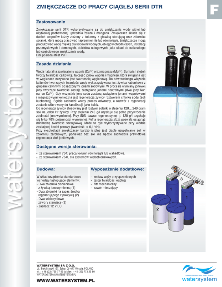 F ZMIĘKCZACZE DO PRACY CIĄGŁEJ SERII DTR Zastosowanie Zmiękczacze serii DTR wykorzystywane są do zmiękczania wody pitnej lub użytkowej pozbawionej uprzednio żelaza i manganu. Zmiękczacz składa się z dwóch zespołów każdy złożony z kolumny z głowicą sterującą oraz zbiornika solanki, które mogą pracować naprzemiennie lub równolegle. Zmiękczacze mogą produkować wodę miękką dla kotłowni wodnych, obiegów chłodniczych, instalacji przemysłowych i domowych, obiektów usługowych, jako układ do całkowitego lub częściowego zmiękczania wody. Filtr posiada atest PZH Zasada działania Woda naturalna zawiera jony wapnia (Ca2+) oraz magnezu (Mg2+). Suma ich stężeń tworzy twardość całkowitą. Ta część jonów wapnia i magnezu, która związana jest w węglanach nazywana jest twardością węglanową. Do odwracalnego wiązania kationów tworzących twardość wody wykorzystywana jest żywica kationitowa z grupami czynnymi obsadzonymi jonami sodowymi. W procesie wymiany jonowej jony tworzące twardość zostają zastąpione jonami neutralnymi (dwa jony Na+ na jon Ca2+). Gdy wszystkie jony sodu zostaną zastąpione jonami wapniowymi i magnezowymi konieczna jest regeneracja żywicy roztworem chlorku sodu (soli kuchennej). Będzie zachodził wtedy proces odwrotny, a roztwór z regeneracji zostanie skierowany do kanalizacji, jako ściek. Do regeneracji żywicy stosowany jest roztwór solanki o stężeniu 120…240 gram soli na jeden litr żywicy. Przy stężeniu 240 g/l uzyskuje się pełne przywrócenie zdolności jonowymiennej. Przy 50% dawce regeneracyjnej tj. 120 g/l uzyskuje się tylko 70% pojemności wymiennej. Pełna regeneracja złoża pozwala osiągnąć minimalną twardość szczątkową. Może to być wykorzystywane przy wodzie zasilającej kocioł parowy (twardość < 0,1°dH). Przy eksploatacji zmiękczaczy bardzo istotne jest ciągłe uzupełnianie soli w zbiorniku zarobowym, ponieważ bez soli nie będzie zachodziła prawidłowa regeneracja złóż jonitowych. Dostępne wersje sterowania: - ze sterownikiem 764; praca kolumn równoległa lub wahadłowa, - ze sterownikiem 764L dla systemów wielozbiornikowych. Budowa: Wyposażenie dodatkowe: W skład urządzenia standardowo wchodzą następujące elementy: - Dwa zbiorniki ciśnieniowe z żywicą jonowymienną (1) - Dwa zbiorniki na zapas środka regenerującego z pokrywą (2) - Dwa wielocyklowe zawory sterujące (3) - Zasilacz 12 V DC. - zestaw węży przyłączeniowych - tester twardości ogólnej - filtr mechaniczny - zawór mieszający 3 1 1 2 2 ZMIĘKCZACZE DO PRACY CIĄGŁEJ SERII DTR Typ Jedn. DTR 0707 DTR 0812 DTR 1017 DTR 1022 DTR 1230 DTR 1330 DTR 1330A Przepływ max. przy twardości<0,1od* m3/h 0,7 (1,4)* 1,2 (2,4)* 1,7 (3,4)* 2,2 (4,4)* 3,0 (6,0)* 3,0 (6,0)* 3,0 (6,0)* Zdolność jonowymienna d×m3 42 74 106 138 202 234 304 l 2x15 2x25 2x35 2x45 2x65 2x75 2x95 Spadek ciśnienia bar 0,2 0,3 0,4 0,6 1,0 0,9 1,0 Średnie zużycie soli na regenerację kg 2,0 2,6 4,0 5,0 7,4 8,2 9,0 Wysokość całkowita (C) cm 108 130 130 155 155 155 183 Szerokość całkowita (A) cm 145 145 177 177 187 205 210 Głębokość (B) cm 140 140 168 o Ilość złoża 56 Wysokość przyłączy (D) cm Średnica nominalna przył. DN Pojemność zbiornika solanki dm3 85 85 85 85 140 140 140 Ciężar transportowy kg 48 72 84 102 139 165 238 Ciśnienie pracy bar Max. temperatura wody 93 117 117 140 25 2,5 do 8 C 38 V/Hz 230/50 Napięcie pracy V 12 Pobór mocy W 3 o Zasilanie *podczas regeneracji jednej z kolumn przepływ o połowę mniejszy. Zakres dostawy akres dostawy obejmuje kompletne urządzenie zmiękczające złożone z dwóch kompletów z których każdy składa się ze zbiornika ciśnieniowego wypełnionego żywicą kationitową, zaworu wielocyklowego ze sterownikiem oraz zbiornika solanki. Filtry dobierane są indywidualnie w zależności od składu wody zasilającej oraz przeznaczenia wody uzdatnionej. Materiały eksploatacyjne sól (chlorek sodowy NaCl) w tabletkach lub brykietach dostępna w workach 25 kg. Zalecenia montażowe Urządzenia wykonane z tworzywa sztucznego posiadają dobrą odporność antykorozyjną. Zastosowany materiał wymaga jednak, aby temperatura wody i otoczenia była w zakresie 10…38 °C. Urządzenie powinno być ustawione na równym, utwardzonym podłożu. Doprowadzenie wody zasilającej i uzdatnionej należy wykonać z rur PP, PVC o średnicach dopasowanych do wydajności urządzenia. Przyłącza powinny być tak wykonane, aby wyeliminować naprężenia rurociągów prowadzące do nieszczelności i usterek. Maksymalne ciśnienie robocze nie może przekraczać 6 bar. W przypadku występowania w instalacji ciśnienia pow. 6 bar, należy przed urządzeniem zainstalować zawór bezpieczeństwa lub reduktor ciśnienia. Przed i za urządzeniem zaleca się wykonanie zaworów odcinających, manometrów oraz kurka probierczego do poboru próbek wody. Należy również zainstalować śrubunki lub holendry, aby umożliwić łatwy demontaż urządzenia.. Woda z regeneracji powinna być poprowadzona do kanalizacji ( odpływu kratki ściekowej ) przez przerwę powietrzną. Przykładowy schemat instalacji Wymiary gabarytowe MANOMETR WEJŚCIE WYJŚCIE POBÓR PRÓBEK POBÓR PRÓBEK ŚCIEKI ŚCIEKI