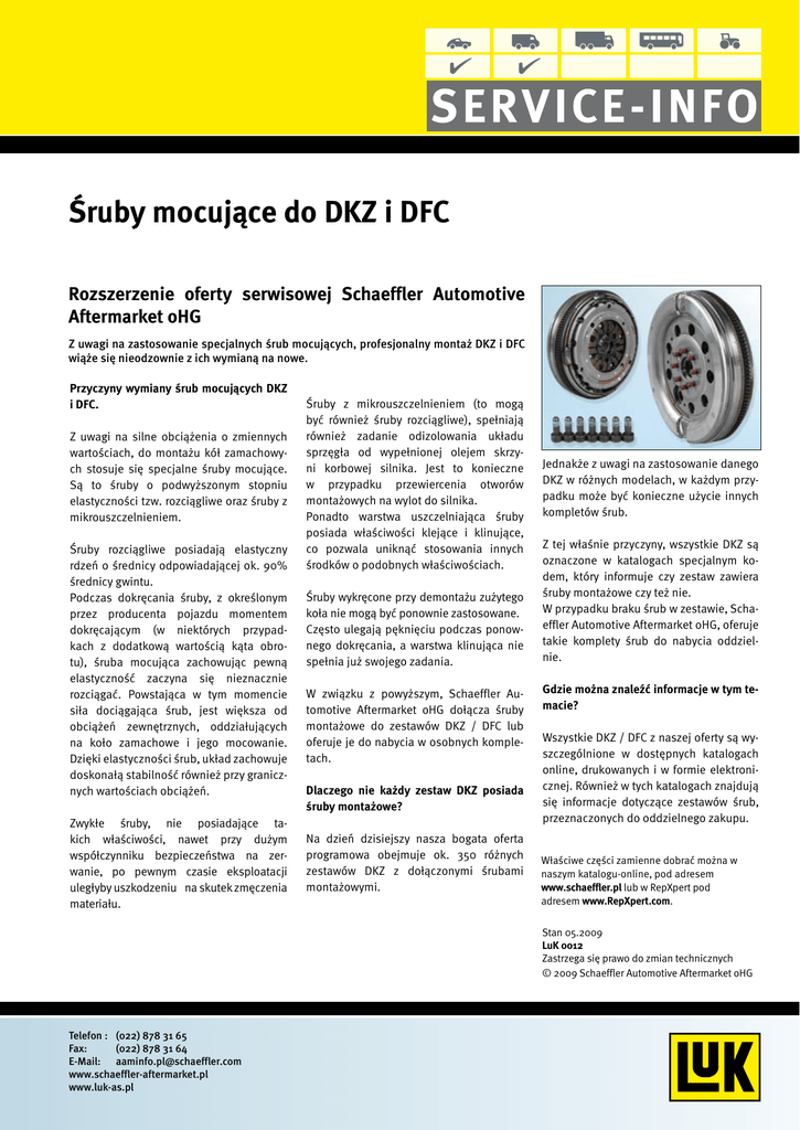 Śruby mocujące do DKZ i DFC Rozszerzenie oferty serwisowej Schaeffler Automotive Aftermarket oHG Z uwagi na zastosowanie specjalnych śrub mocujących, profesjonalny montaż DKZ i DFC wiąże się nieodzownie z ich wymianą na nowe. Przyczyny wymiany śrub mocujących DKZ i DFC. Z uwagi na silne obciążenia o zmiennych wartościach, do montażu kół zamachowych stosuje się specjalne śruby mocujące. Są to śruby o podwyższonym stopniu elastyczności tzw. rozciągliwe oraz śruby z mikrouszczelnieniem. Śruby rozciągliwe posiadają elastyczny rdzeń o średnicy odpowiadającej ok. 90% średnicy gwintu. Podczas dokręcania śruby, z określonym przez producenta pojazdu momentem dokręcającym (w niektórych przypadkach z dodatkową wartością kąta obrotu), śruba mocująca zachowując pewną elastyczność zaczyna się nieznacznie rozciągać. Powstająca w tym momencie siła dociągająca śrub, jest większa od obciążeń zewnętrznych, oddziałujących na koło zamachowe i jego mocowanie. Dzięki elastyczności śrub, układ zachowuje doskonałą stabilność również przy granicznych wartościach obciążeń. Zwykłe śruby, nie posiadające takich właściwości, nawet przy dużym współczynniku bezpieczeństwa na zerwanie, po pewnym czasie eksploatacji uległyby uszkodzeniu na skutek zmęczenia materiału. Śruby z mikrouszczelnieniem (to mogą być również śruby rozciągliwe), spełniają również zadanie odizolowania układu sprzęgła od wypełnionej olejem skrzyni korbowej silnika. Jest to konieczne w przypadku przewiercenia otworów montażowych na wylot do silnika. Ponadto warstwa uszczelniająca śruby posiada właściwości klejące i klinujące, co pozwala uniknąć stosowania innych środków o podobnych właściwościach. Śruby wykręcone przy demontażu zużytego koła nie mogą być ponownie zastosowane. Często ulegają pęknięciu podczas ponownego dokręcania, a warstwa klinująca nie spełnia już swojego zadania. W związku z powyższym, Schaeffler Automotive Aftermarket oHG dołącza śruby montażowe do zestawów DKZ / DFC lub oferuje je do nabycia w osobnych kompletach. Dlaczego nie każdy zestaw DKZ posiada śruby montażowe? Na dzień dzisiejszy nasza bogata oferta programowa obejmuje ok. 350 różnych zestawów DKZ z dołączonymi śrubami montażowymi. Jednakże z uwagi na zastosowanie danego DKZ w różnych modelach, w każdym przypadku może być konieczne użycie innych kompletów śrub. Z tej właśnie przyczyny, wszystkie DKZ są oznaczone w katalogach specjalnym kodem, który informuje czy zestaw zawiera śruby montażowe czy też nie. W przypadku braku śrub w zestawie, Schaeffler Automotive Aftermarket oHG, oferuje takie komplety śrub do nabycia oddzielnie. Gdzie można znaleźć informacje w tym temacie? Wszystkie DKZ / DFC z naszej oferty są wyszczególnione w dostępnych katalogach online, drukowanych i w formie elektronicznej. Również w tych katalogach znajdują się informacje dotyczące zestawów śrub, przeznaczonych do oddzielnego zakupu. Właściwe części zamienne dobrać można w naszym katalogu-online, pod adresem www.schaeffler.pl lub w RepXpert pod adresem www.RepXpert.com. Stan 05.2009 LuK 0012 Zastrzega się prawo do zmian technicznych © 2009 Schaeffler Automotive Aftermarket oHG Telefon : (022) 878 31 65 Fax: (022) 878 31 64 E-Mail: [email protected] www.schaeffler-aftermarket.pl www.luk-as.pl