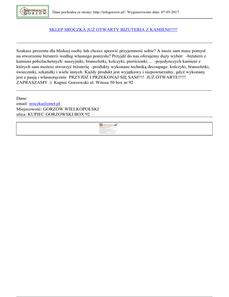 Dane pochodzą ze strony: http://infogorzow.pl/. Wygenerowano dnia: 07-03-2017. SKLEP SROCZKA JUŻ OTWARTY BIZUTERIA Z KAMIENI!!!!! Szukasz prezentu dla bliskiej osoby lub chcesz sprawić przyjemność sobie? A może sam masz pomysł na stworzenie biżuterii według własnego pomysłu? Przyjdź do nas oferujemy duży wybór: -biżuterii z kamieni półszlachetnych: naszyjniki, bransoletki, kolczyki, pierścionki.... -pojedynczych kamieni z których sam możesz stworzyć biżuterię -produkty wykonane techniką decoupage: kolczyki, bransoletki, świeczniki, szkatułki i wiele innych Każdy produkt jest wyjątkowy i niepowtarzalny, gdyż wykonany jest z pasją i własnoręcznie PRZYJDŹ I PRZEKONAJ SIĘ SAM!!!! JUŻ OTWARTE!!!!! ZAPRASZAMY :) Kupiec Gorzowski ul. Witosa 50 box nr 92 Dane: email: [email protected] Miejscowość: GORZÓW WIELKOPOLSKI ulica: KUPIEC GORZOWSKI BOX 92